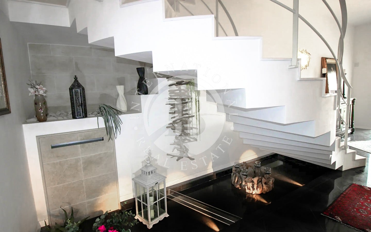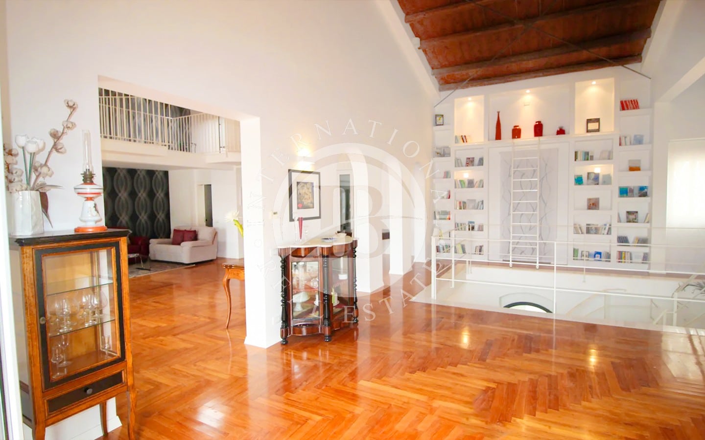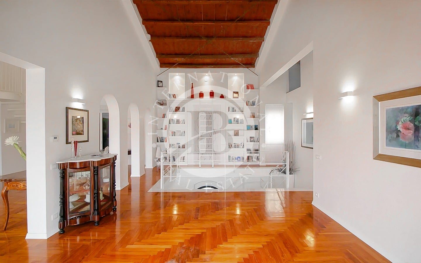 Primo piano: L'accesso avviene tramite una incantevole scalinata in marmo bianco che conduce a un'ampia zona giorno caratterizzata da pavimenti in parquet e soffitto con travi in legno. Questo ambiente è diviso in vari spazi, tra cui una biblioteca, una cantina vini, e una zona pranzo-relax con annesso servizio.
