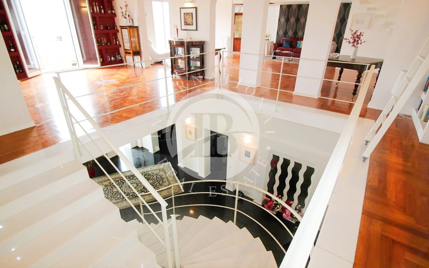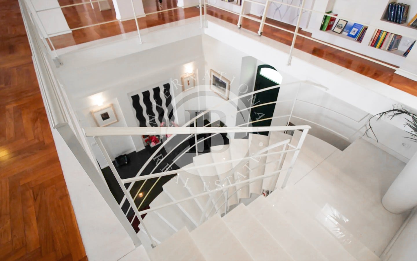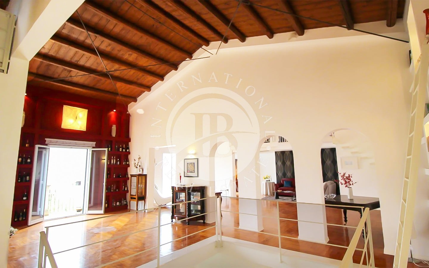 Primo piano: L'accesso avviene tramite una incantevole scalinata in marmo bianco che conduce a un'ampia zona giorno caratterizzata da pavimenti in parquet e soffitto con travi in legno. Questo ambiente è diviso in vari spazi, tra cui una biblioteca, una cantina vini, e una zona pranzo-relax con annesso servizio.