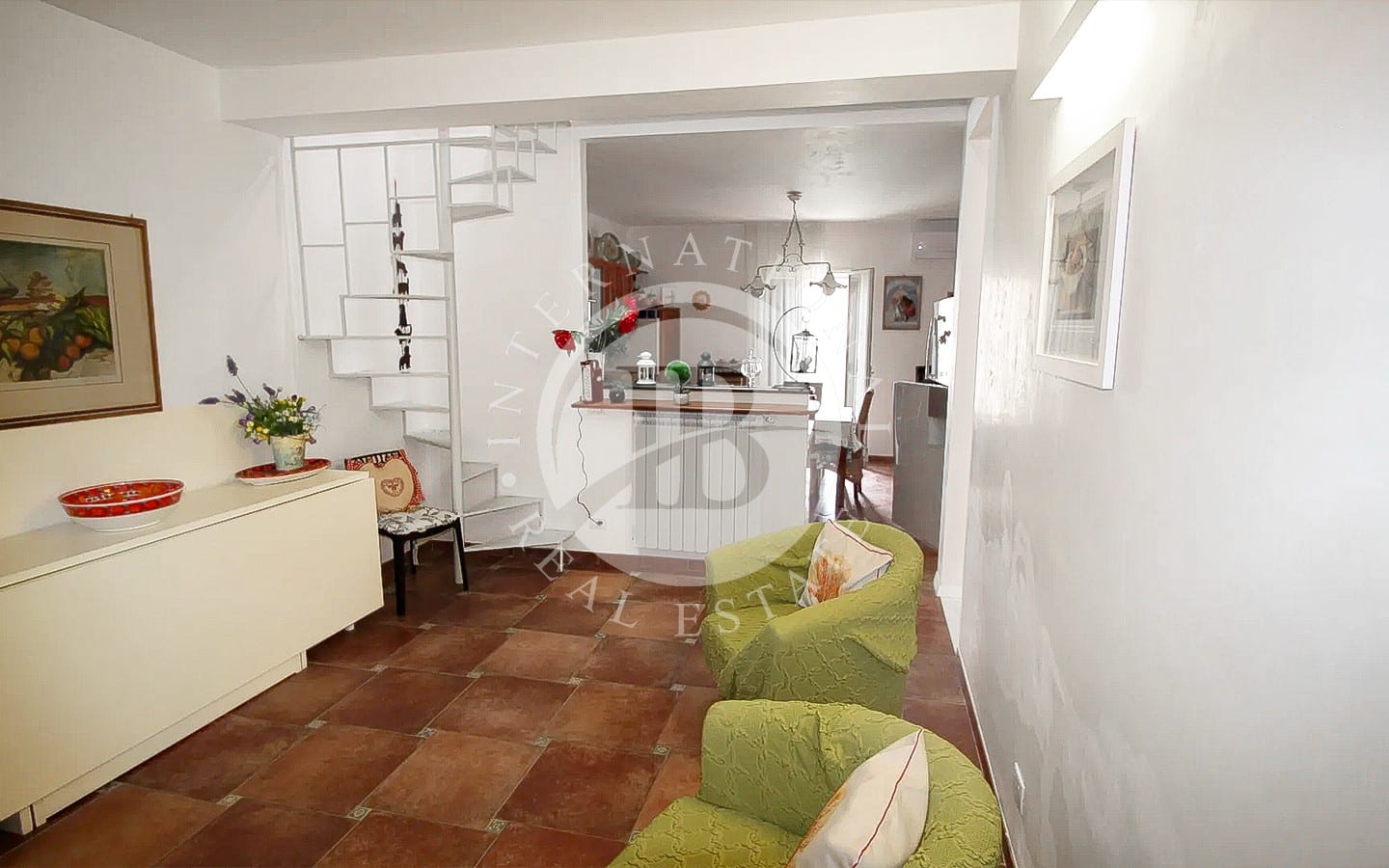 Sempre al primo piano, troviamo una cucina in muratura elegante e un accogliente soggiorno perfetto per momenti di convivialità.