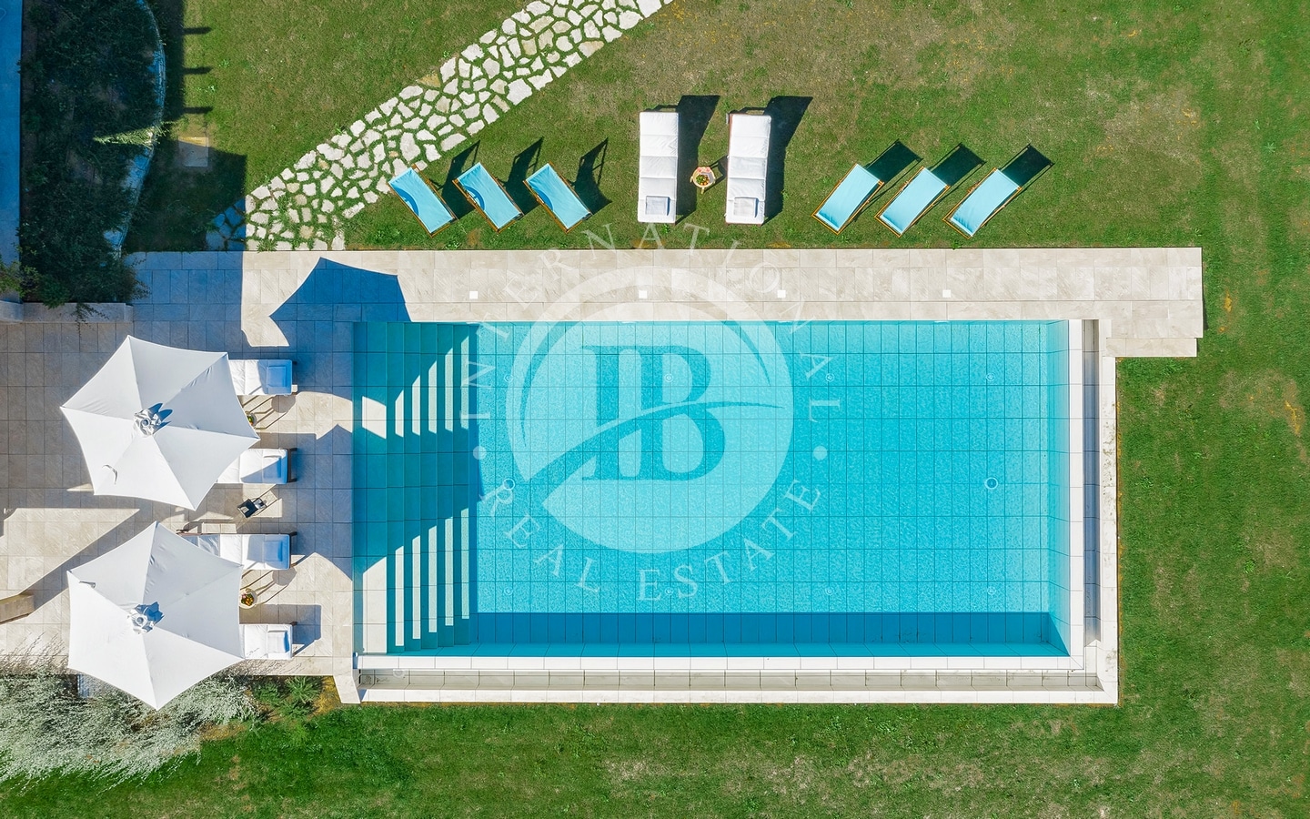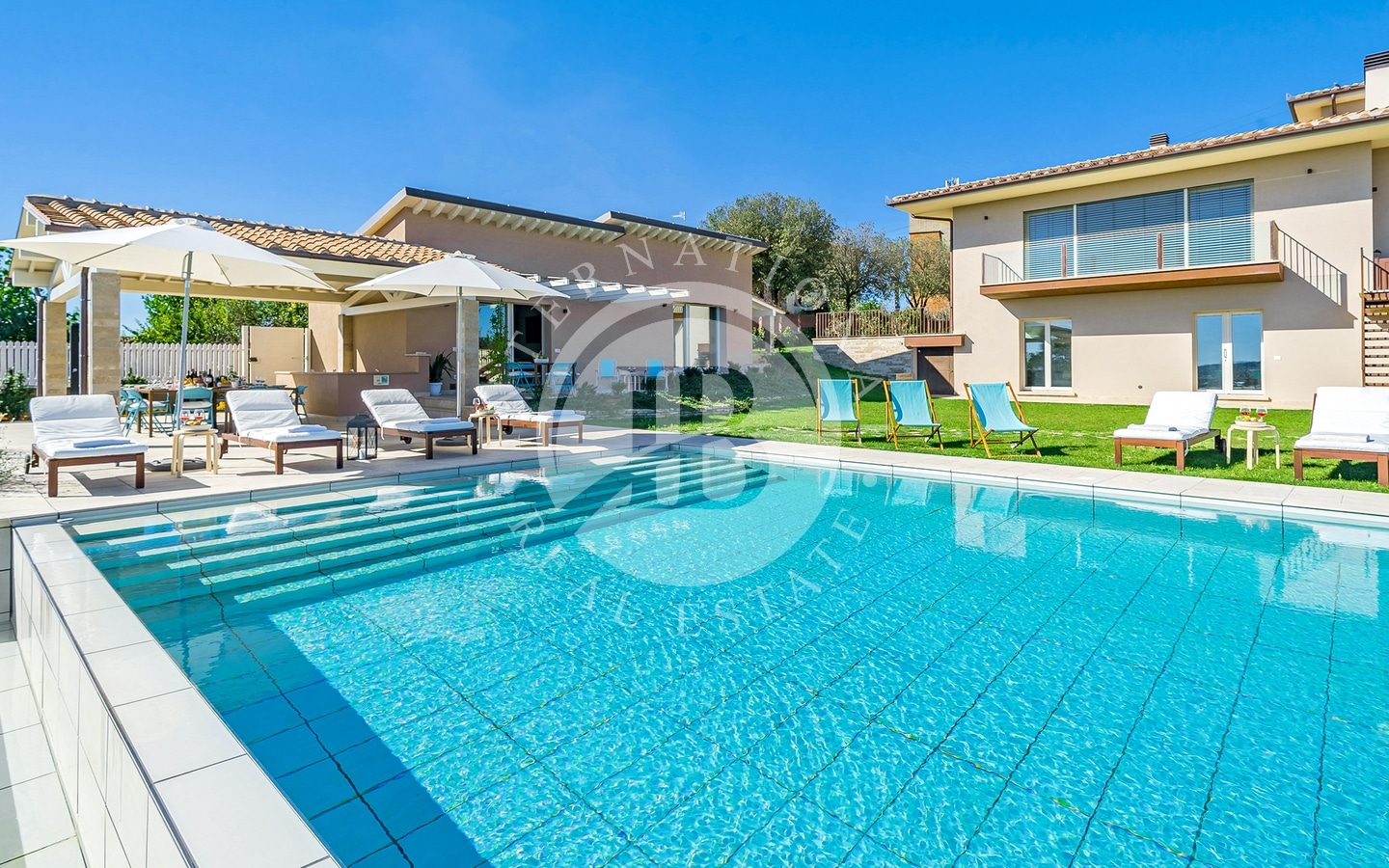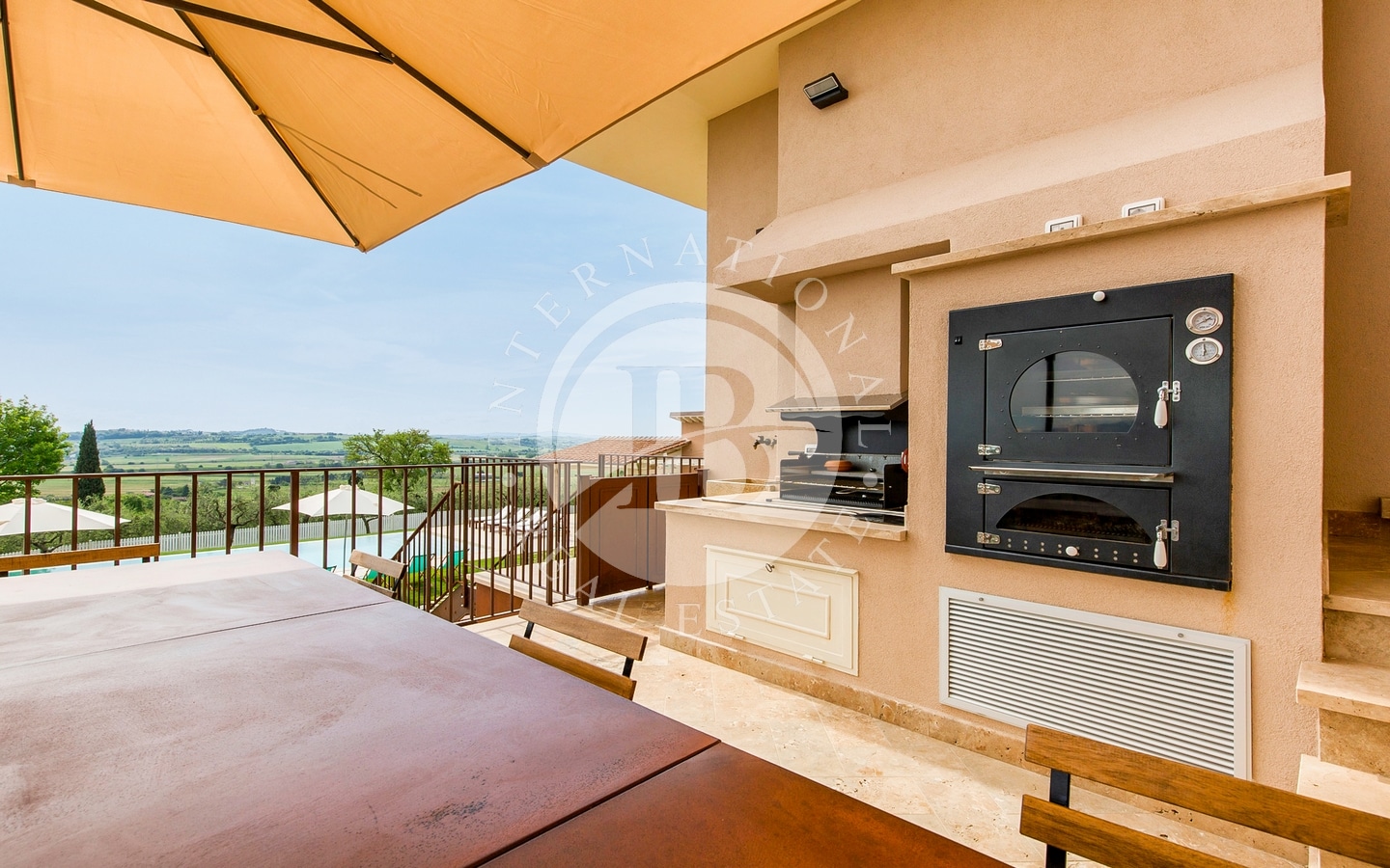 La piscina a sfioro e tracimazione, riscaldata e progettata con materiali antiscivolo, è un capolavoro contemporaneo, perfettamente integrato nel paesaggio. Ampie aree esterne, tra cui patii e zone barbecue con forno a legna, offrono spazi ideali per pranzi e cene all’aperto. Dalla terrazza e dai giardini si gode di una vista spettacolare che si estende fino a 80 km, regalando tramonti indimenticabili e un contatto diretto con la bellezza della campagna toscana.
