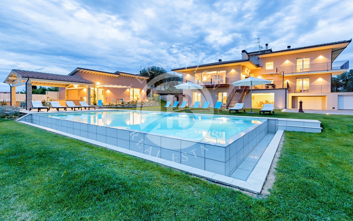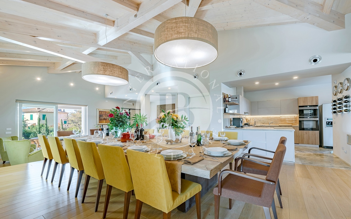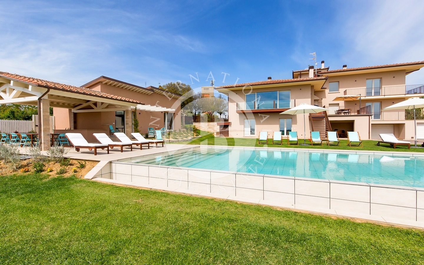 La piscina a sfioro e tracimazione, riscaldata e progettata con materiali antiscivolo, è un capolavoro contemporaneo, perfettamente integrato nel paesaggio. Ampie aree esterne, tra cui patii e zone barbecue con forno a legna, offrono spazi ideali per pranzi e cene all’aperto. Dalla terrazza e dai giardini si gode di una vista spettacolare che si estende fino a 80 km, regalando tramonti indimenticabili e un contatto diretto con la bellezza della campagna toscana.