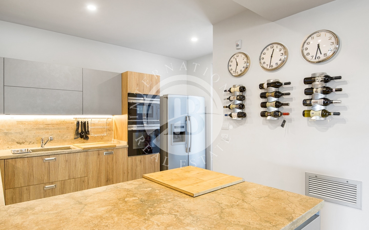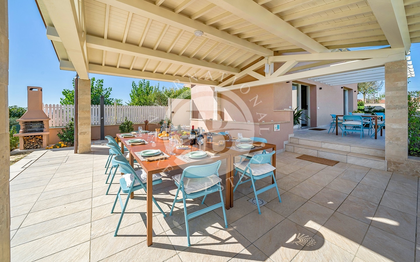 La villa si sviluppa su 465 mq di spazi interni, studiati per il massimo comfort e arricchiti da dettagli di pregio. Le sette camere da letto, ciascuna con bagno privato rifinito in travertino naturale, sono un rifugio di lusso. Le quattro cucine attrezzate, perfette per ogni occasione, completano un’offerta unica per chi ama la convivialità. Materiali come il legno di rovere massello e arredi su misura artigianali conferiscono calore e raffinatezza agli spazi, che includono anche saloni luminosi, un'area relax con sauna e cromoterapia, e un soggiorno principale che rappresenta il cuore della villa.