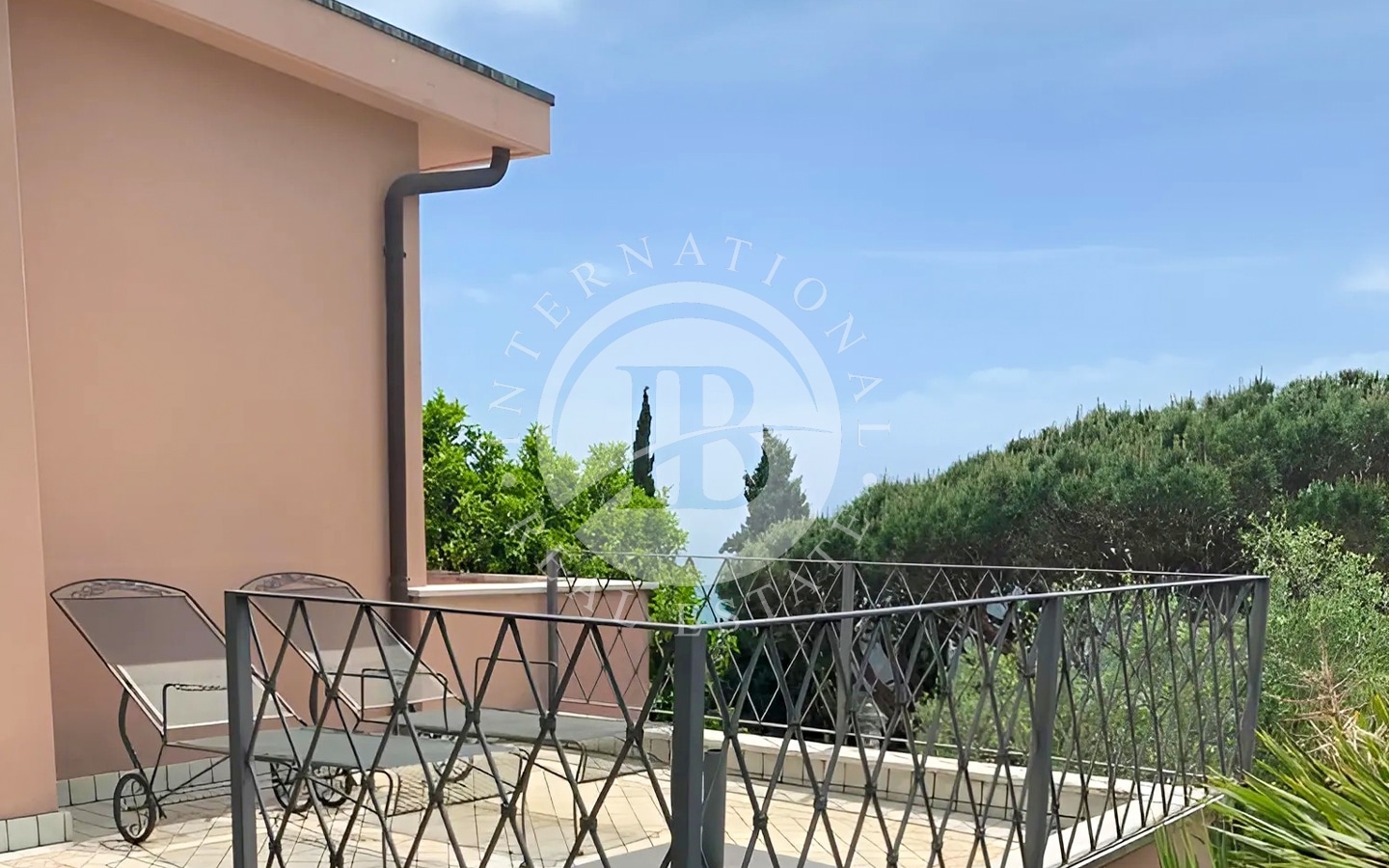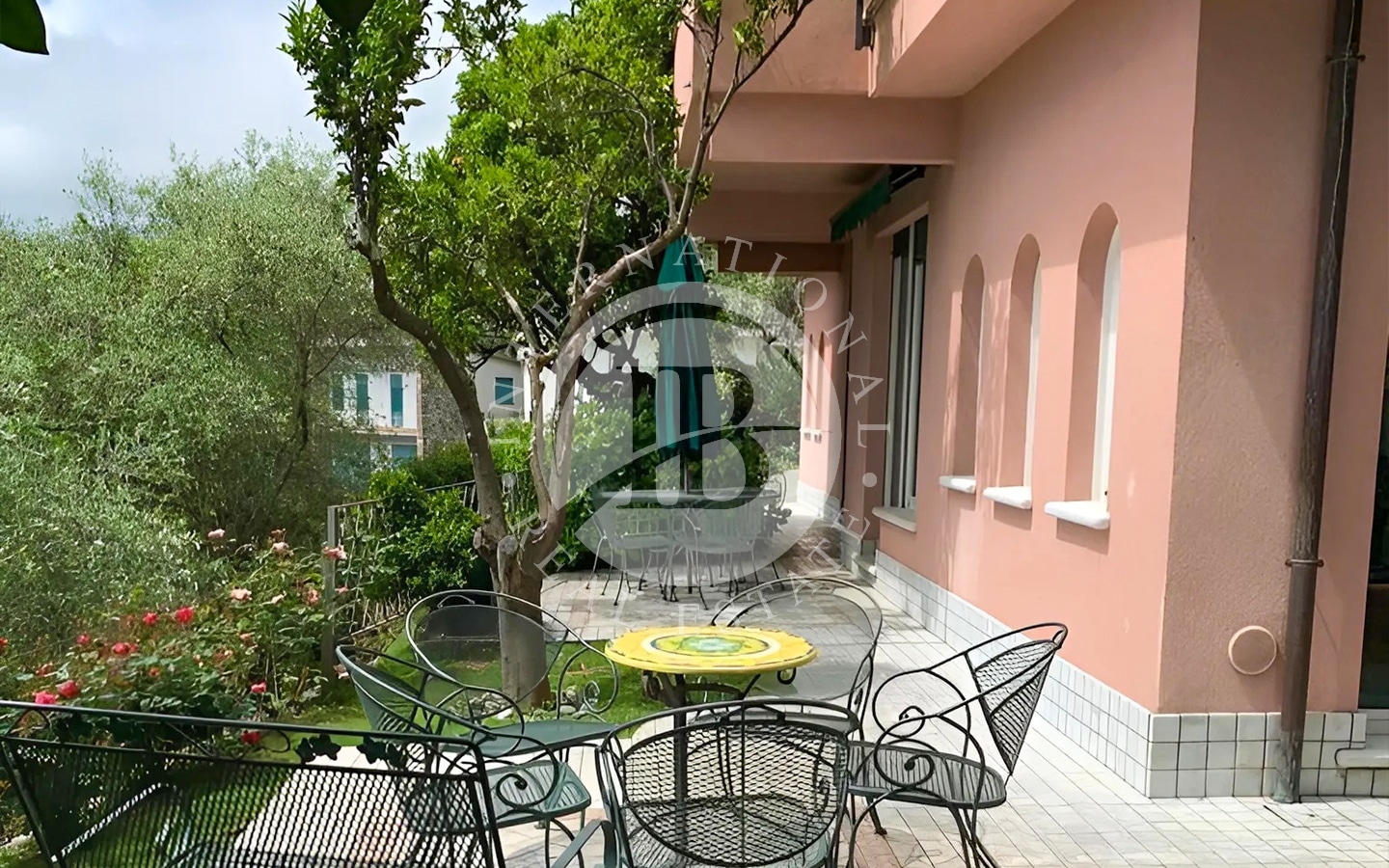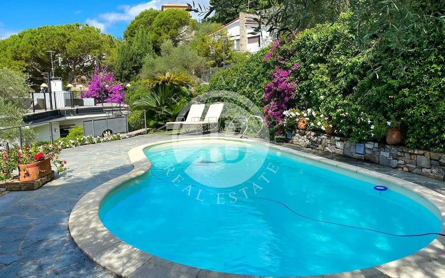 Il giardino, di 450 mq, arricchito da alberi di ulivo e arancio, è impreziosito da una piscina. L'area esterna comprende anche numerose zone relax, ideali per godere del clima mite della Riviera Ligure e della vista panoramica.