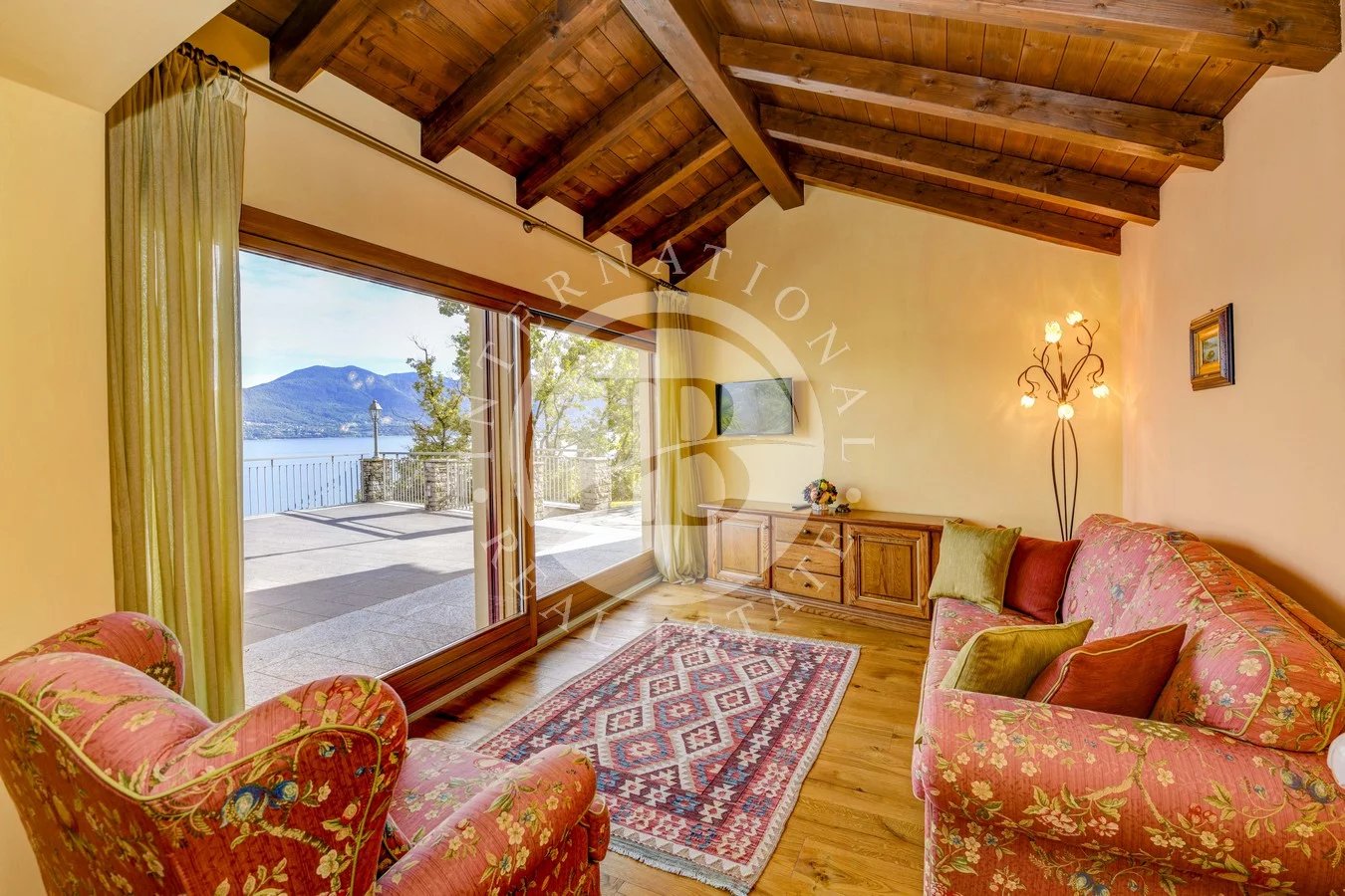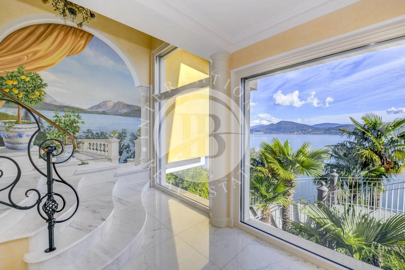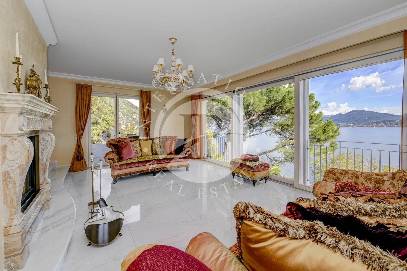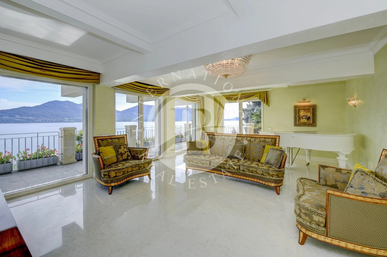 I pavimenti sono in Marmo di Carrara e in legno intarsiato con profili geometrici, i bagni con ceramiche ed accessori speciali, pareti e soffitti in gesso con modanature che accolgono corpi illuminanti, riscaldamento a pavimento con integrazione di pannelli solari. L’impianto di illuminazione è stato studiato per dare grande efficacia e risalto ad ogni ambiente. La veranda, accorpata alla zona giorno, ha soffitti e pareti in vetro camera. Le signorili sedute consentono durante il pranzo di affacciarsi sul lago Maggiore e sul parco circostante.