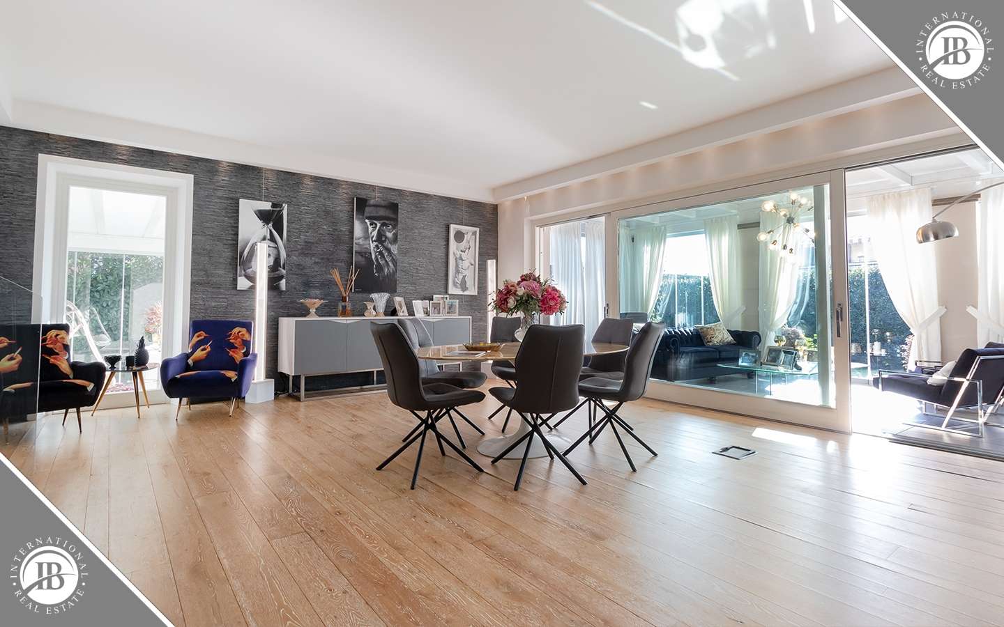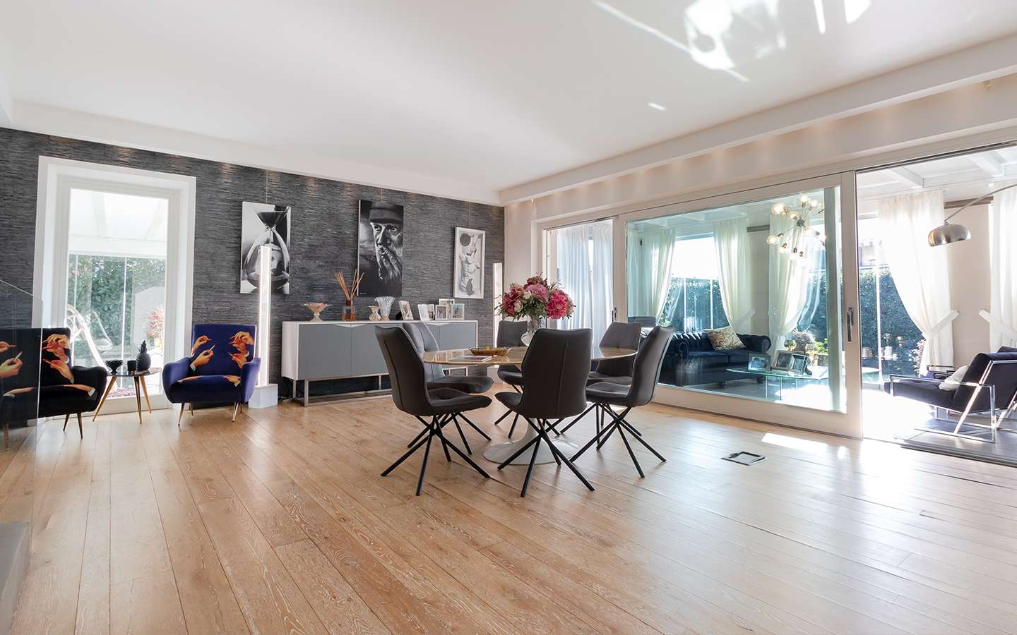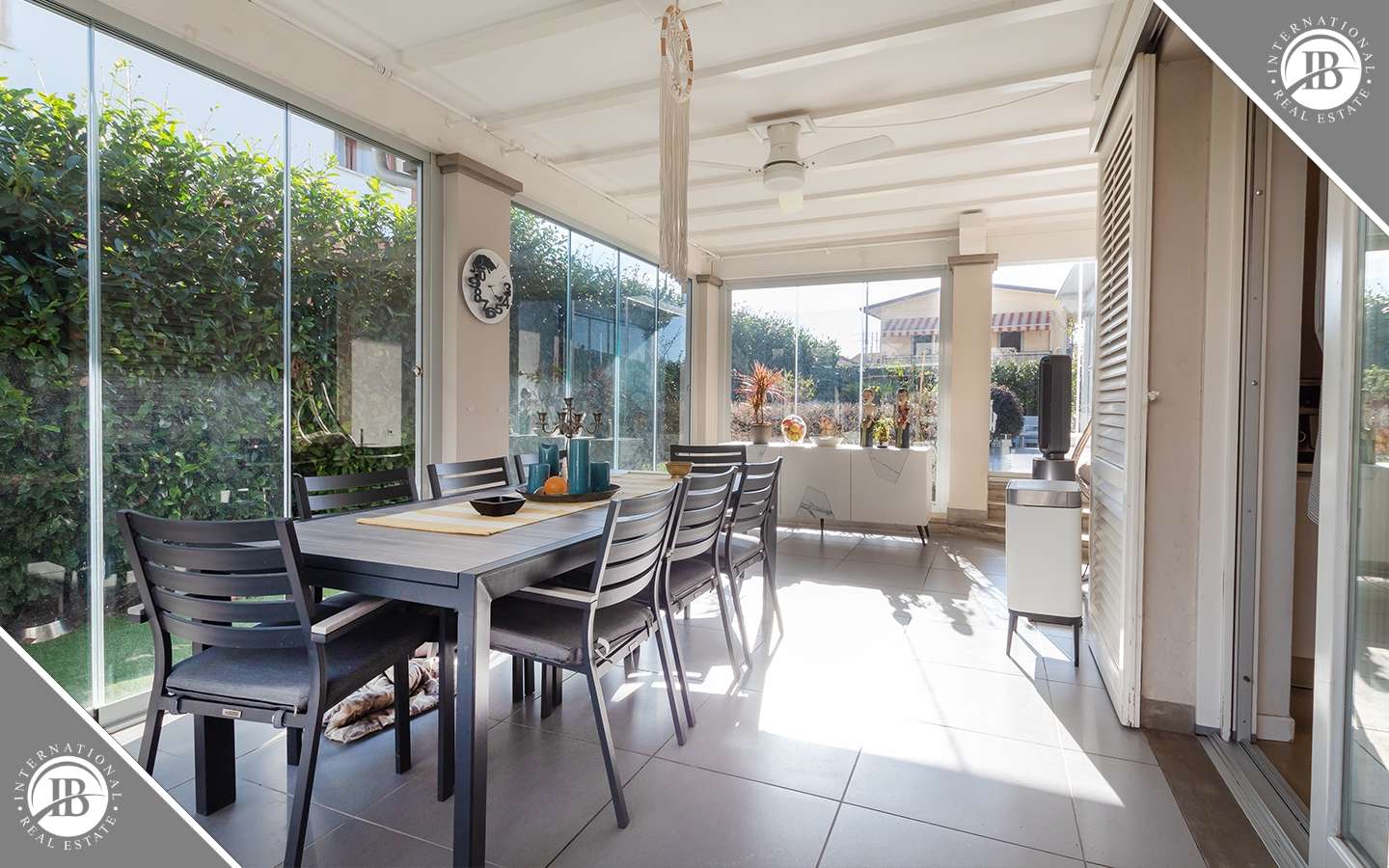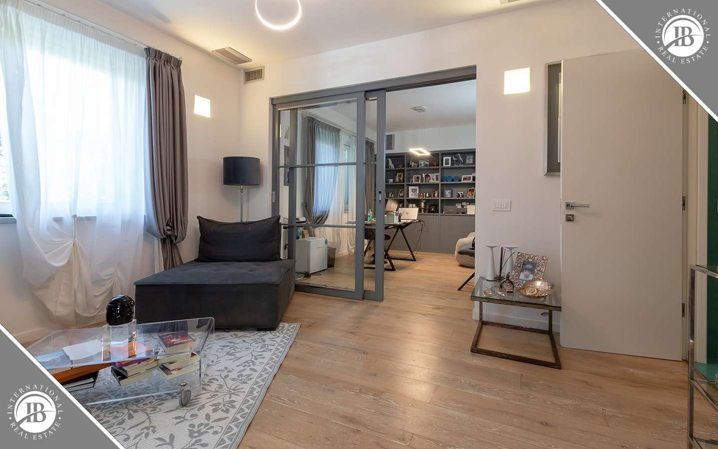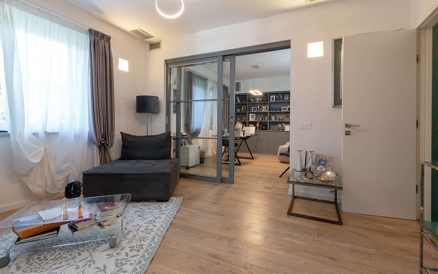 L'ingresso principale conduce a un ampio salone caratterizzato da un camino imponente, che aggiunge un tocco di calore e ospitalità. Le vetrate removibili, scorrevoli, creano una sinergia perfetta tra gli spazi interni ed esterni, garantendo una luminosità senza pari. La cucina su misura, adiacente al salone, è un capolavoro di design e funzionalità. Al piano terra, uno studio con bagno privato offre un'area di lavoro tranquilla e riservata, mentre una seconda camera con accesso indipendente completa l'offerta di comfort.