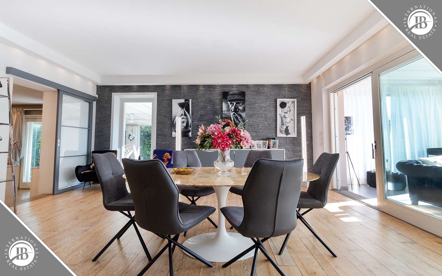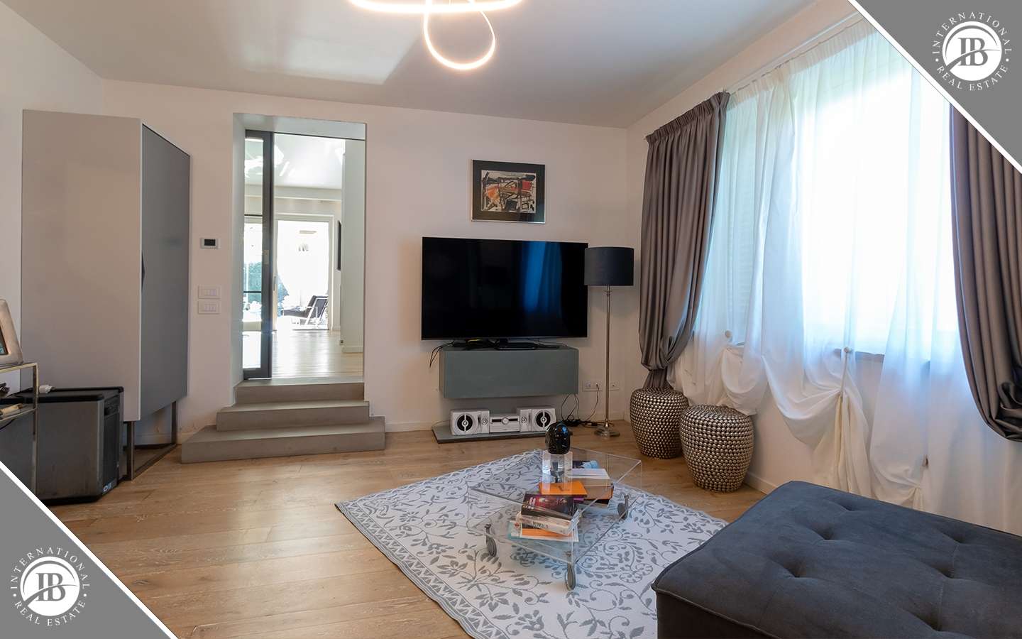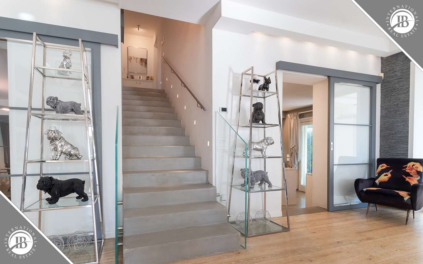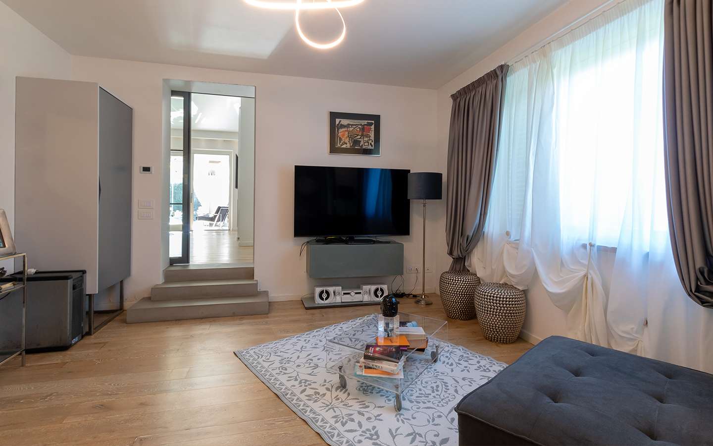 L'ingresso principale conduce a un ampio salone caratterizzato da un camino imponente, che aggiunge un tocco di calore e ospitalità. Le vetrate removibili, scorrevoli, creano una sinergia perfetta tra gli spazi interni ed esterni, garantendo una luminosità senza pari. La cucina su misura, adiacente al salone, è un capolavoro di design e funzionalità. Al piano terra, uno studio con bagno privato offre un'area di lavoro tranquilla e riservata, mentre una seconda camera con accesso indipendente completa l'offerta di comfort.