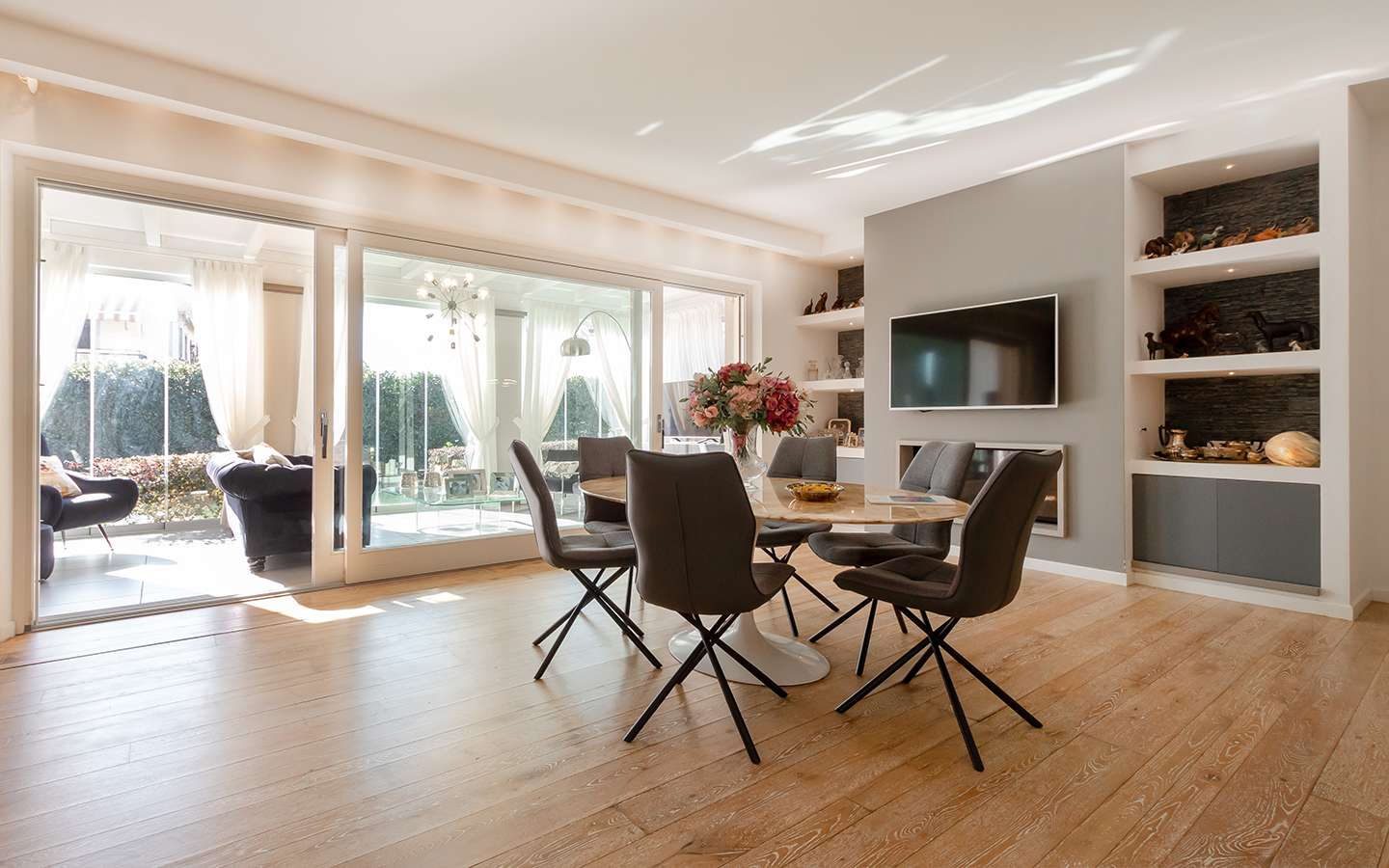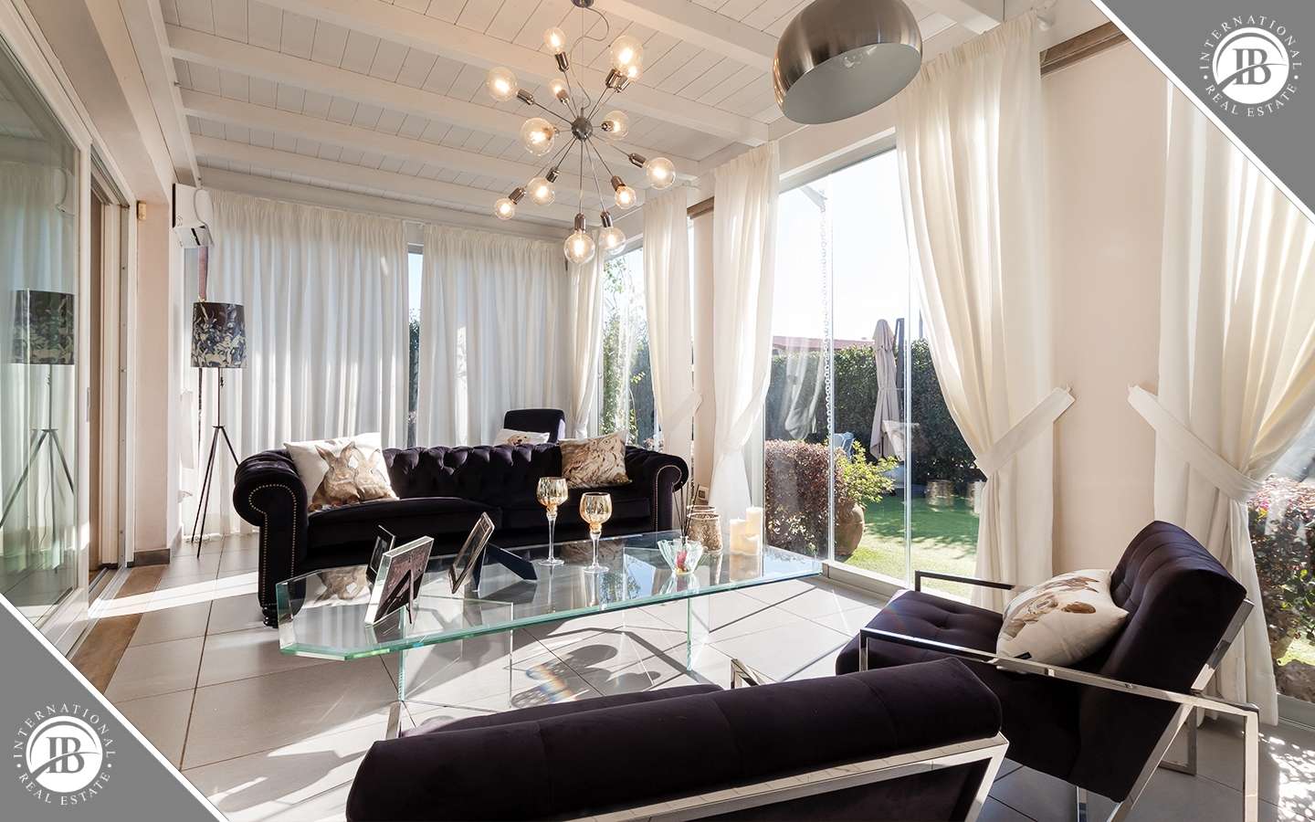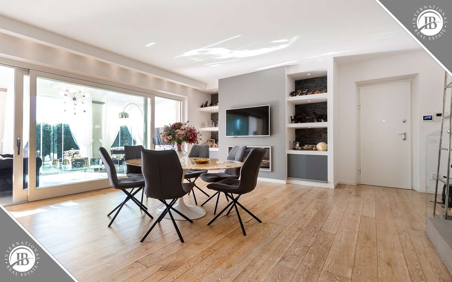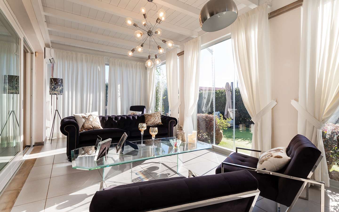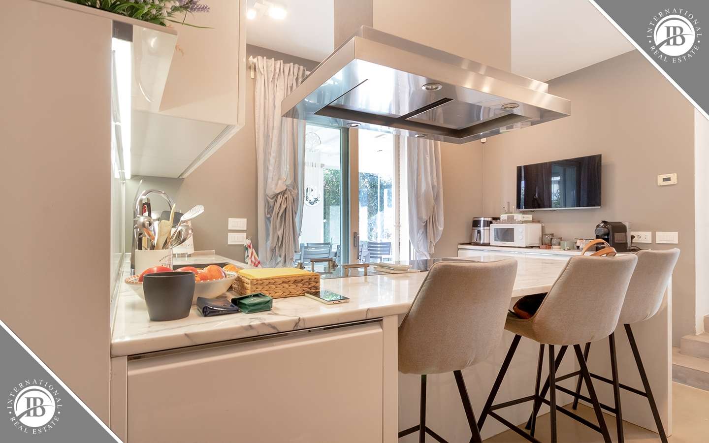 L'ingresso principale conduce a un ampio salone caratterizzato da un camino imponente, che aggiunge un tocco di calore e ospitalità. Le vetrate removibili, scorrevoli, creano una sinergia perfetta tra gli spazi interni ed esterni, garantendo una luminosità senza pari. La cucina su misura, adiacente al salone, è un capolavoro di design e funzionalità. Al piano terra, uno studio con bagno privato offre un'area di lavoro tranquilla e riservata, mentre una seconda camera con accesso indipendente completa l'offerta di comfort.