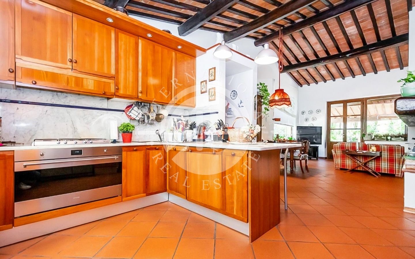 Una scala in legno conduce ai livelli superiori: al mezzanino, un bagno per gli ospiti; al primo piano, quattro raffinate camere da letto ciascuna con bagno privato, oltre a un soggiorno dall’atmosfera intima. Al secondo piano, si trovano un ulteriore soggiorno, una camera da letto aggiuntiva e un pratico caveau. Il piano seminterrato ospita una cantina per la conservazione di vini pregiati, una lavanderia e un ampio garage.Il giardino che circonda la villa è un vero angolo di paradiso, arricchito da una maestosa piscina di 18x8,5 metri, perfetta per godere di momenti di relax all’aperto. Una dependance di 100 mq offre spazi versatili con soggiorno, cucina, due camere da letto e due bagni, perfetta per accogliere ospiti in totale privacy. A completare gli spazi esterni, un annesso ospita una palestra attrezzata e locali di deposito, mentre un ulteriore fabbricato funge da garage coperto. Il lago privato, incastonato nel verde, aggiunge un tocco di unicità e serenità a questa proprietà da sogno.La villa si distingue per le sue finiture di pregio, la qualità dei materiali utilizzati e gli ampi spazi dedicati al benessere e alla praticità. Il riscaldamento a caldaia garantisce comfort durante tutto l’anno, mentre la presenza di una lavanderia e di una cantina con accesso interno facilita la gestione della proprietà. La piscina e la palestra offrono molteplici opzioni di svago, creando una vera oasi di relax e lusso. Completa la villa un ampio spazio per parcheggio, con posti auto scoperti e un garage, ideale per accogliere diversi veicoli.Situata tra le incantevoli colline di Pescia, nel cuore della Toscana, la proprietà è immersa in un contesto naturale di rara bellezza e fascino. La zona è rinomata per la sua tranquillità e la vicinanza a rinomate località toscane, facilmente raggiungibili. Una location privilegiata per chi desidera vivere in un ambiente sereno, ma con facile accesso alle attrazioni culturali e paesaggistiche della regione.