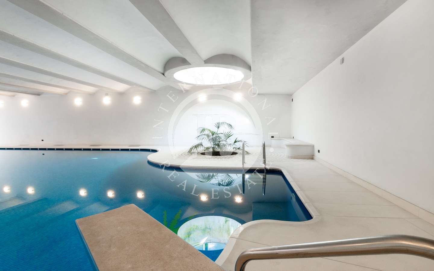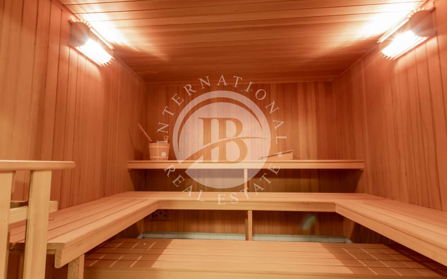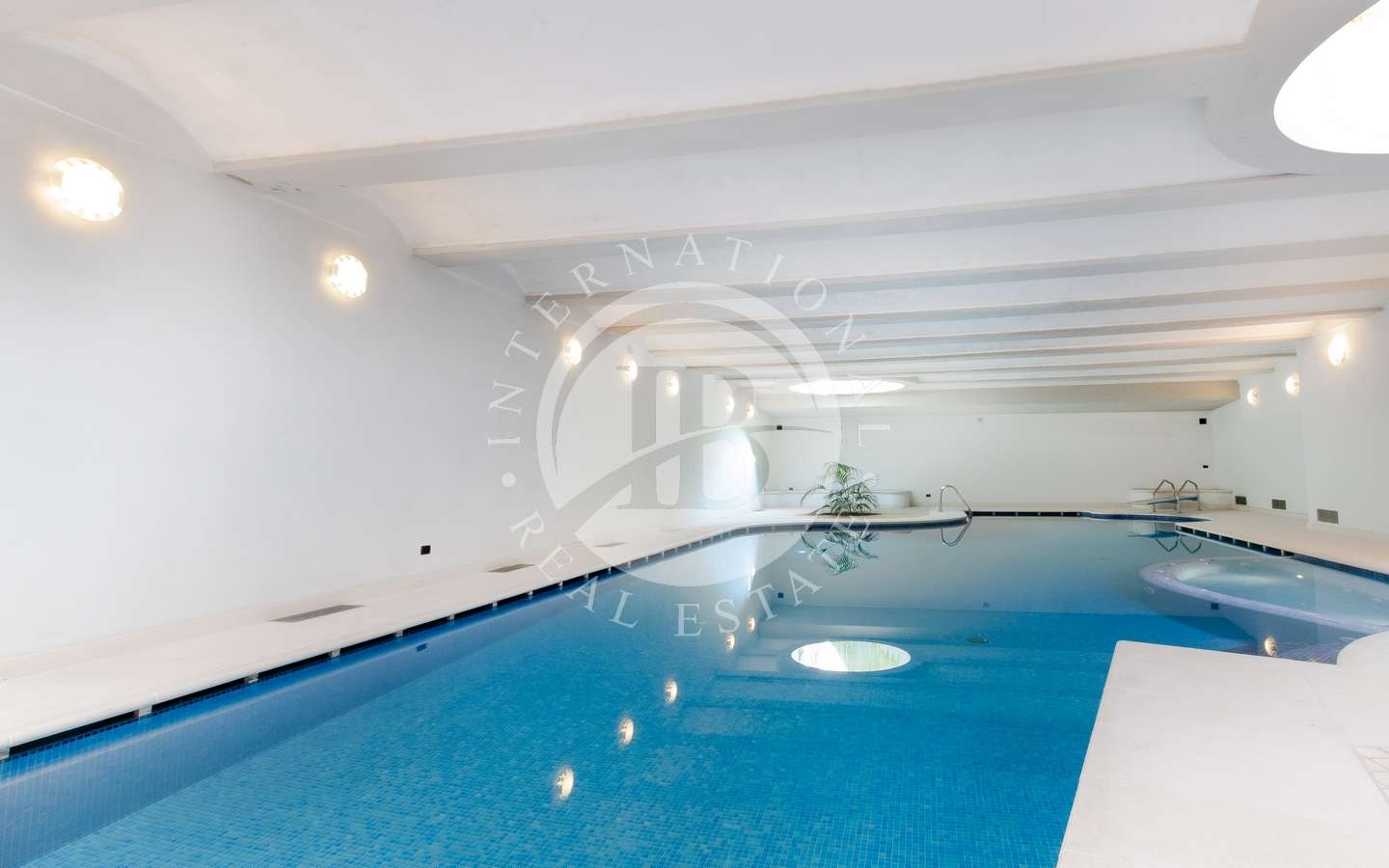 Il giardino privato, abbracciato da rigogliosi arbusti e alte palme, conferisce alla proprietà un'aura di esclusività e tranquillità. La piscina coperta, la sauna e il bagno turco offrono momenti di puro relax, mentre il parcheggio sotterraneo accoglie fino a dieci automobili con discrezione e comodità.