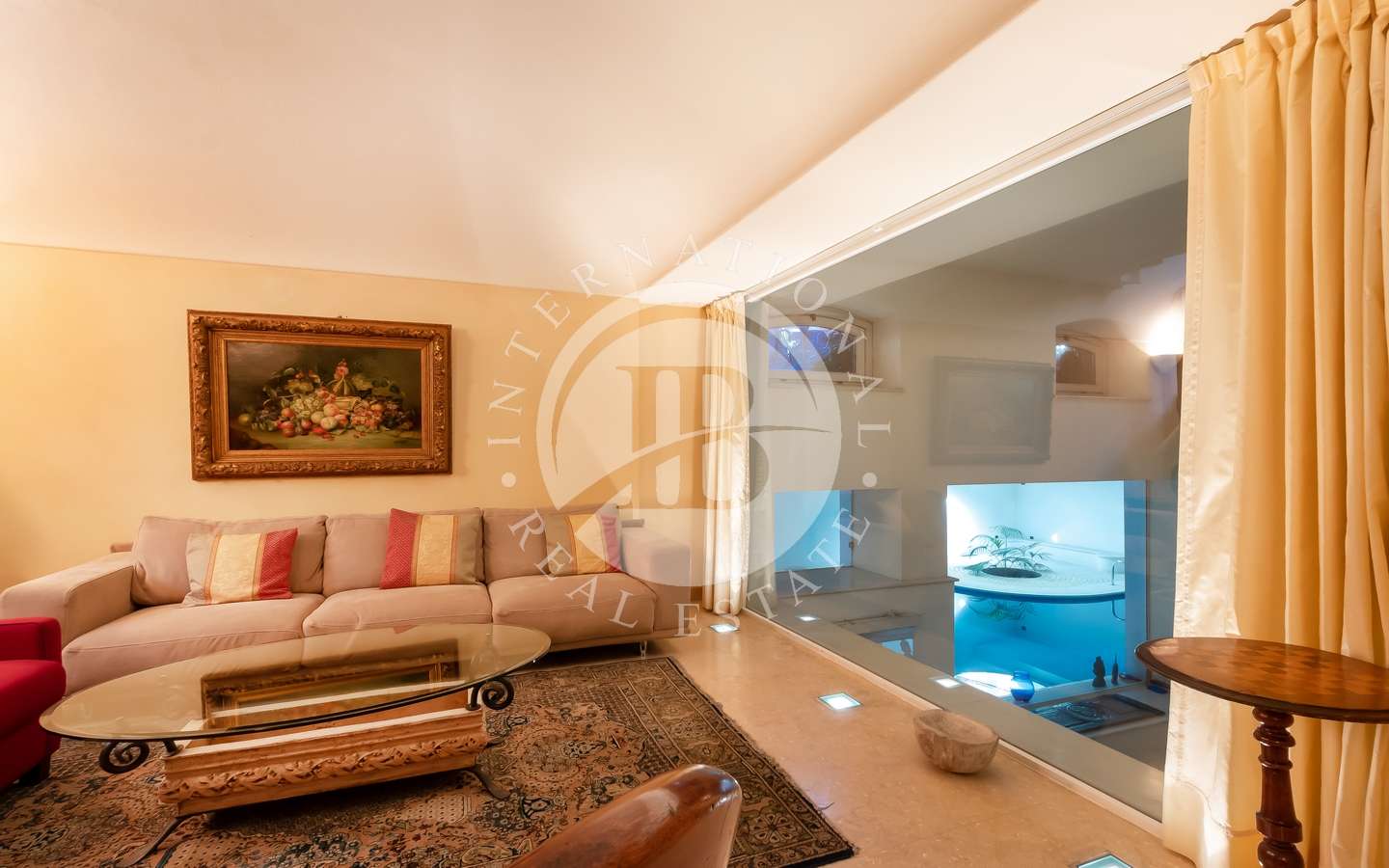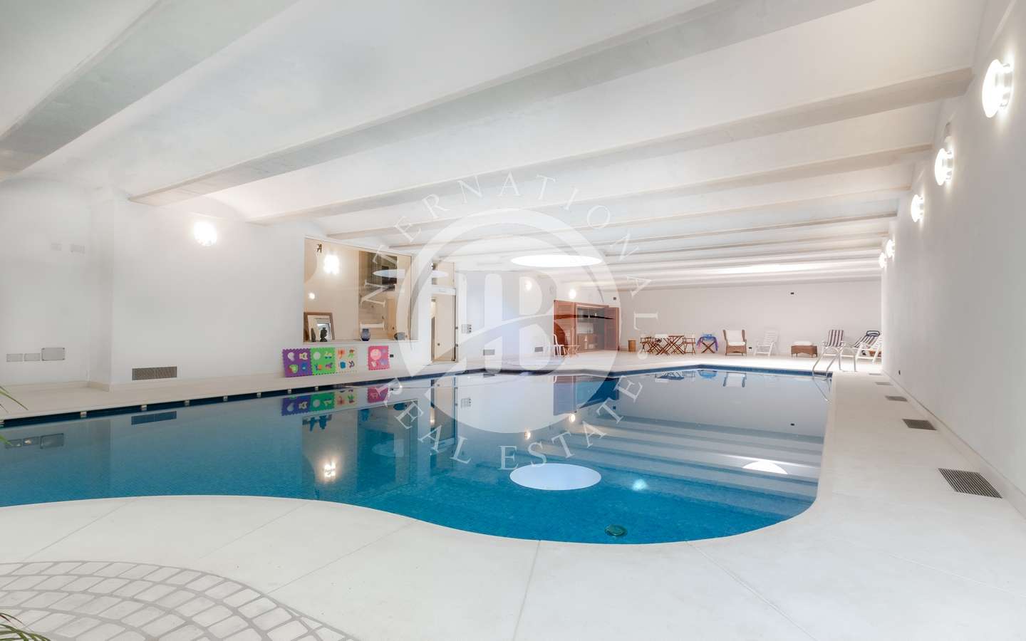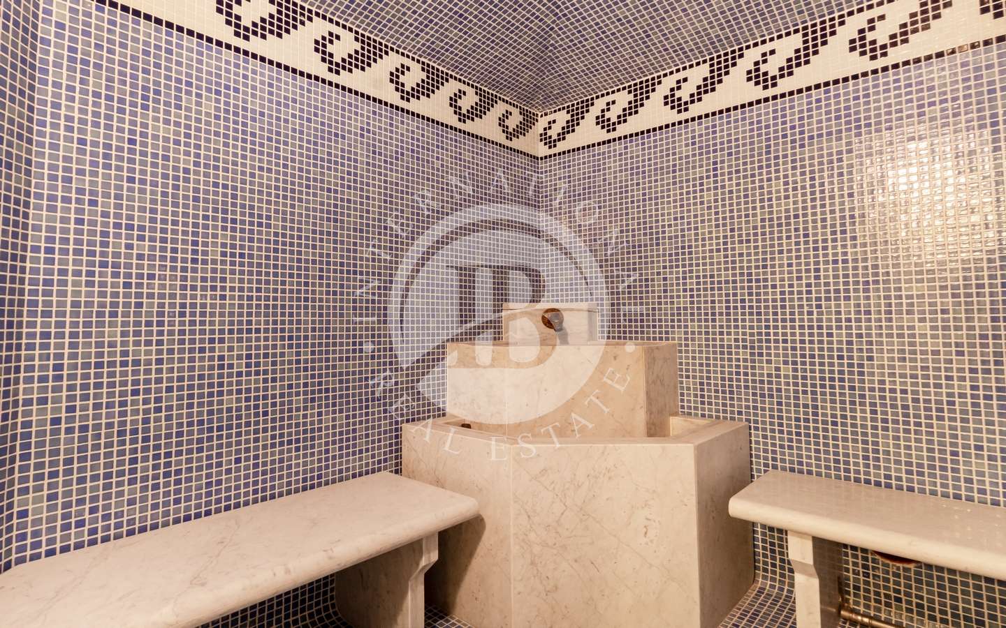 Il giardino privato, abbracciato da rigogliosi arbusti e alte palme, conferisce alla proprietà un'aura di esclusività e tranquillità. La piscina coperta, la sauna e il bagno turco offrono momenti di puro relax, mentre il parcheggio sotterraneo accoglie fino a dieci automobili con discrezione e comodità.