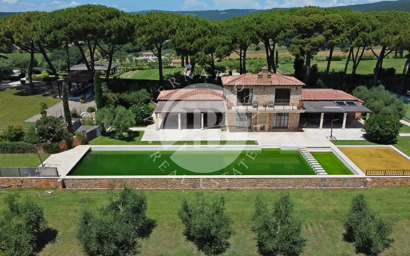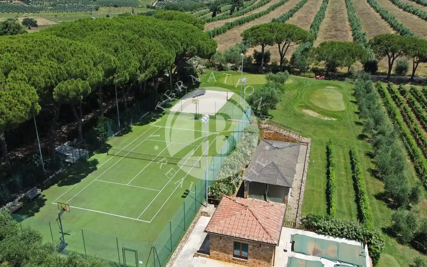 Un lago artificiale di 0,5 ettari è situato nella parte inferiore della proprietà. Il resto del terreno, privo di vigneti e uliveti, è destinato a scopi edilizi e a strutture ricreative attive, come un campo da tennis, un campo da golf, un paddock per passeggiate a cavallo, nonché strutture agricole per viticoltura e raccolta delle olive.Dalla terrazza della villa si può godere di una vista panoramica sulla pittoresca campagna toscana e sulla città di Massa Marittima, mentre la piscina e l'area prendisole offrono un ambiente ideale per il relax e per apprezzare questa incantevole location.La proprietà è stata oggetto di recenti e meticolose ristrutturazioni da parte dei proprietari attuali, che l'hanno trasformata in una vera e propria gemma.