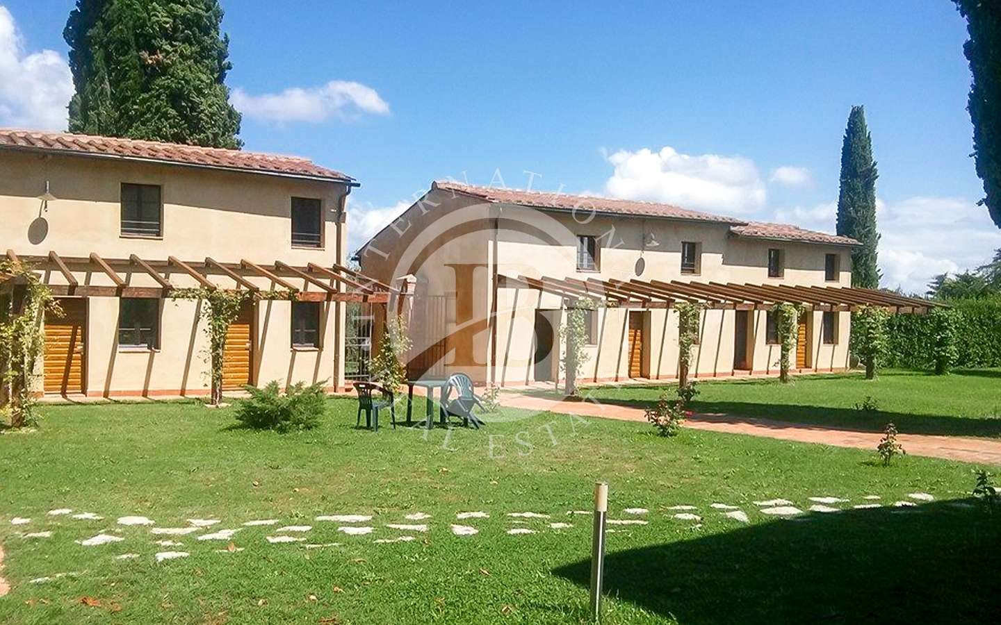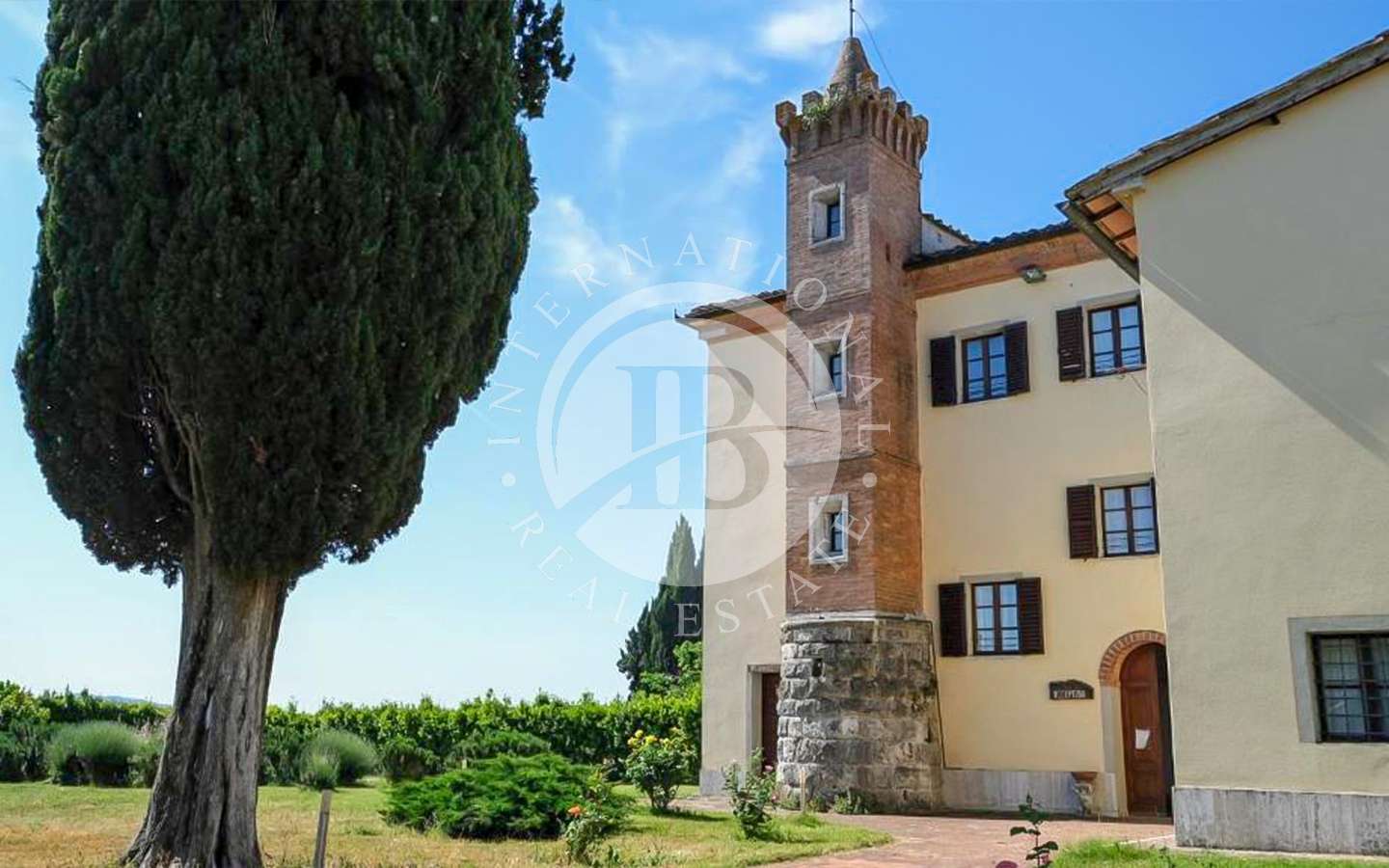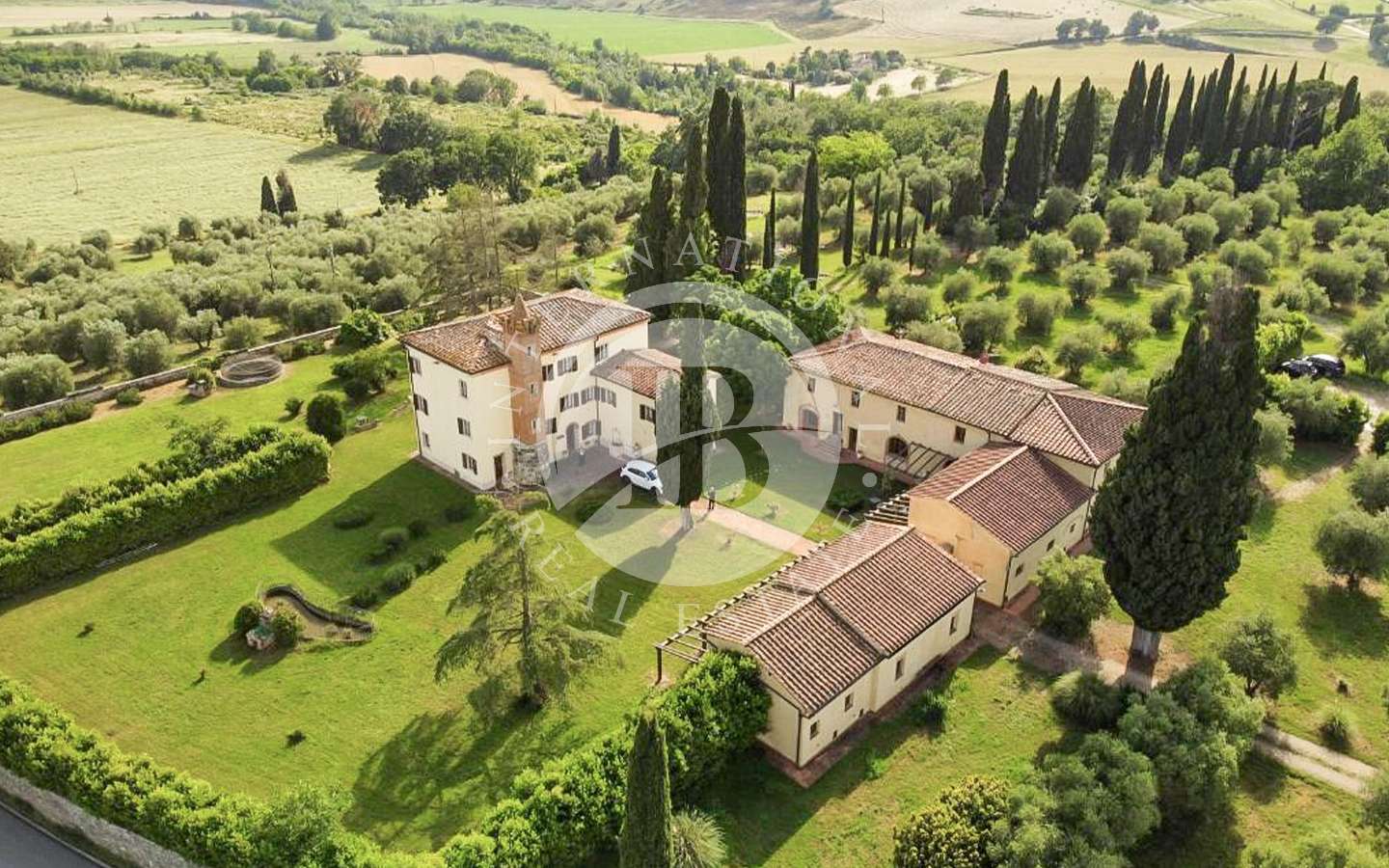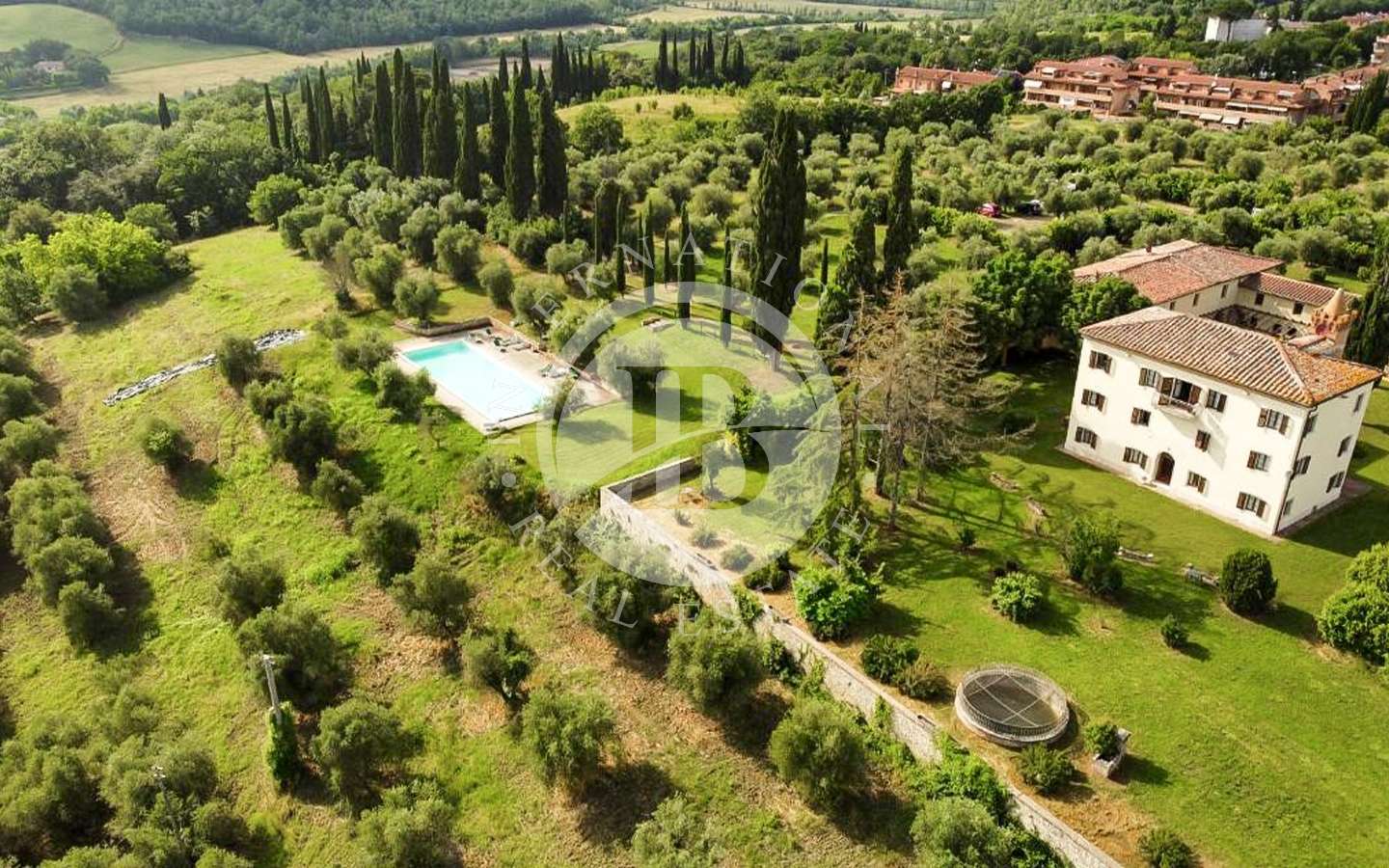 Il complesso residenziale è costituito da tre edifici distinti, immersi in un ampio parco con una vasca ornamentale, piscina con vista su Siena. La proprietà si trova nel Comune di Castelnuovo Berardenga (SI) nella frazione di Monteaperti.