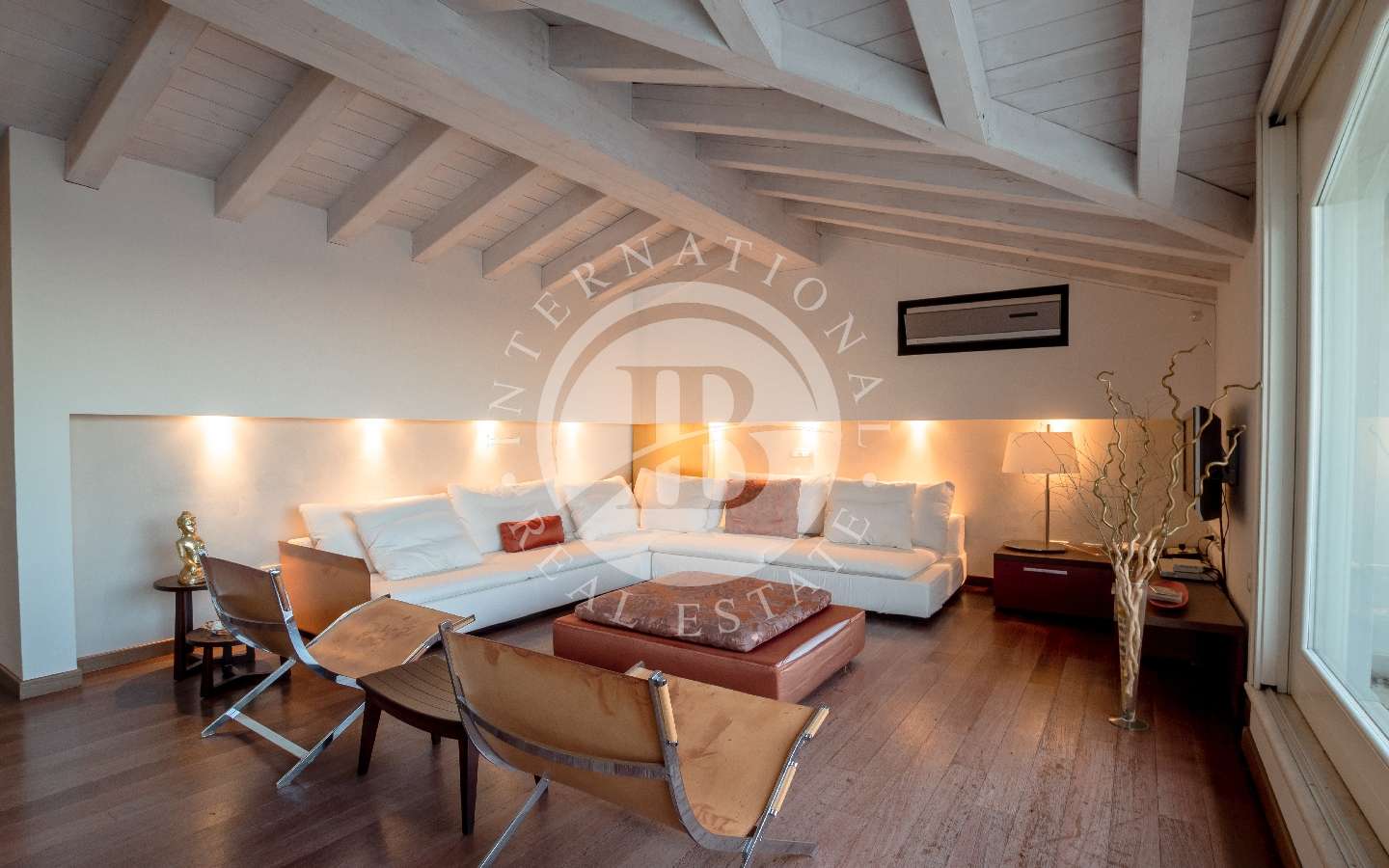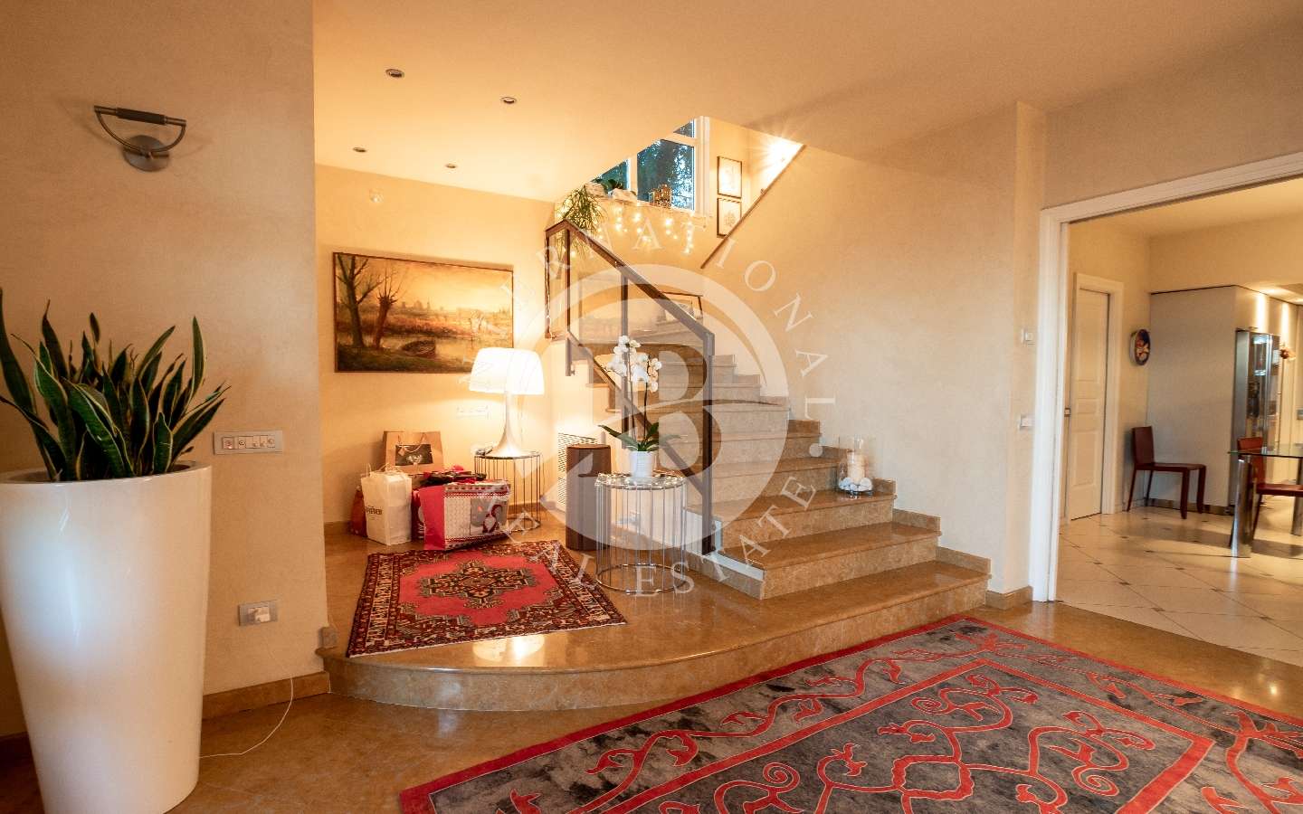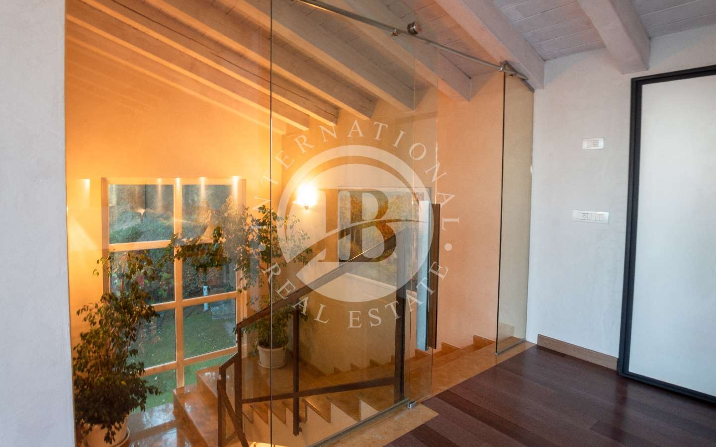 Al primo piano uno spazioso soggiorno, una cucina, due bagni ed una camera matrimoniale con cabina armadio.