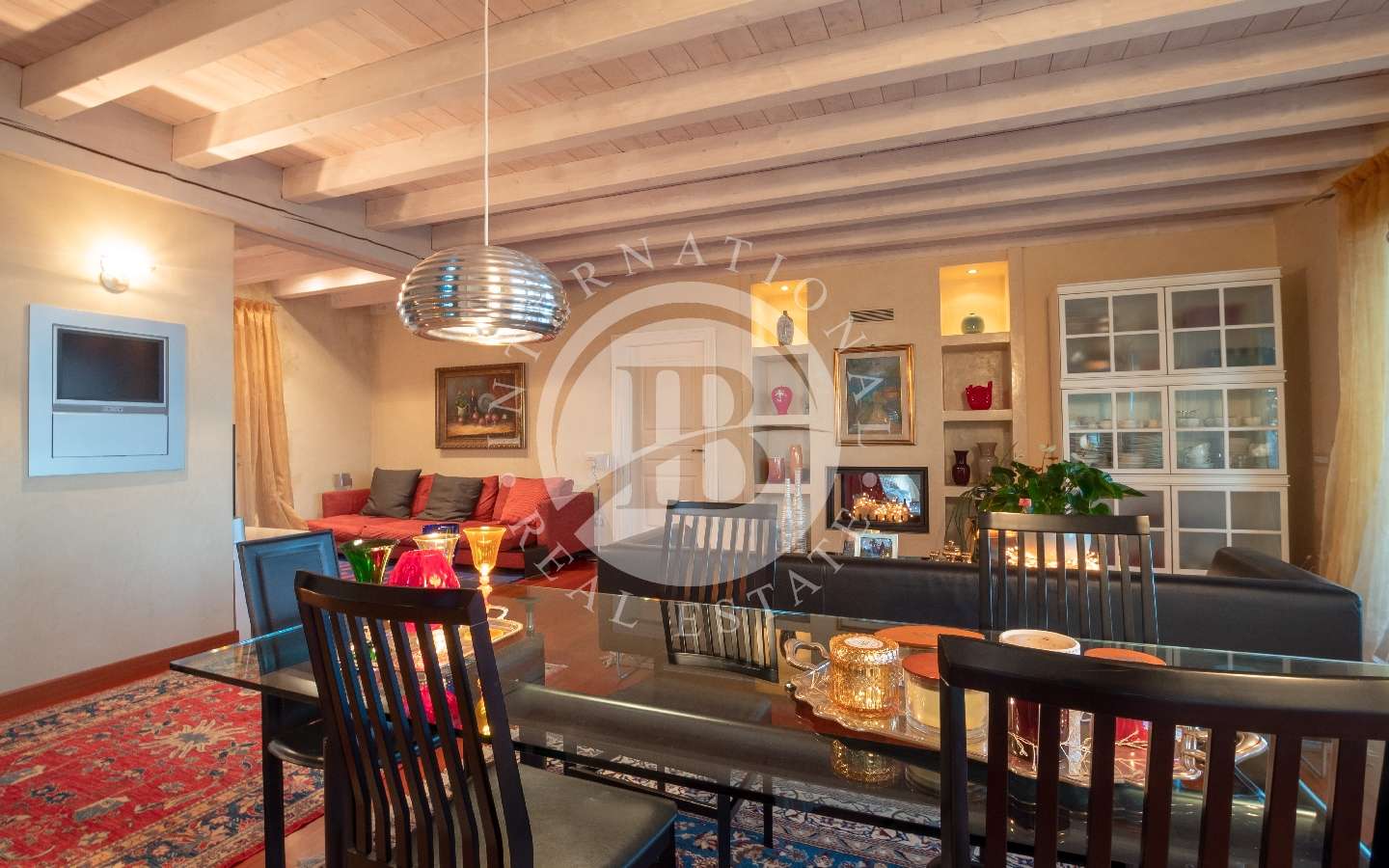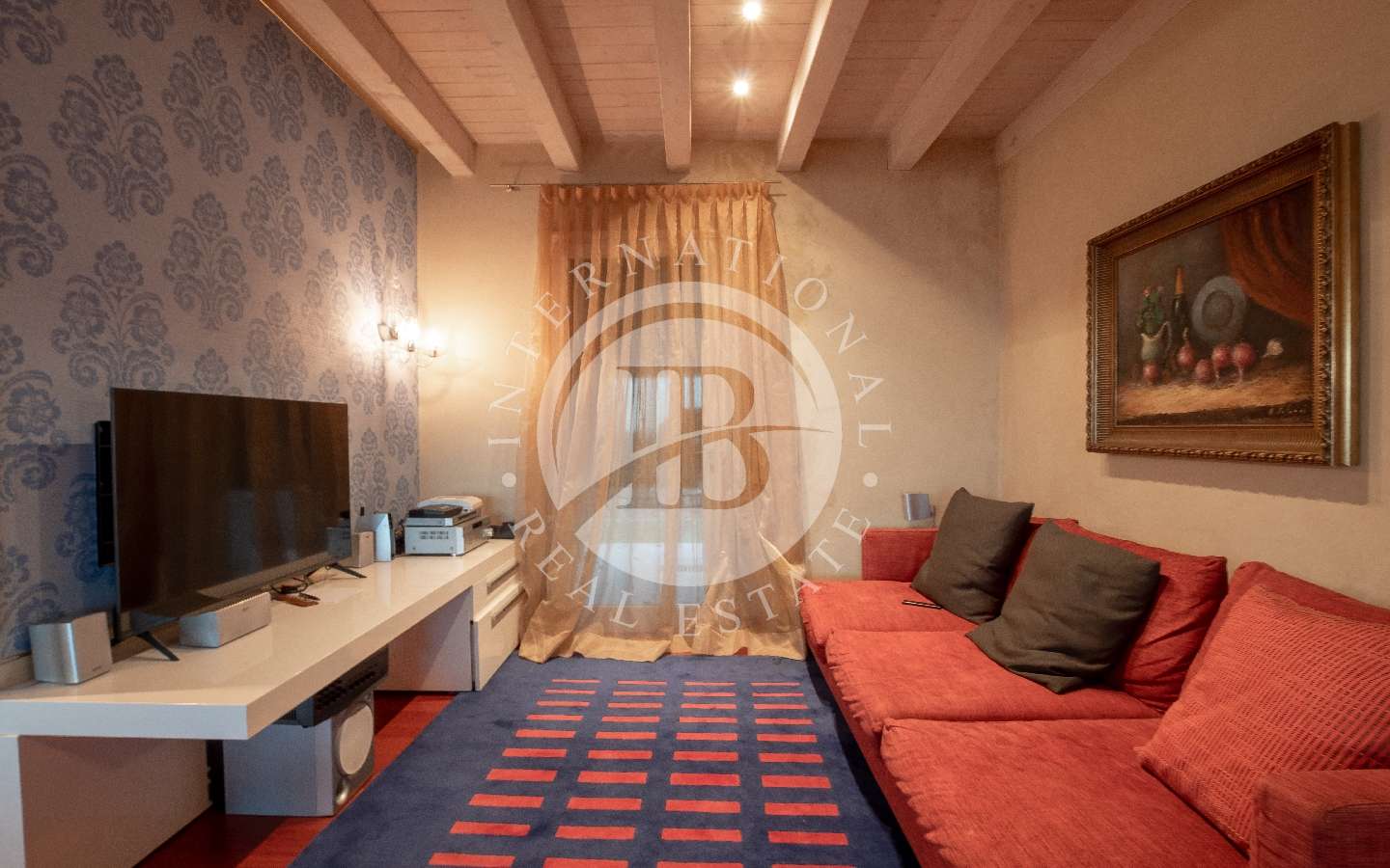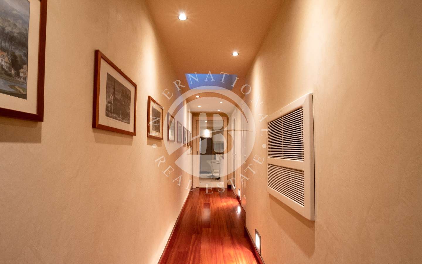 Al primo piano uno spazioso soggiorno, una cucina, due bagni ed una camera matrimoniale con cabina armadio.
