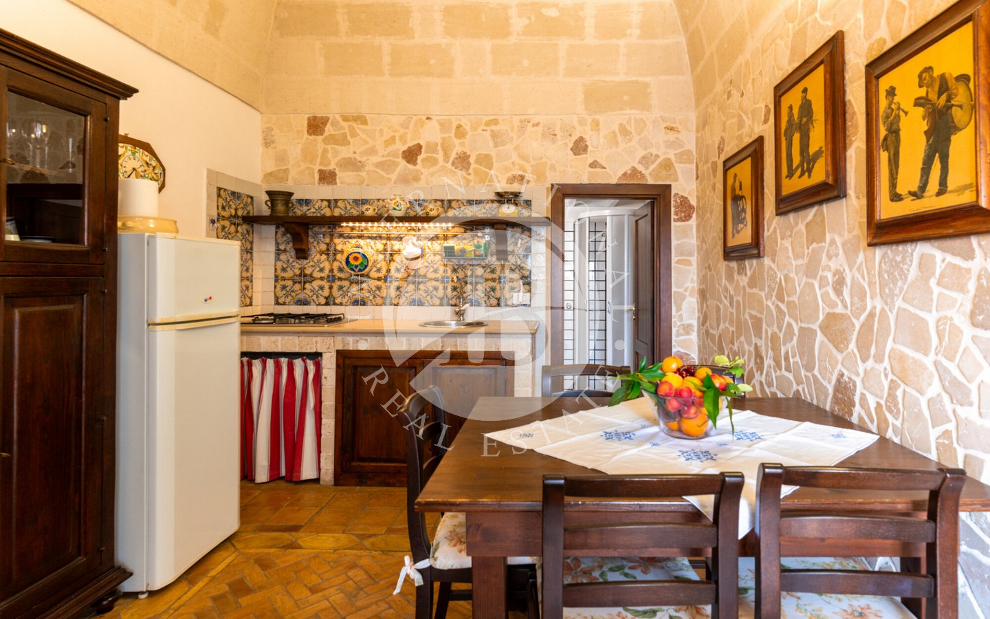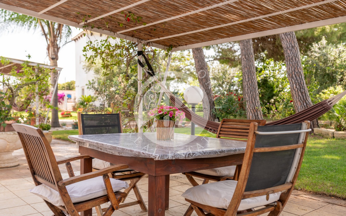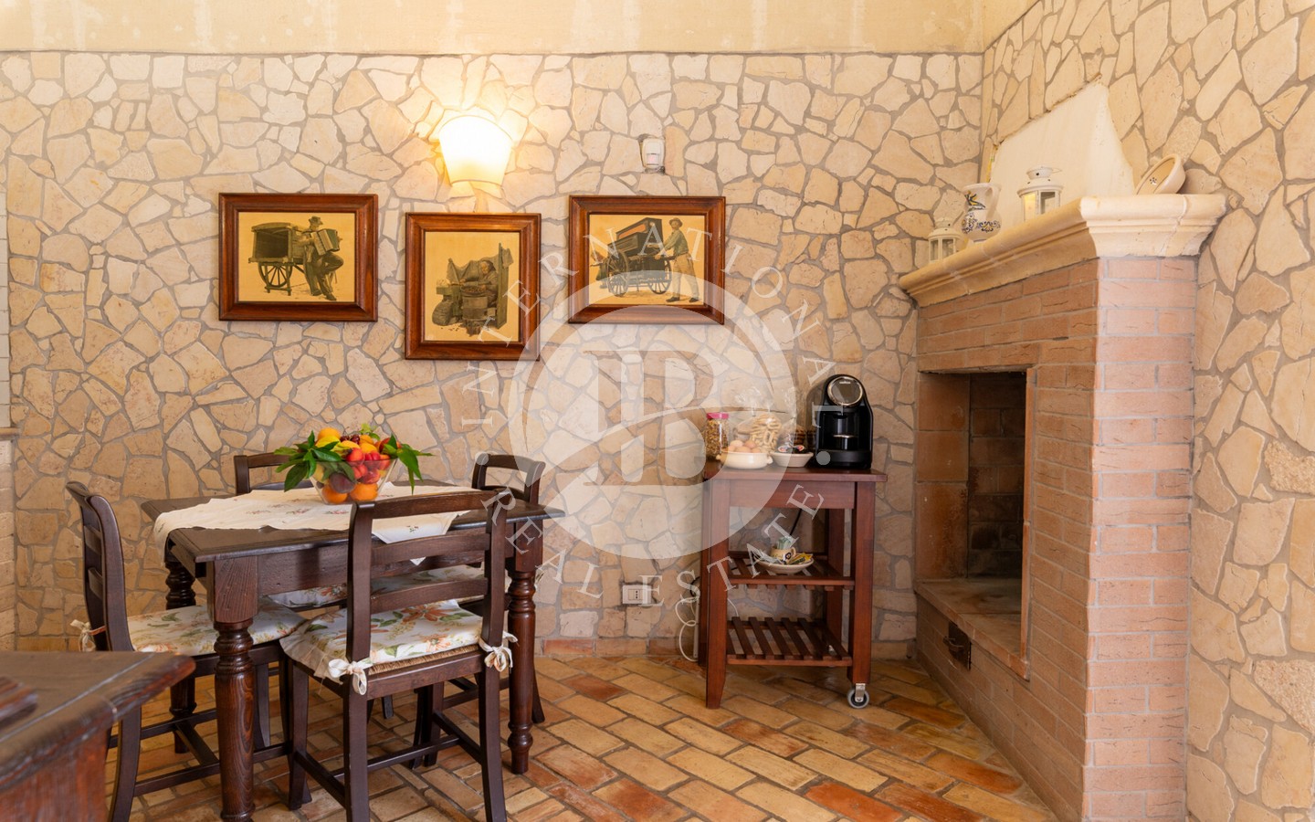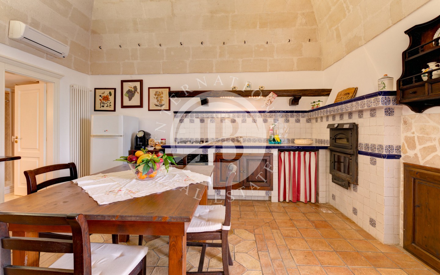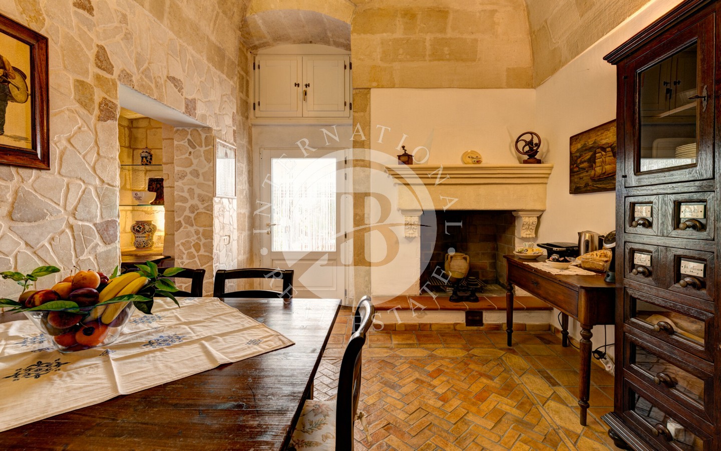 Circondata da circa 10 ettari di terreno pianeggiante esposto a sud-est, la tenuta ospita un rigoglioso aranceto di clementine primizie senza semi, un oliveto destinato alla produzione di olio extravergine e un vigneto a spalliera di 4 ettari, capace di produrre fino a 20.000 bottiglie annue. Il paesaggio agricolo, curato e produttivo, incornicia la masseria principale, un edificio storico recentemente ristrutturato con cura, che conserva tutti i dettagli architettonici originali: pavimenti in cotto antico, alte volte a croce in pietra di tufo e maestosi camini in pietra.