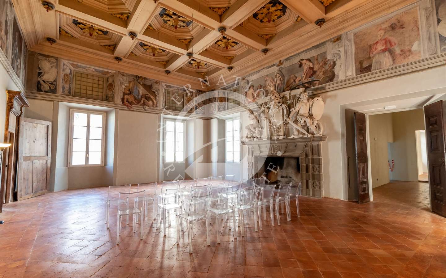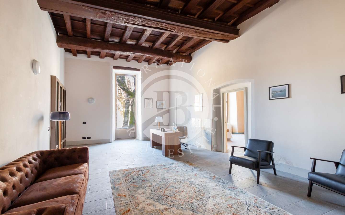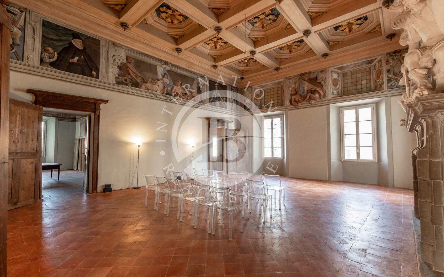 A completare la struttura vi sono, al piano terra, un grande spazio commerciale con uffici ed il cuore del palazzo, ovvero la residenza papale, il maestoso spazio, di oltre 500 mq che, attraverso lo scalone imperiale, caratterizzato da dettagli unici e di inestimabile valore storico tra cui affreschi di artisti provenienti da tutto il mondo cristiano, soffitti a cassettoni e camini autentici, aveva ospitato papa Innocenzo XI.