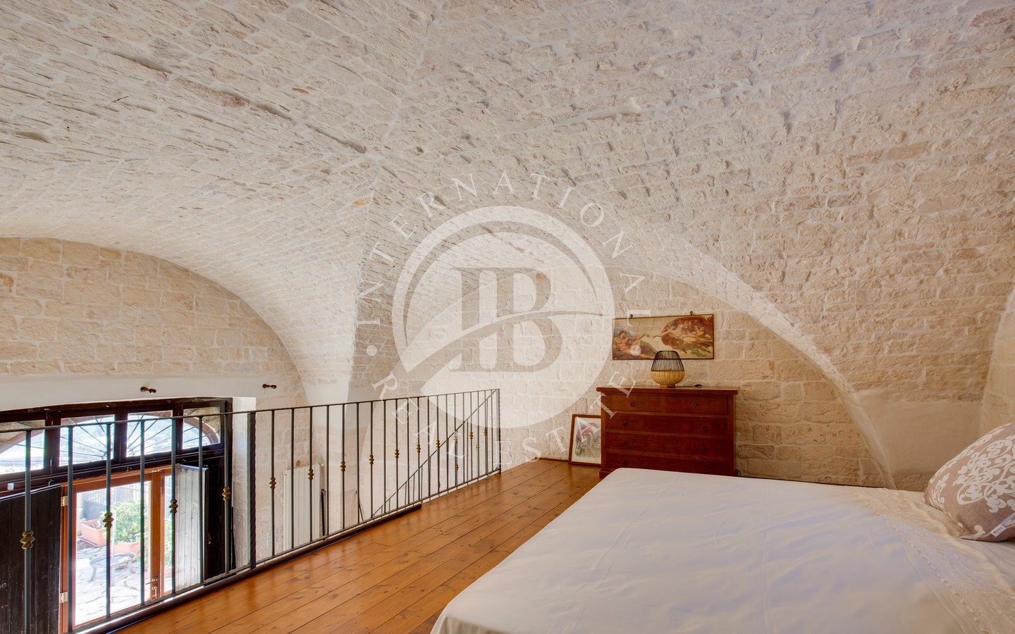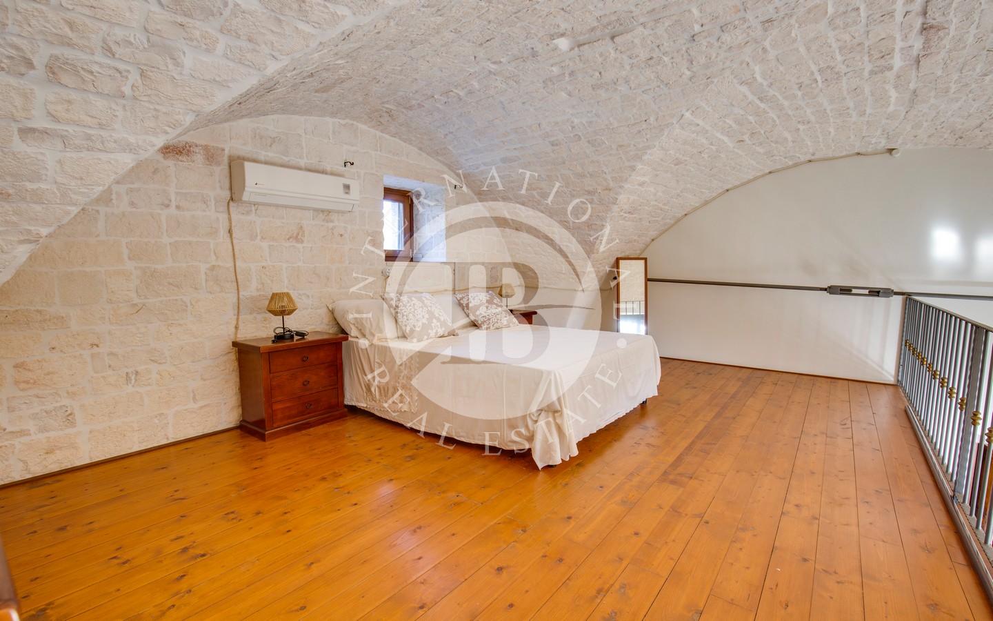 All’interno, la zona living è luminosa e accogliente, arricchita da alte volte in pietra, camino, angolo cottura, bagno e un ampio soppalco con finestra, perfetto come spazio aggiuntivo multifunzionale.