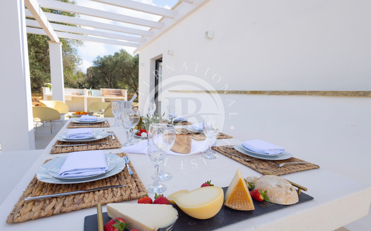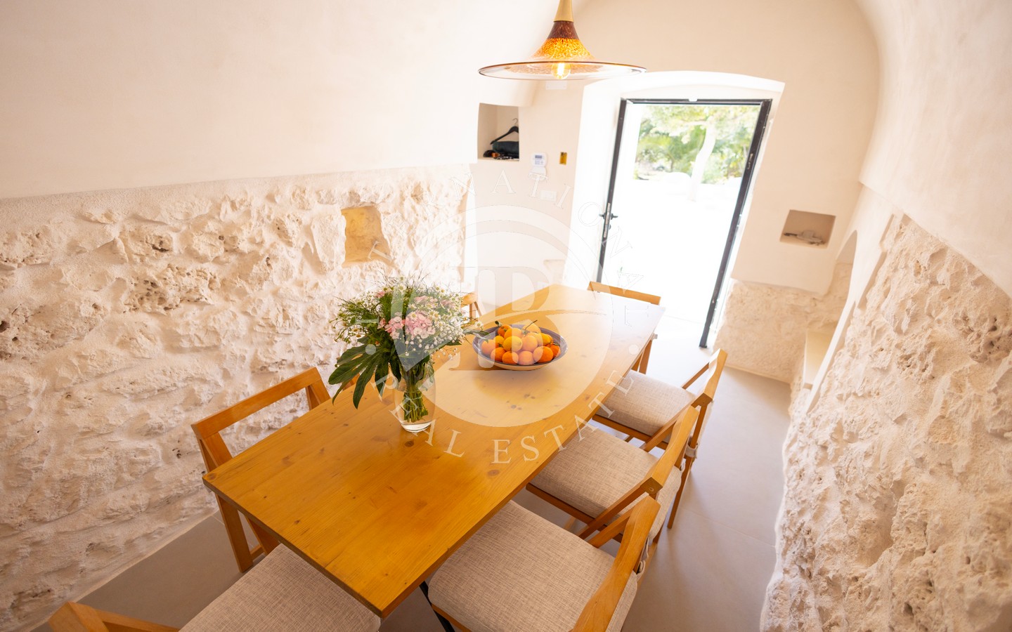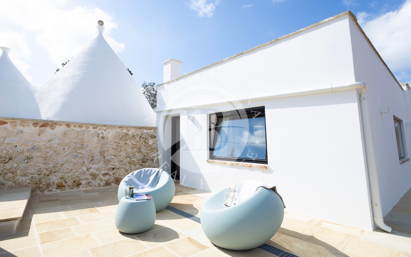 La dimora è composta da quattro camere da letto e quattro bagni, ognuno con ingresso indipendente, distribuiti tra il trullo originario e la lamia oggetto di ampliamento. L’antica lamia è stata trasformata in un luminosissimo living, che accoglie una cucina ampia e funzionale, un bagno e un comodo ripostiglio. Adiacente alla cucina si apre una splendida veranda coperta con angolo barbecue, ideale per pranzi e cene all’aperto in ogni stagione.