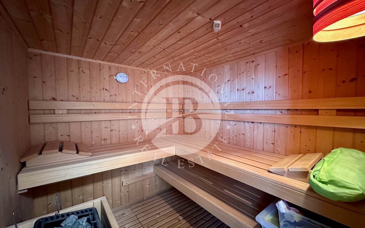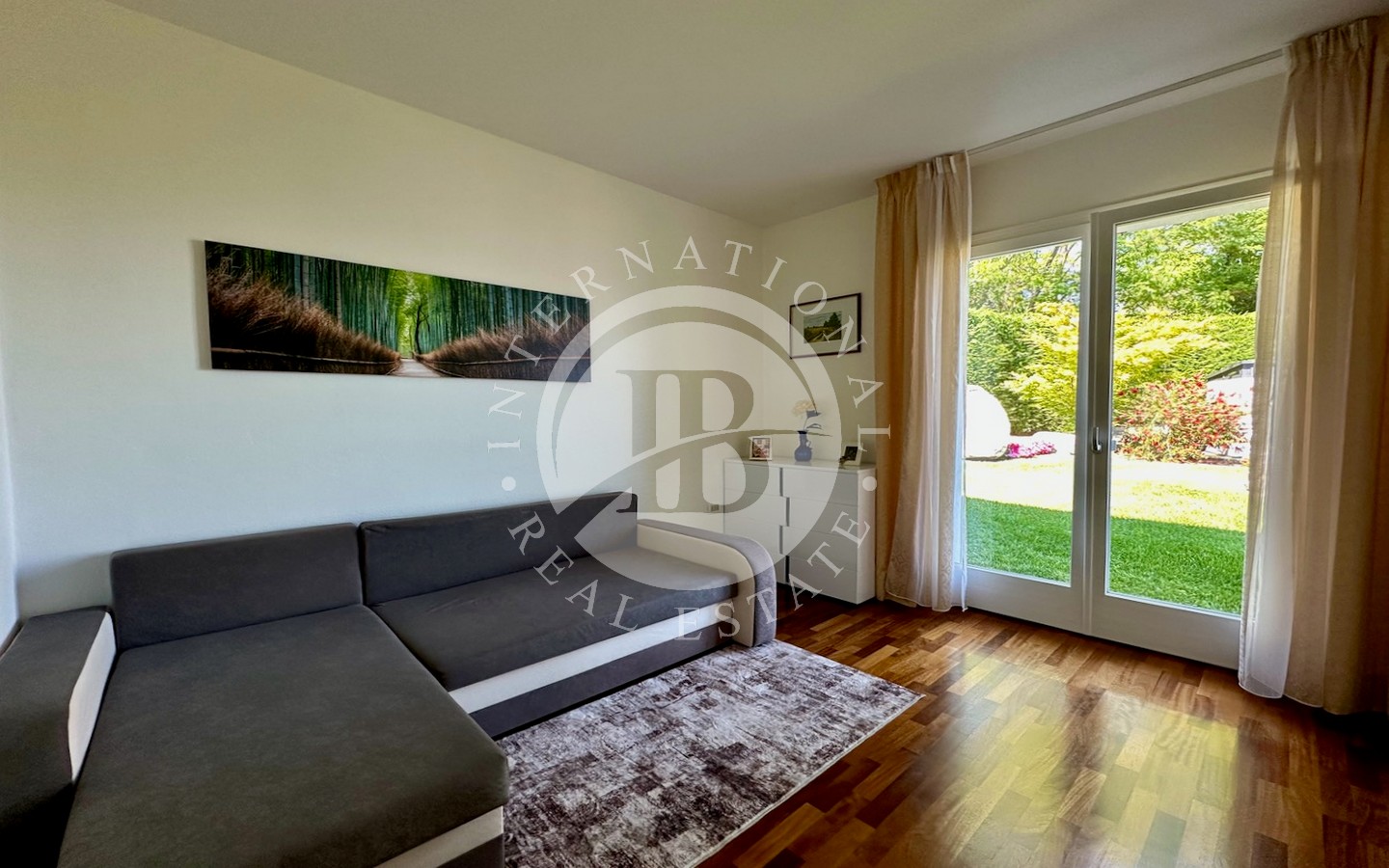Situata in posizione riservata e circondata dal verde, la proprietà si sviluppa su un unico livello ed è composta da un ampio e luminoso soggiorno, cucina abitabile, tre camere da letto, due bagni, sauna privata e ripostiglio. Al piano seminterrato si trovano una spaziosa cantina e un comodo garage doppio.