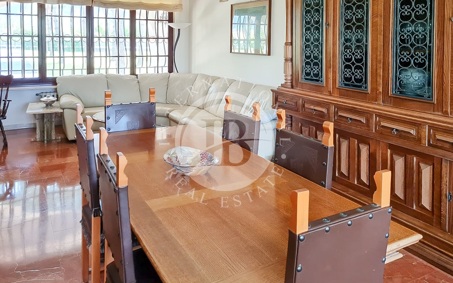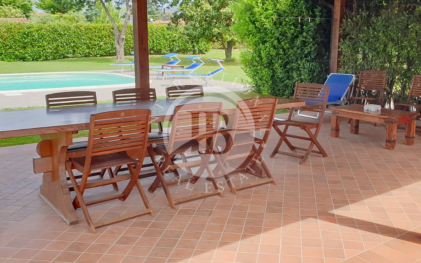 L'ampio giardino ben curato, arricchito da piante secolari e zone fiorite, avvolge la proprietà in un'atmosfera di assoluta riservatezza. Il punto focale degli spazi esterni è la splendida piscina con solarium, perfetta per godere delle calde giornate estive in totale relax. Un'ampia tettoia in legno offre un'area ombreggiata dove trascorrere piacevoli momenti con amici e familiari. La proprietà vanta inoltre un forno a legna e un barbecue, ideali per cene all’aperto. Grazie alla sua posizione strategica e all’ottima distribuzione degli ambienti, la villa rappresenta anche una perfetta opportunità di messa a reddito.