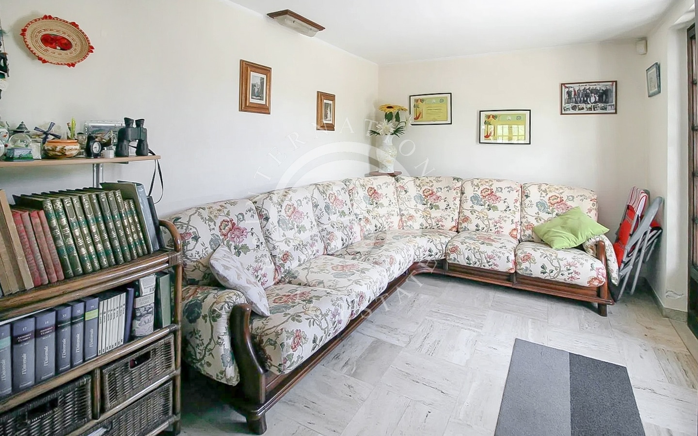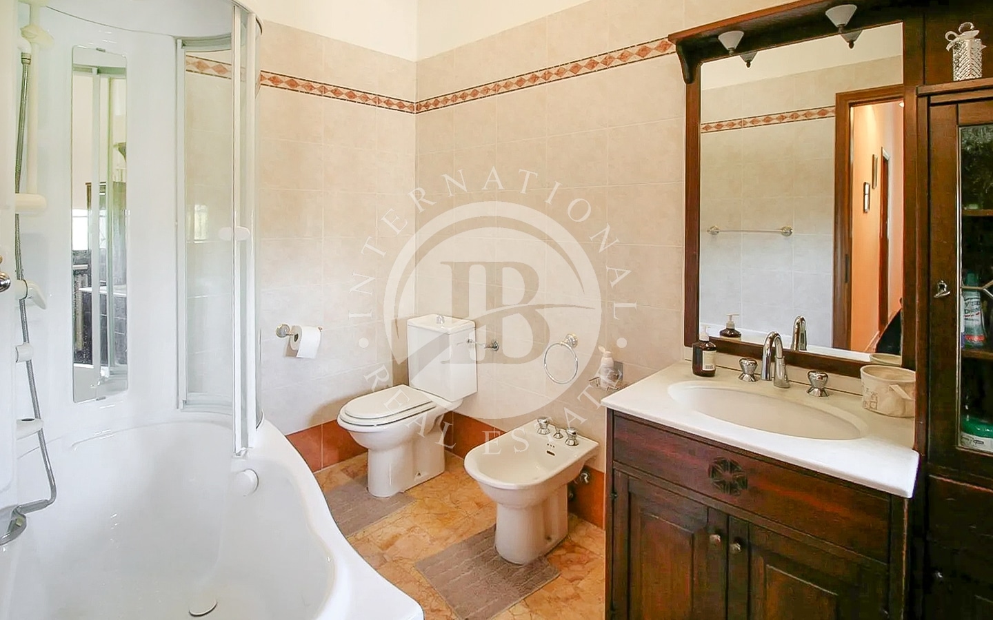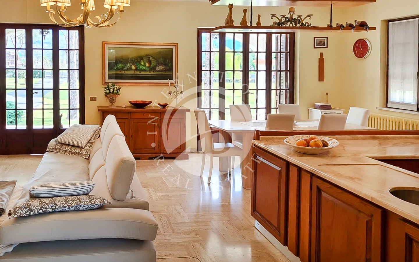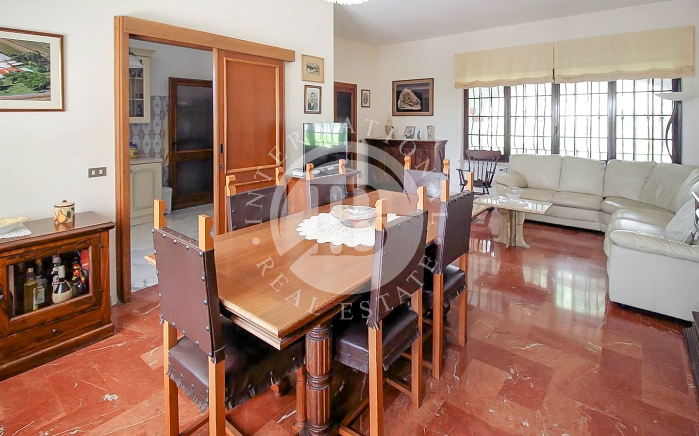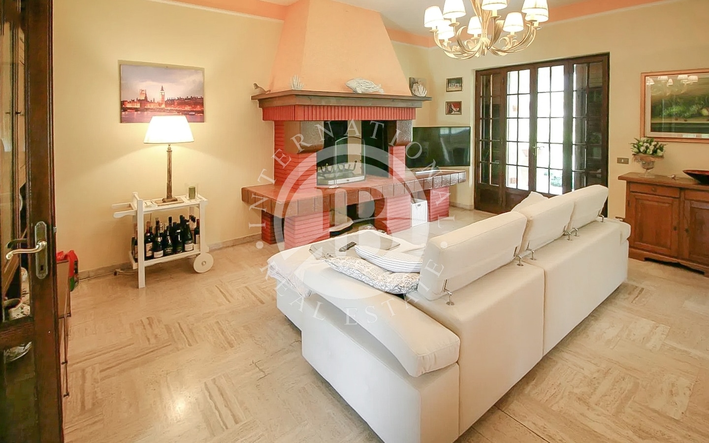 Gli interni della villa si distinguono per eleganza e funzionalità. Attualmente suddivisa in due unità indipendenti, la proprietà può essere riconfigurata in un'unica residenza di prestigio. La porzione principale si sviluppa su due livelli: al piano terra rialzato, un raffinato salottino introduce alla luminosa zona giorno, arricchita da un suggestivo camino, area divani, zona pranzo e cucina a vista. Completano il piano un bagno di servizio e un ampio porticato ideale per momenti conviviali. Al primo piano si trovano un elegante soggiorno/studio, tre spaziose camere da letto, un bagno con doccia e un locale multiuso. La seconda porzione della villa, situata su tre livelli, include un accogliente soggiorno, una spaziosa taverna e un bagno, con affaccio diretto sulla zona esterna.