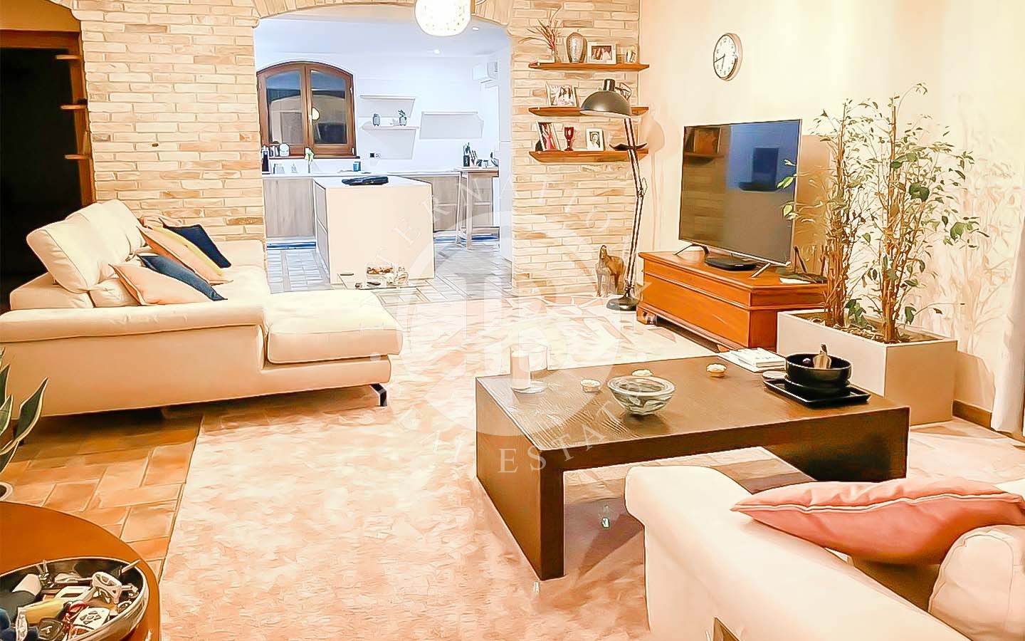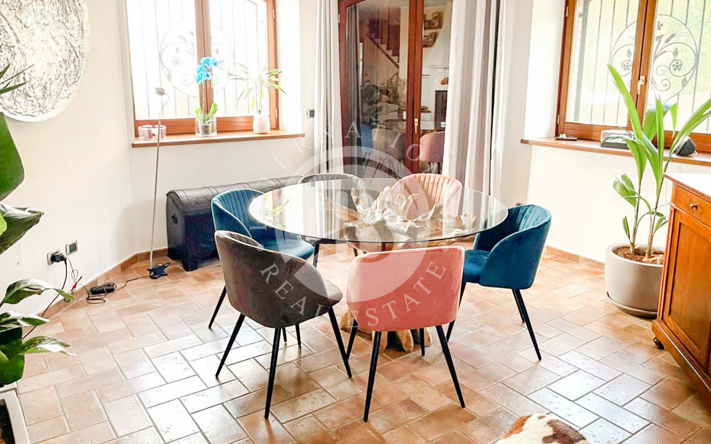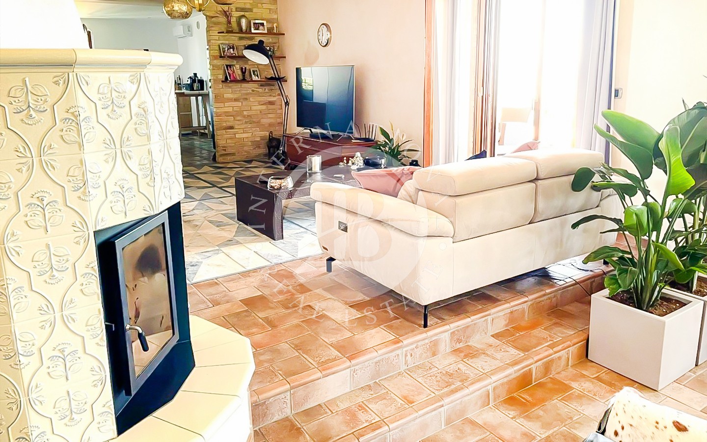 La dimora, arredata con gusto e materiali di pregio, si sviluppa su tre livelli collegati da una comoda scala interna. Al piano terra si accede tramite un ingresso che conduce a un’ampia zona giorno con elegante stufa in maiolica, cucina a vista, disimpegno, un bagno e una camera da letto. Il primo piano ospita tre camere da letto e due bagni, di cui uno en-suite nella camera padronale.