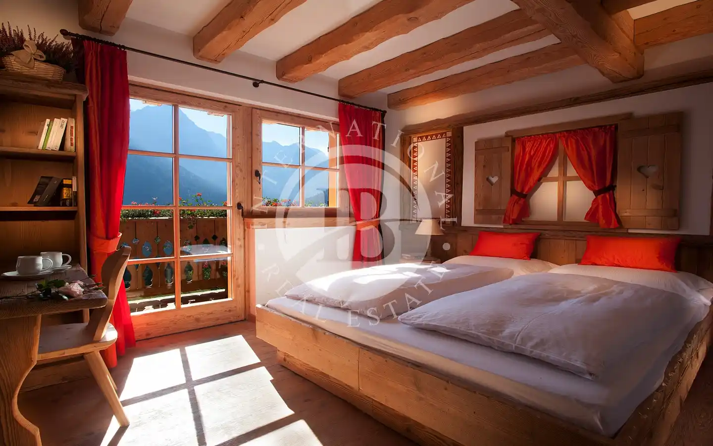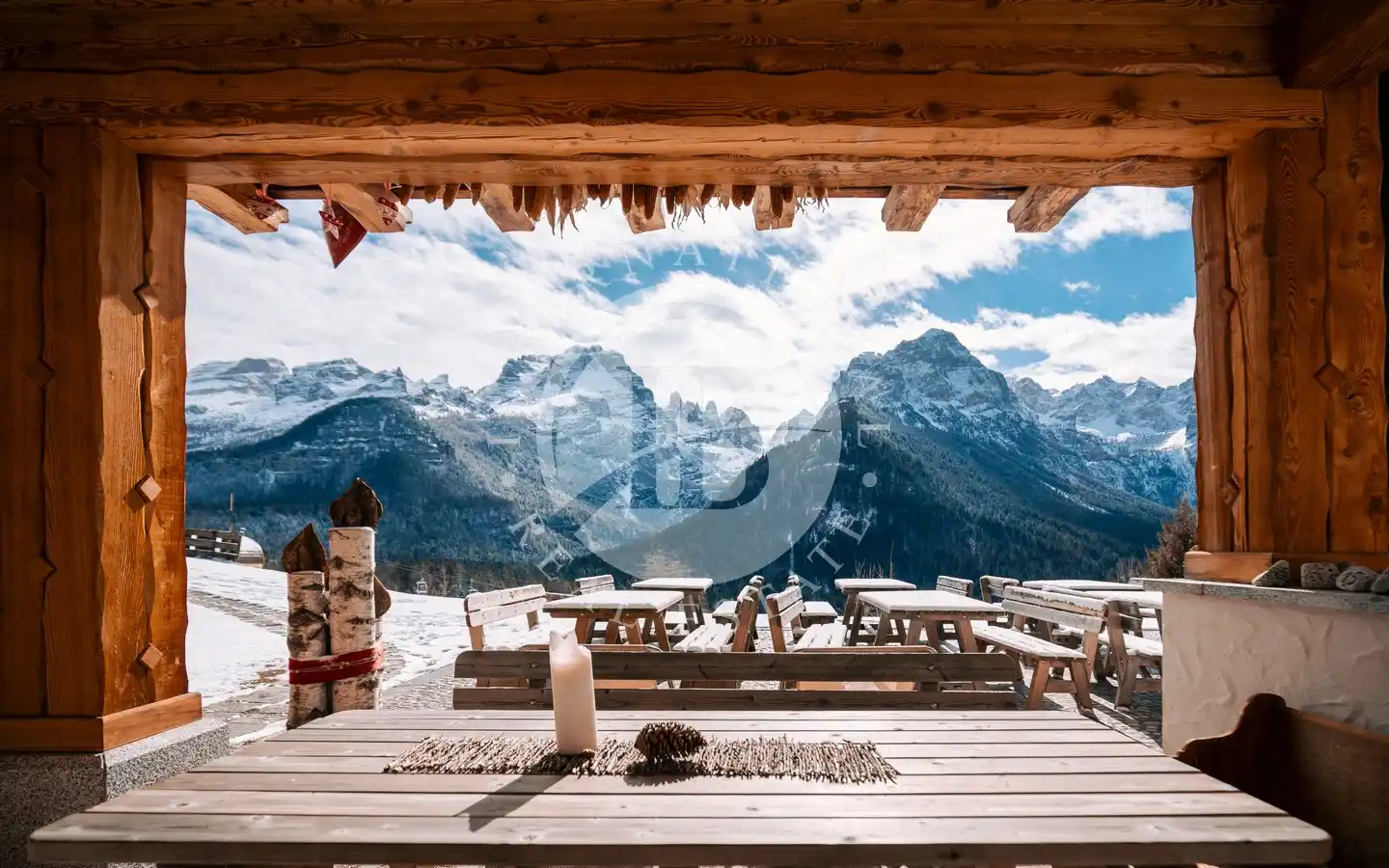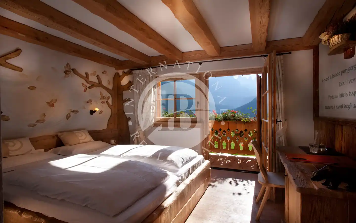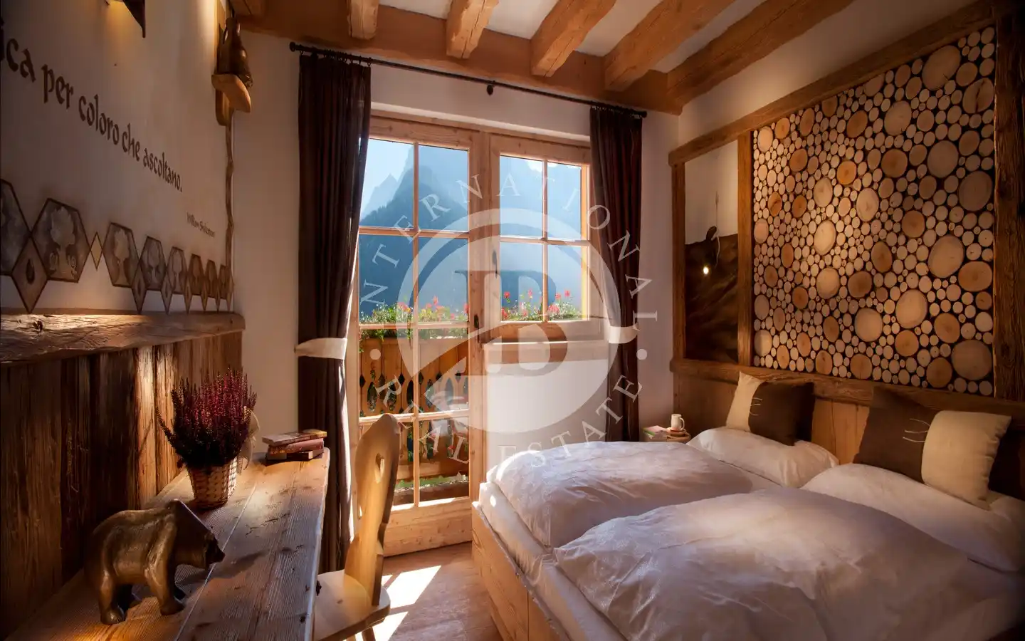 La zona giorno si apre su un ampio salotto con camino in pietra e bow-window panoramica, affacciata sulle vette dolomitiche. La cucina, professionale e luminosa, è ideale sia per appassionati gourmet che per un cuoco privato.