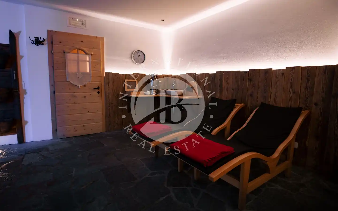 Il livello inferiore comprende uno ski room attrezzato, un’area wellness, una sala polifunzionale (ideale come home cinema o palestra) e una camera con bagno, perfetta per lo staff o come spazio di servizio.