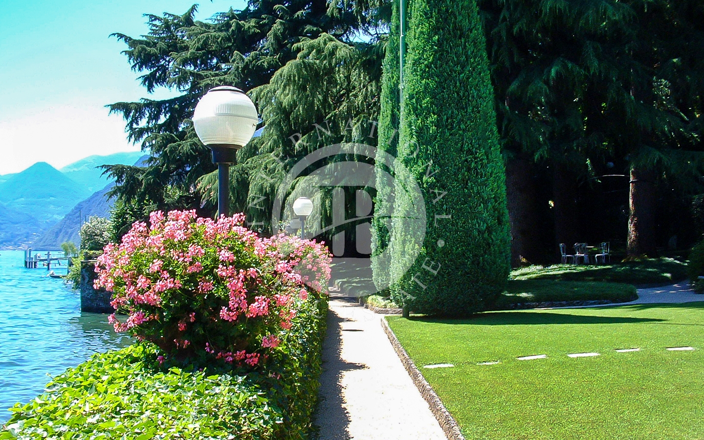 Una scala in pietra conduce alla riva del lago e ad un giardino mediterraneo con zona pranzo coperta.