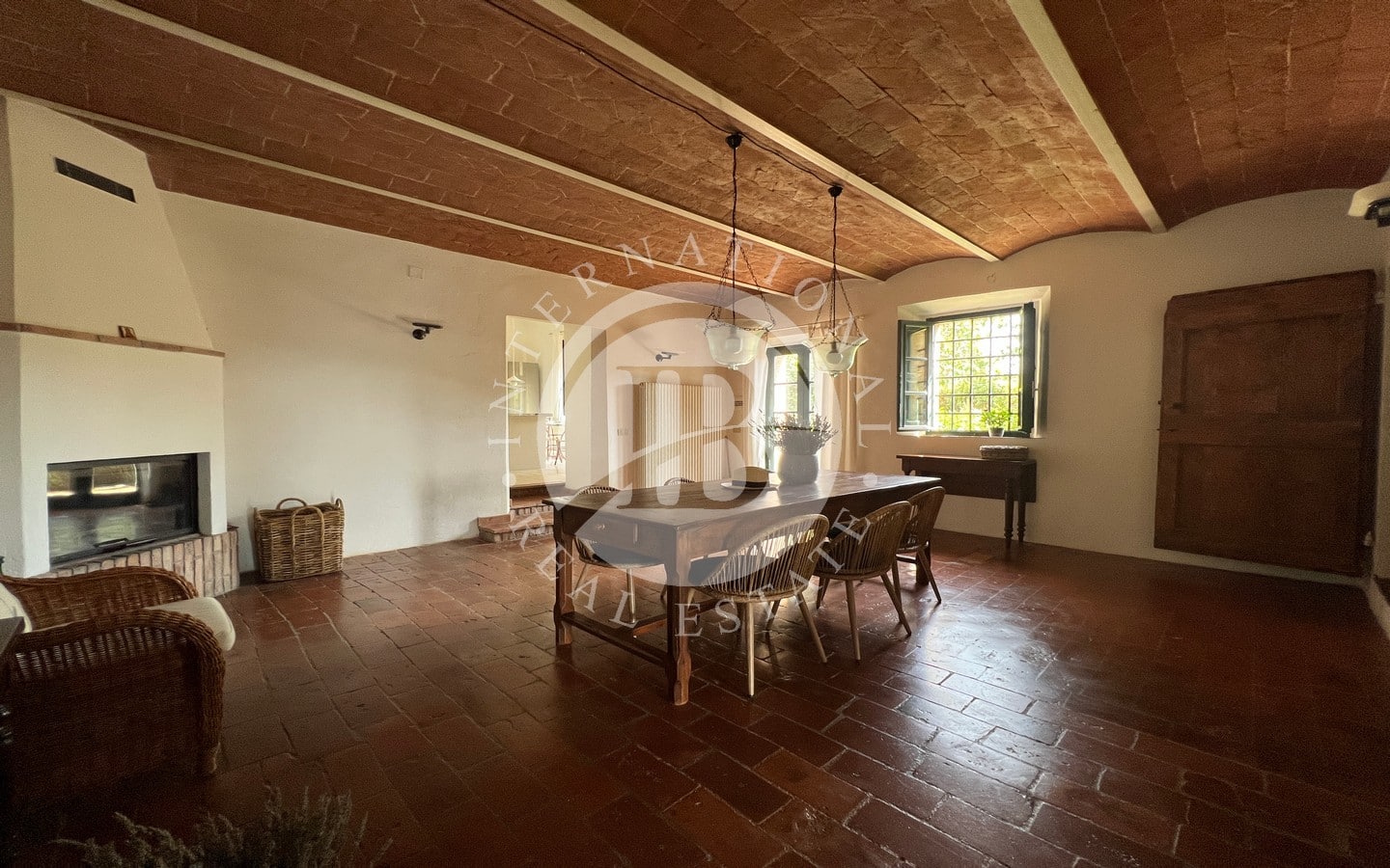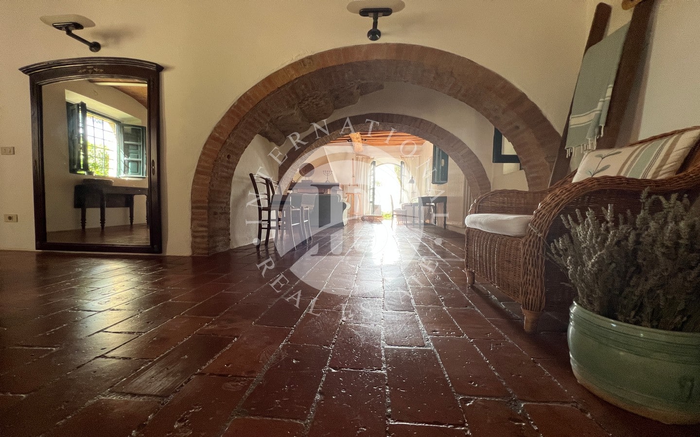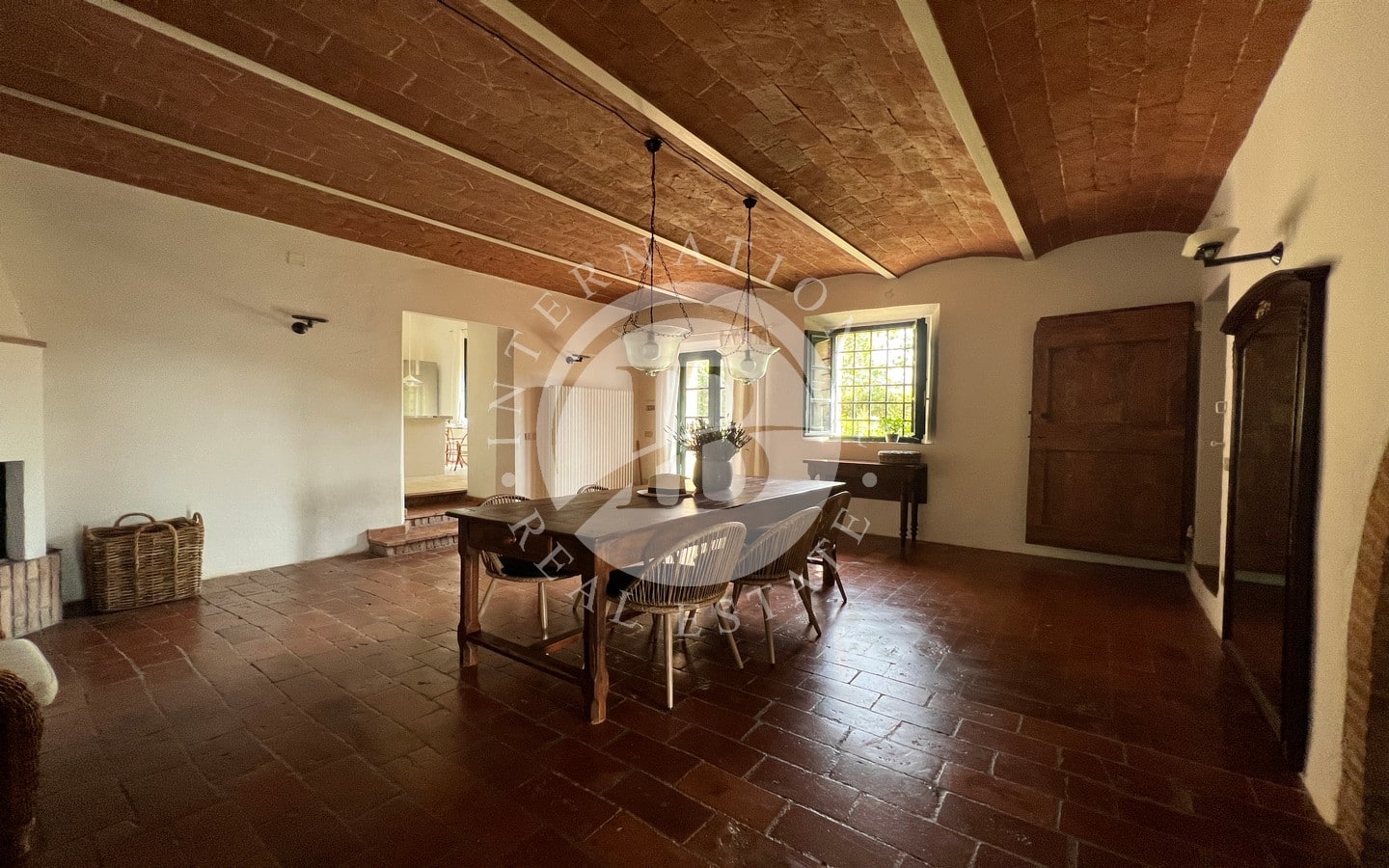 L'ingresso principale, con un portico in pietra, conduce a un ampio soggiorno caratterizzato da un tipico camino toscano. Splendidi archi separano la zona giorno dalla sala da pranzo e dalla cucina, quest'ultima affacciata sul giardino attraverso una porta finestra che conduce a una splendida area esterna dove poter pranzare all'aperto. Completano il piano terra un comodo bagno e un pratico ripostiglio.