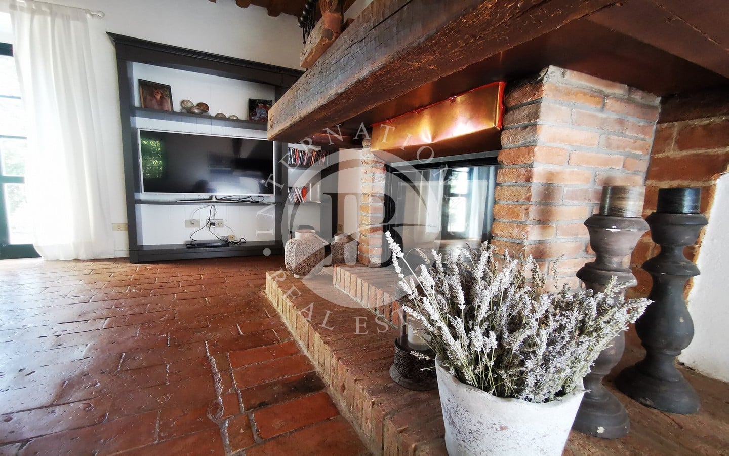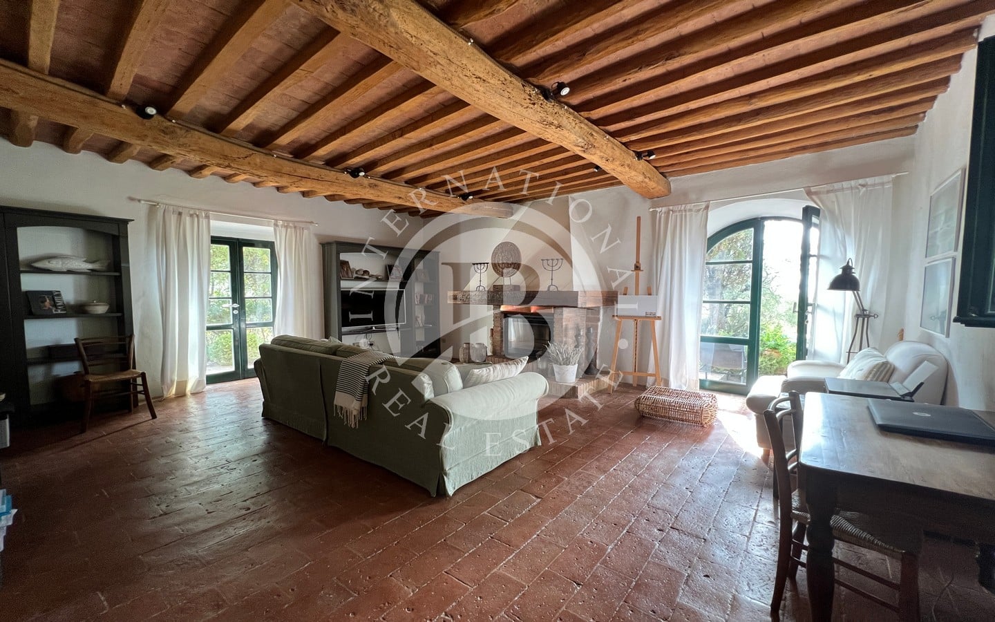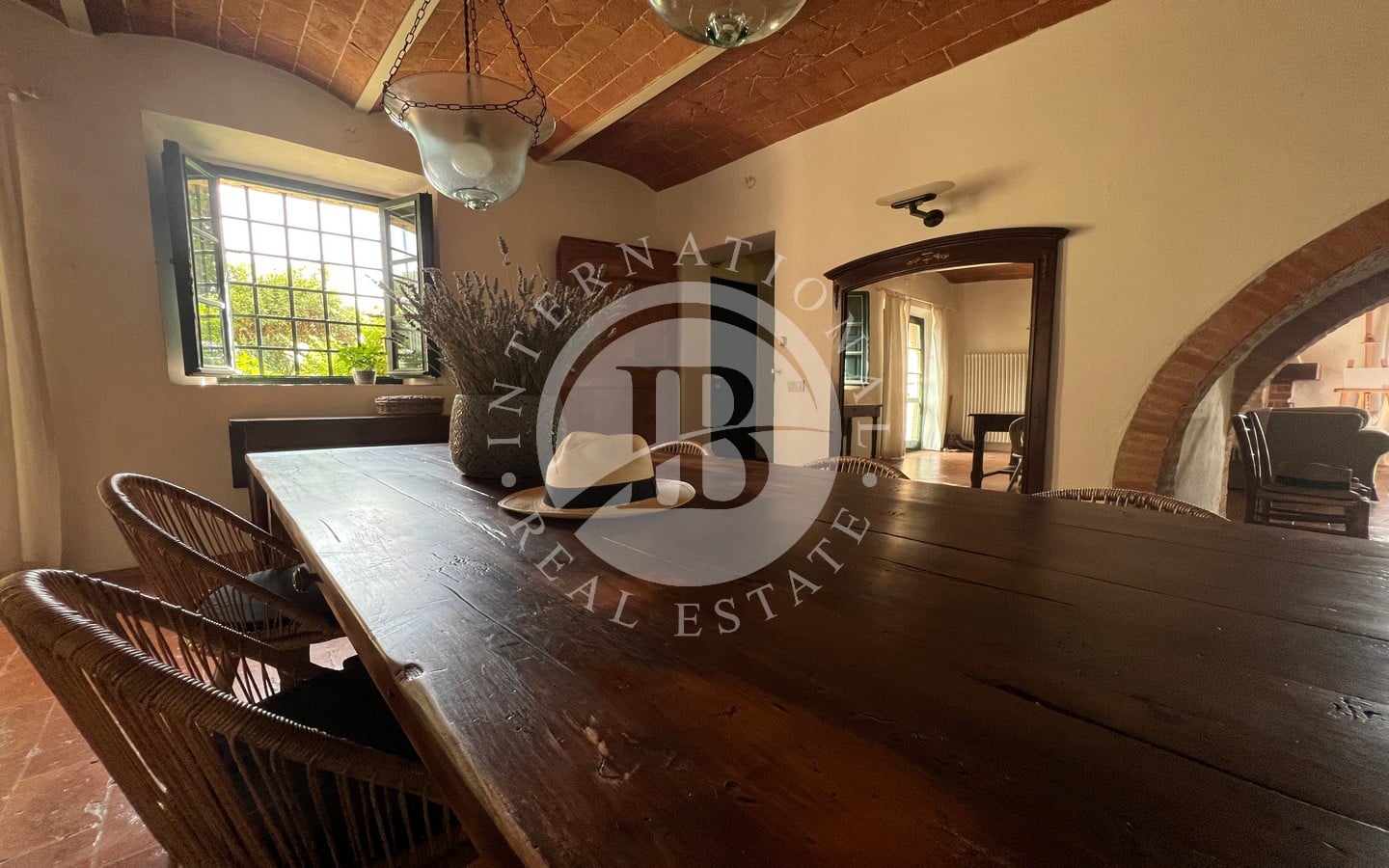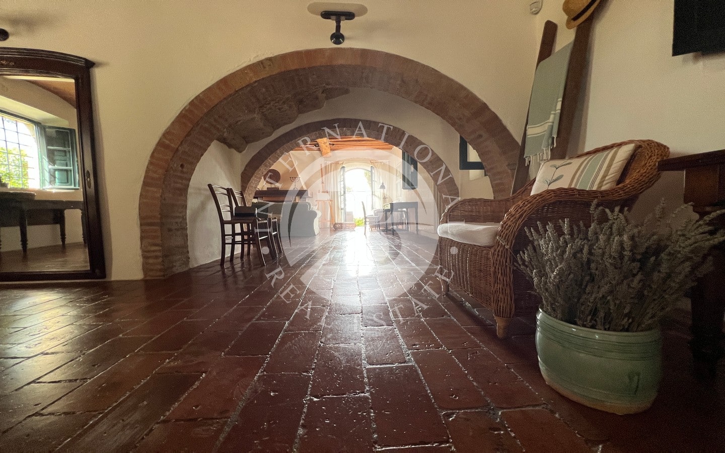 L'ingresso principale, con un portico in pietra, conduce a un ampio soggiorno caratterizzato da un tipico camino toscano. Splendidi archi separano la zona giorno dalla sala da pranzo e dalla cucina, quest'ultima affacciata sul giardino attraverso una porta finestra che conduce a una splendida area esterna dove poter pranzare all'aperto. Completano il piano terra un comodo bagno e un pratico ripostiglio.