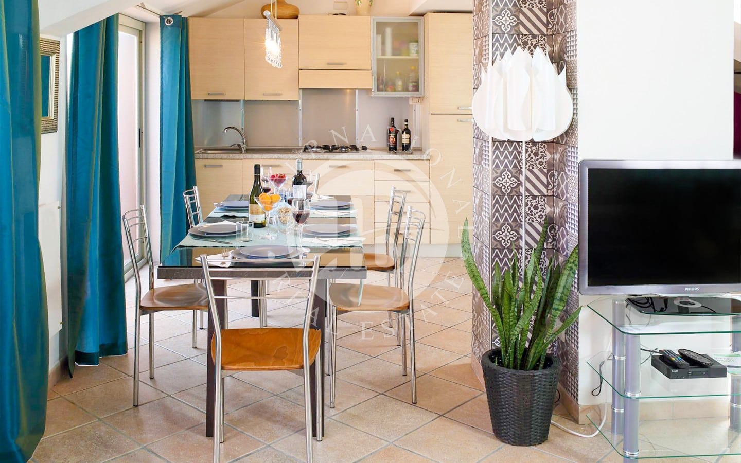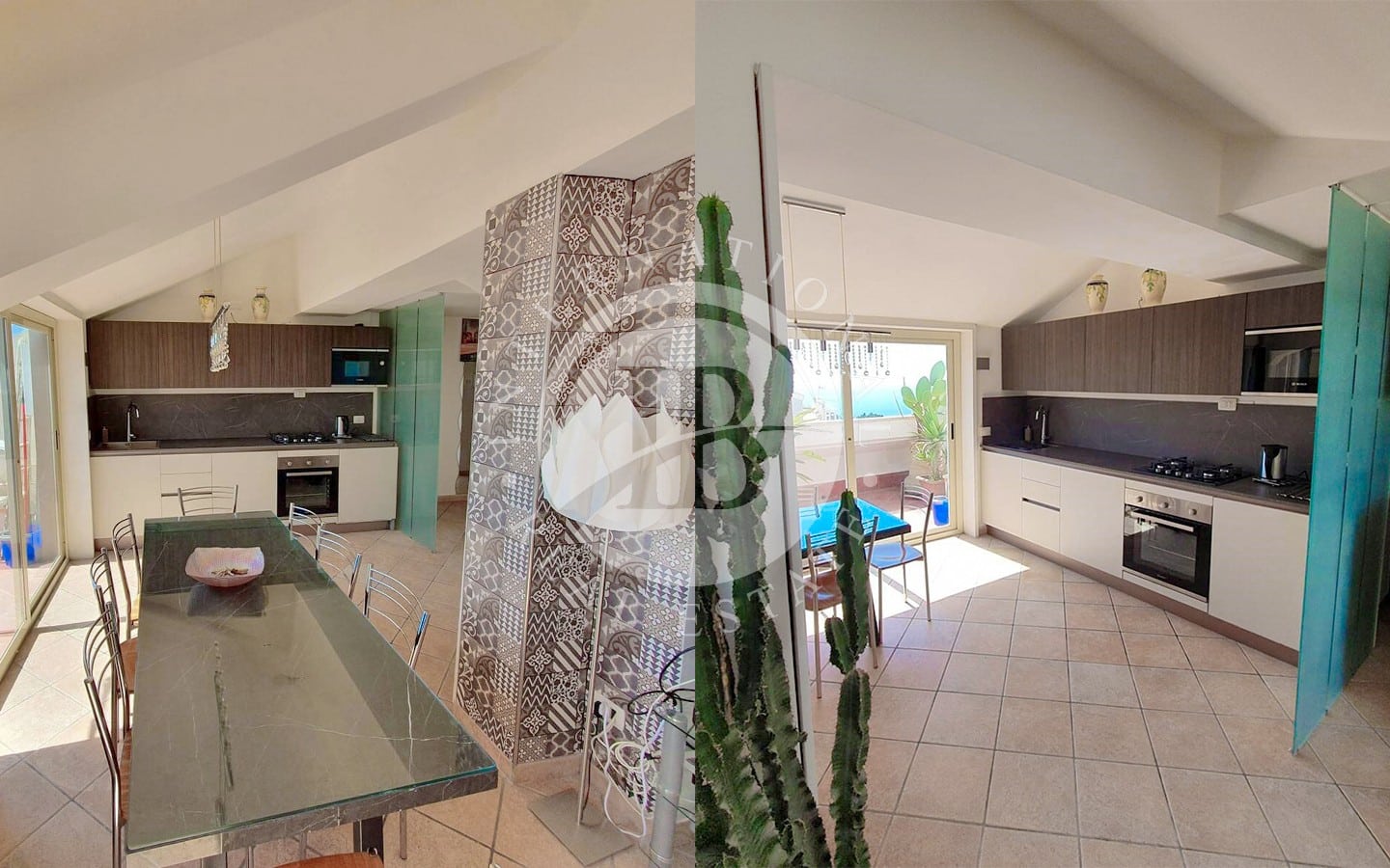 A pochi passi dal Centro Storico, in una zona tranquilla della città, proponiamo un attico unico e luminoso con viste spettacolari sulla Baia e sul Monte Etna.