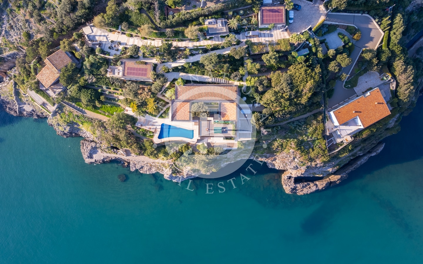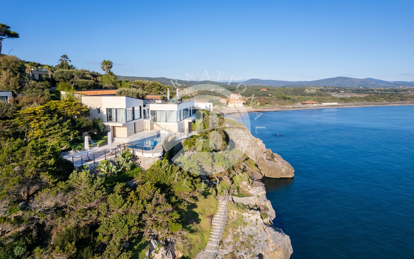 Il complesso offre viste panoramiche senza ostacoli sul mare aperto, con accesso diretto tramite 2 discese private verso l’acqua: una larga discesa che serve la Villa Patio, e una più intima che serve l’annesso, La Cuccia.