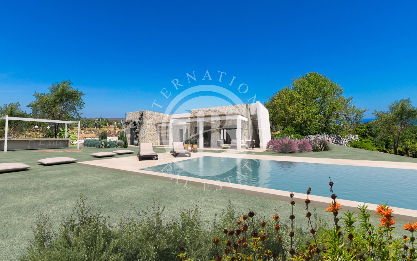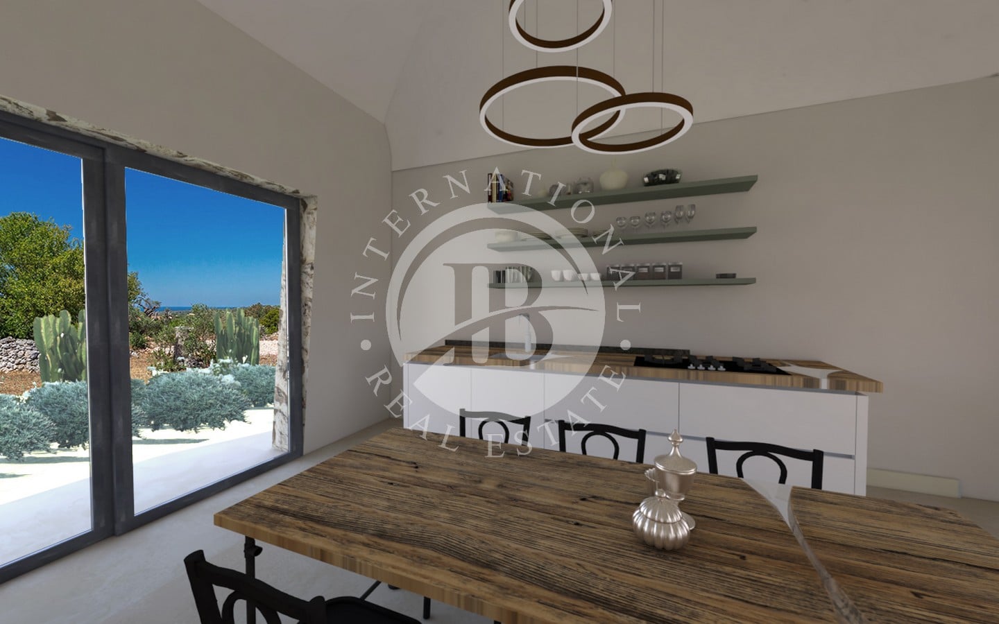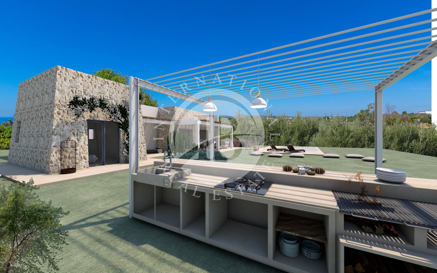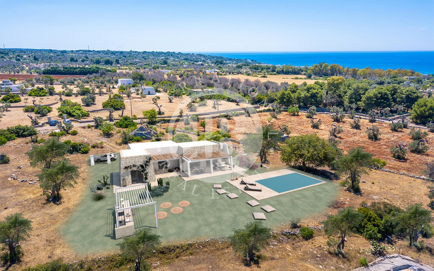 Grandi pergolati ombreggianti introducono agli interni, con ampio living, sala da pranzo e angolo cucina con doppia volta a stella, vista piscina e mare. La zona notte comprende due camere da letto con volta a botte, bagno di servizio e master bedroom con bagno en suite, tutte con ampie finestre sul giardino.