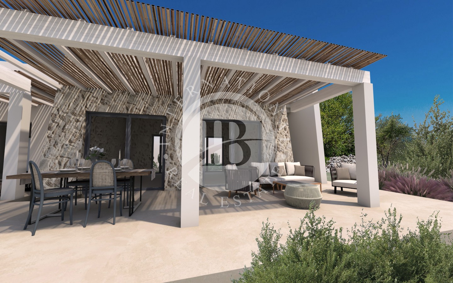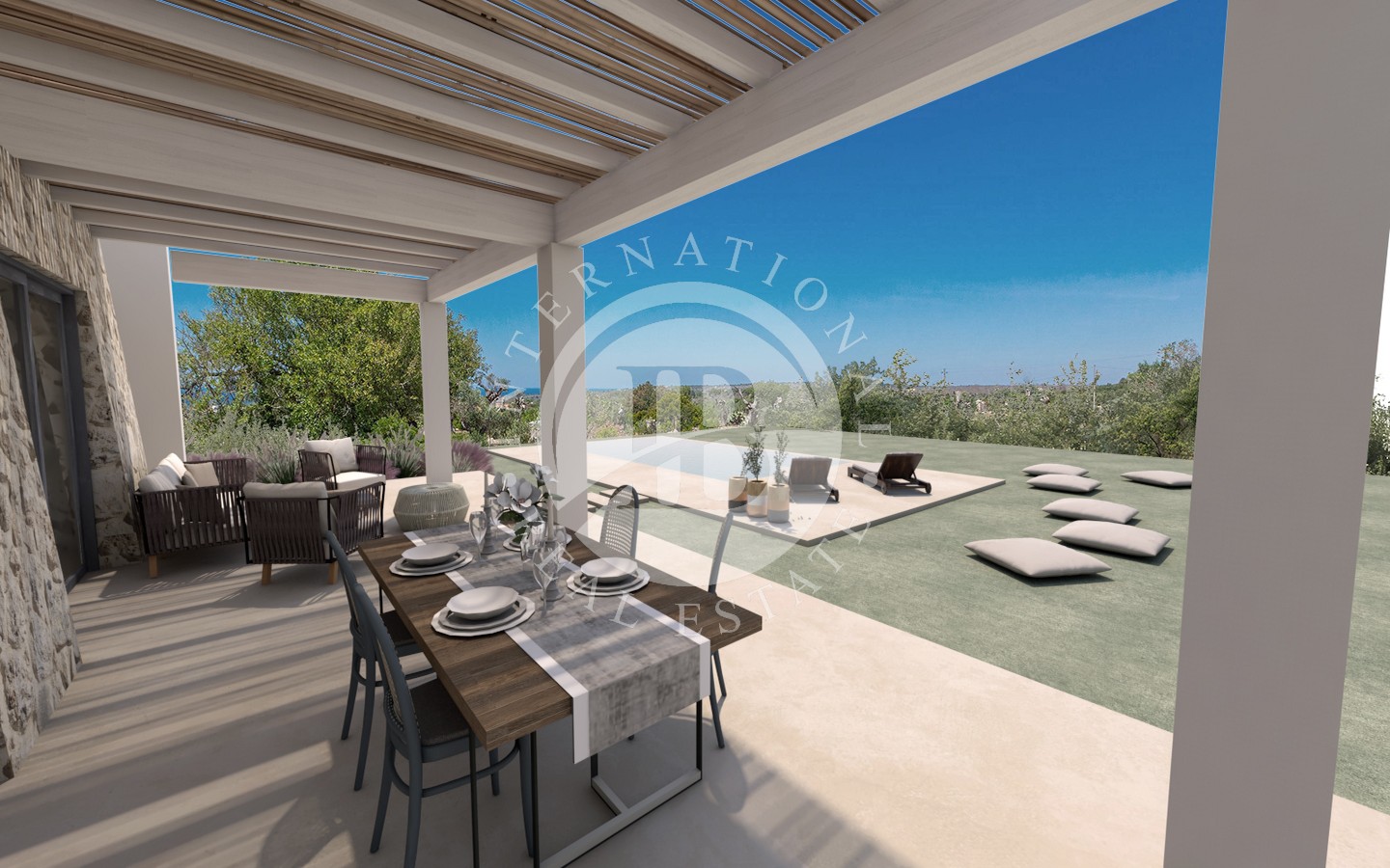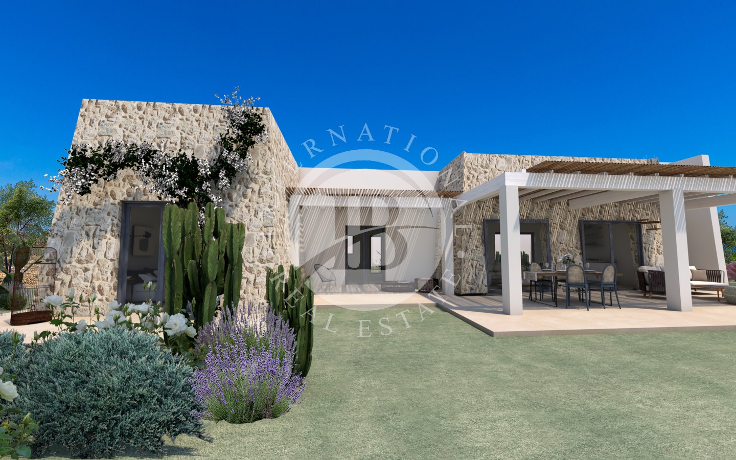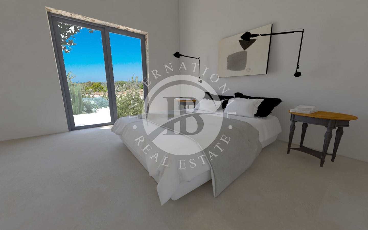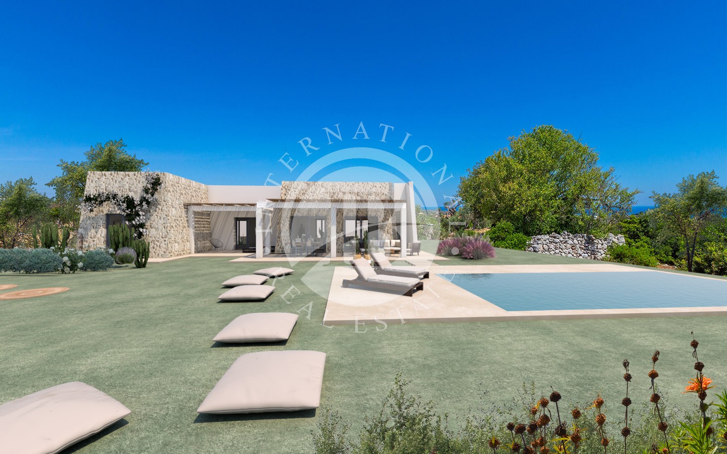 Grandi pergolati ombreggianti introducono agli interni, con ampio living, sala da pranzo e angolo cucina con doppia volta a stella, vista piscina e mare. La zona notte comprende due camere da letto con volta a botte, bagno di servizio e master bedroom con bagno en suite, tutte con ampie finestre sul giardino.