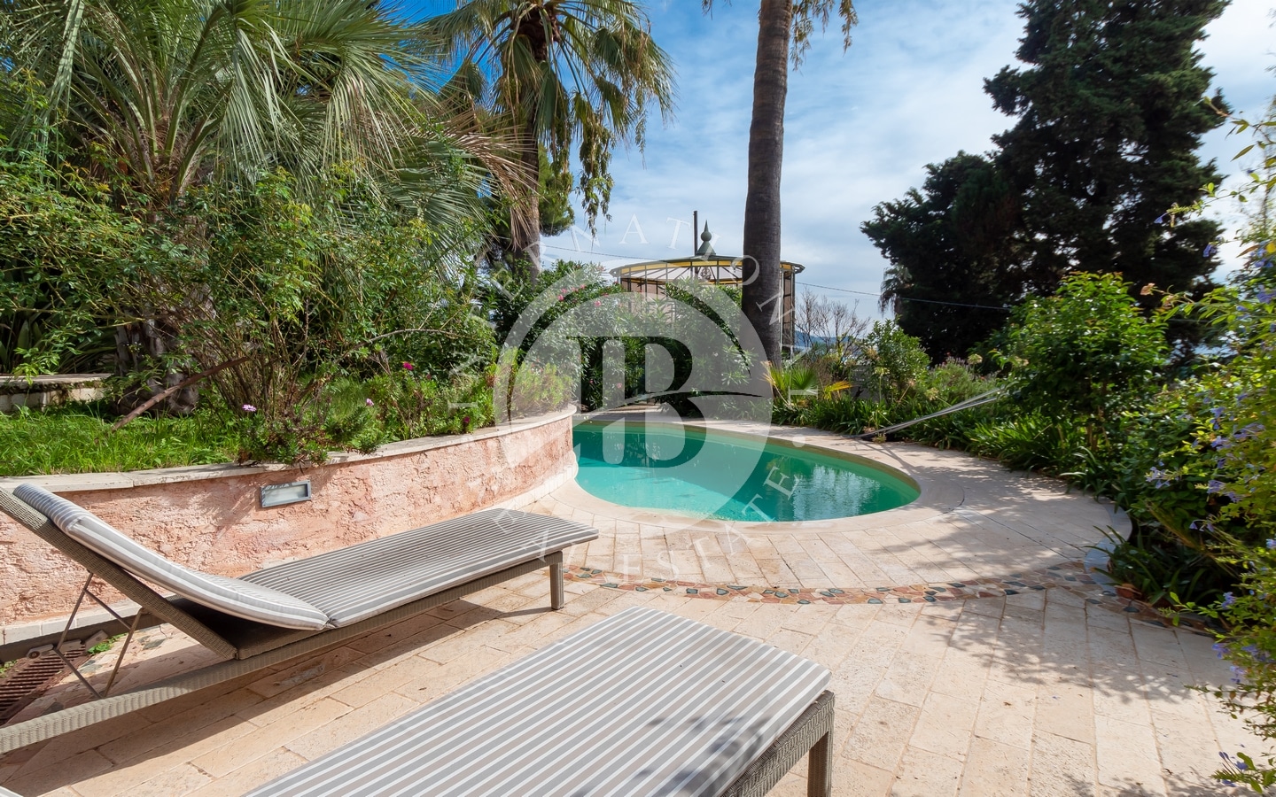 Il giardino di circa 1.000 mq offre totale privacy, con aree lastricate in pietra e zone di prato verde, arricchite da palme e fiori. Due grandi gazebo arredati con tavoli e divani creano spazi ideali per cene all'aperto e momenti di relax.