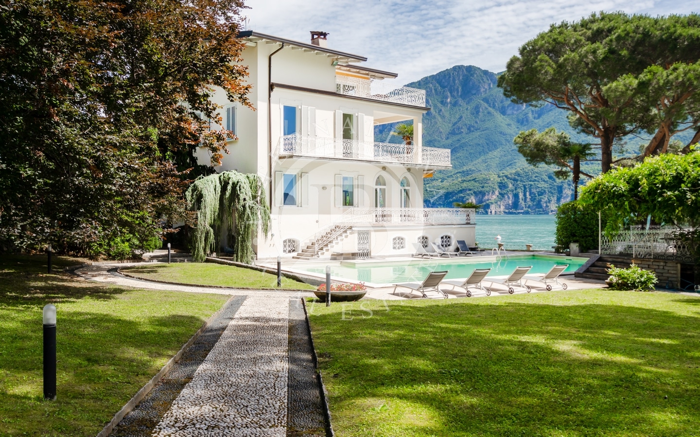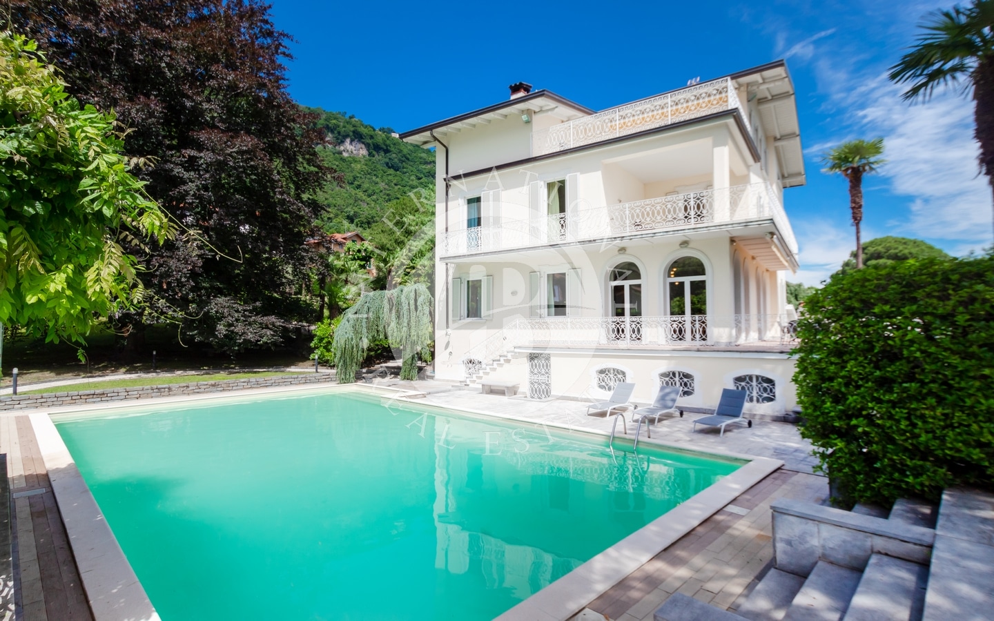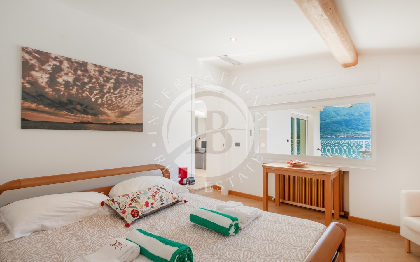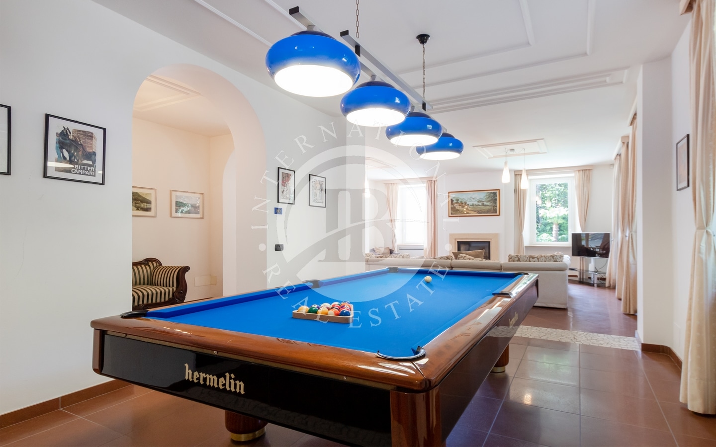 Recentemente ristrutturata, ospita al piano terrala zona giorno con ingresso, la cucina, un ampio soggiorno con camino, una sala da biliardo e una grande terrazza di 50 mq affacciata sulla piscina e sul lago; al primo piano, ci sono tre camere da letto, ciascuna con bagno privato, e due ulteriori camere che si affacciano sulla terrazza coperta di 40 mq; infine, all'ultimo piano, si trova un'incantevole attico indipendente di 130 mq, composta da un spazioso soggiorno, cucina, studio, camera matrimoniale, cameretta, bagno e una splendida terrazza vista lago di 30 mq.