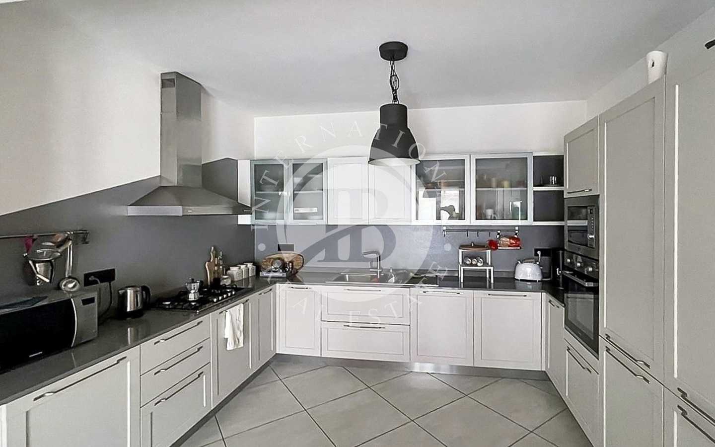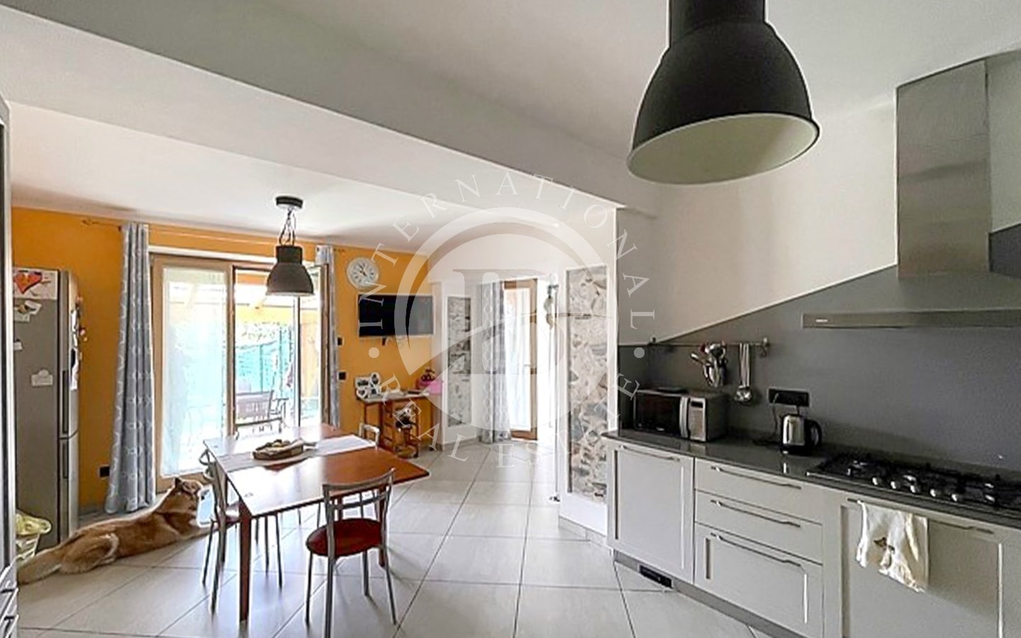 Piano terra: Ingresso, vano scala, ampio disimpegno, bagno, grande cucina/pranzo con arredi di qualità, salone con zona relax e TV, e ampie vetrate che si affacciano sul terrazzo esterno e sul giardino attrezzato.