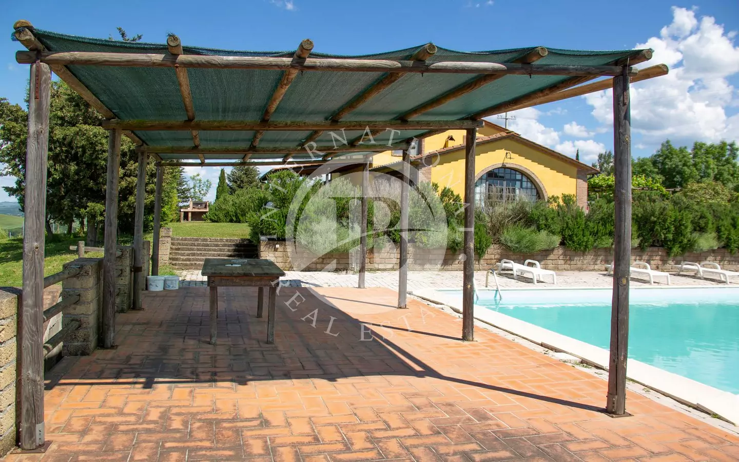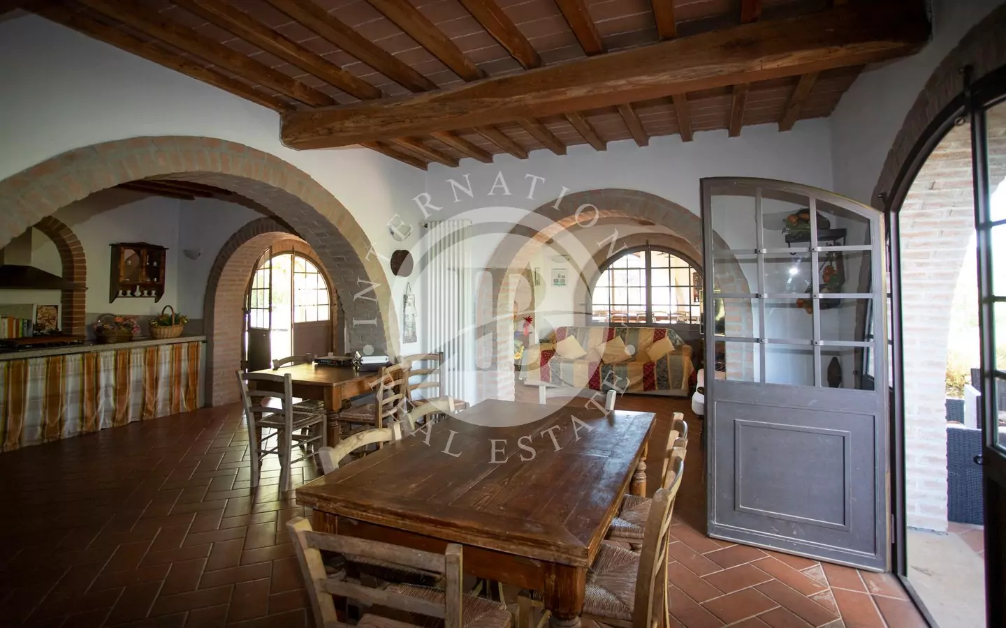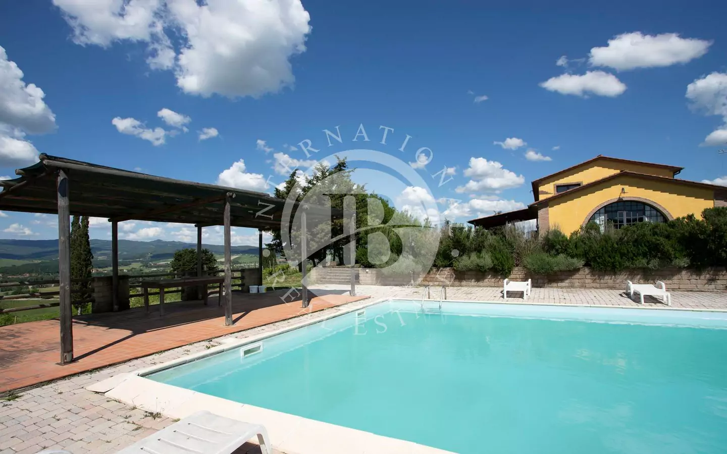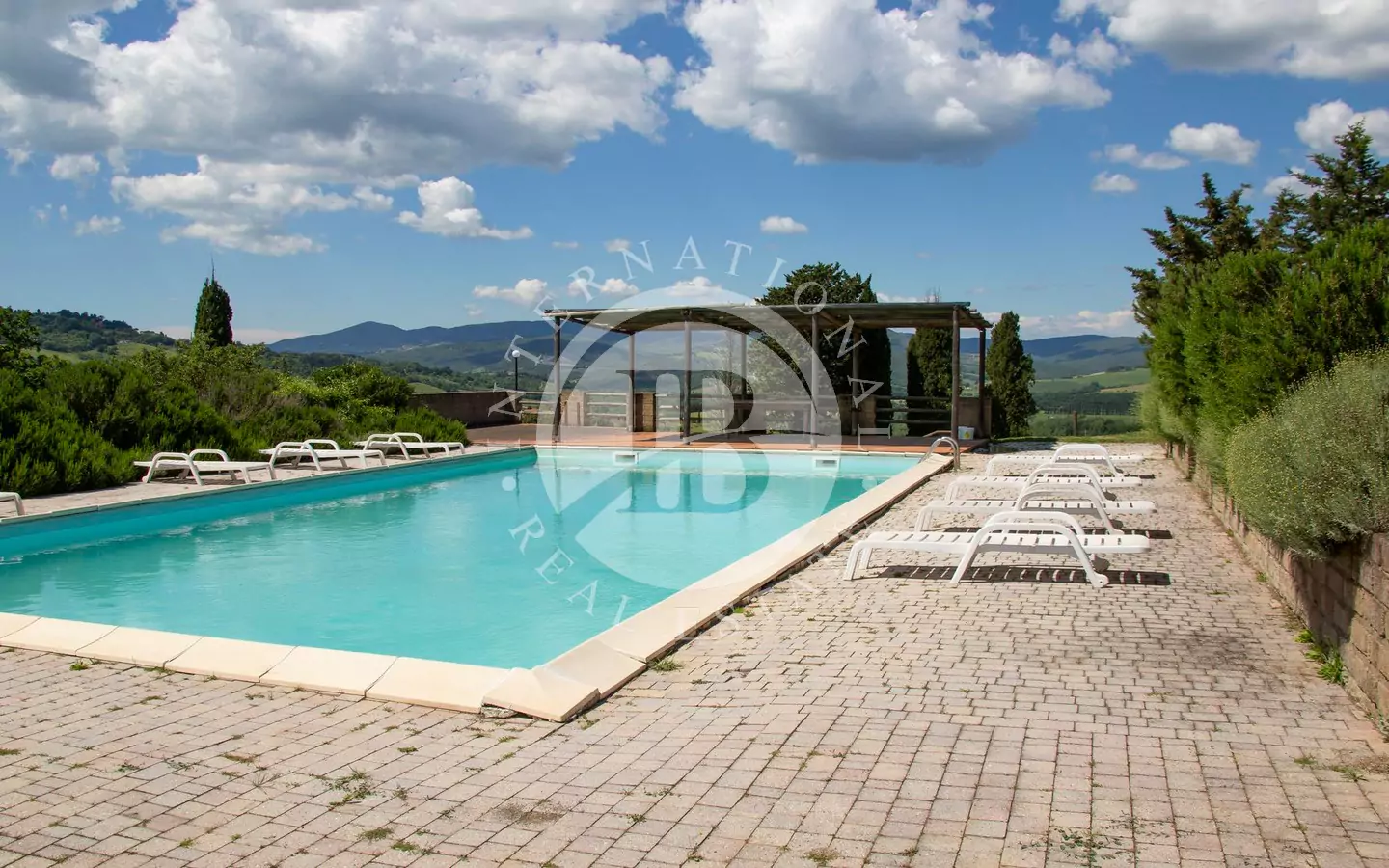 L'immobile è di circa 350 mq,si sviluppa su due piani fuori terra e si compone al piano terra da grande salone, con affaccio su di un portico dal quale si può godere di una vista panoramica sulla vallata e sui paesi di Volterra,Querceto e Casaglia,cucina abitabile attrezzata con elettrodomestici di ultima generazione, e due servizi igienici; al piano superiore troviamo quattro camere matrimoniali e bagno.La proprietà è circondata da 5.000mq di terreno piantumato parte ad oliveta e parte a vigna e comprende un locale tecnico, due carraie, una piscina di ml. 7,2 x 14,40 con solarium e relativo locale tecnico seminterrato di circa 65mq.
