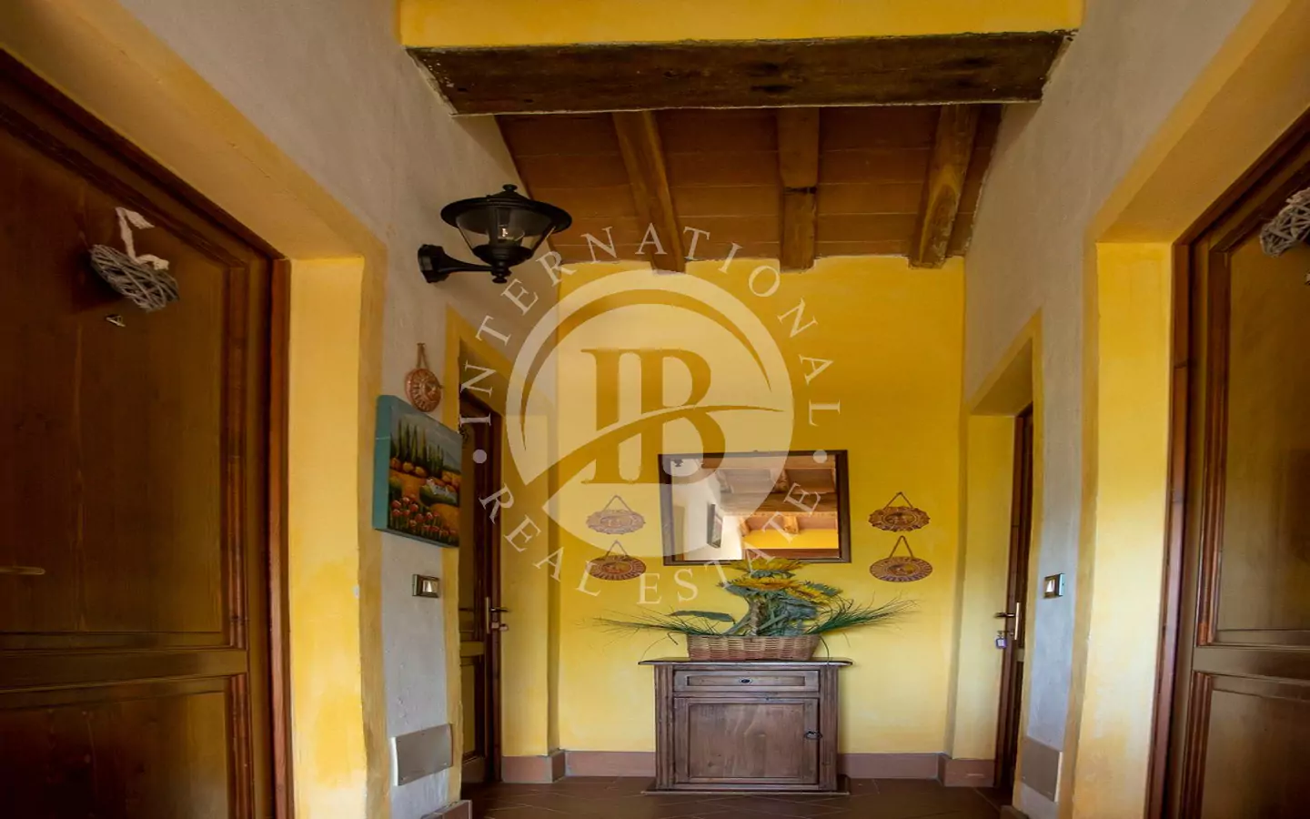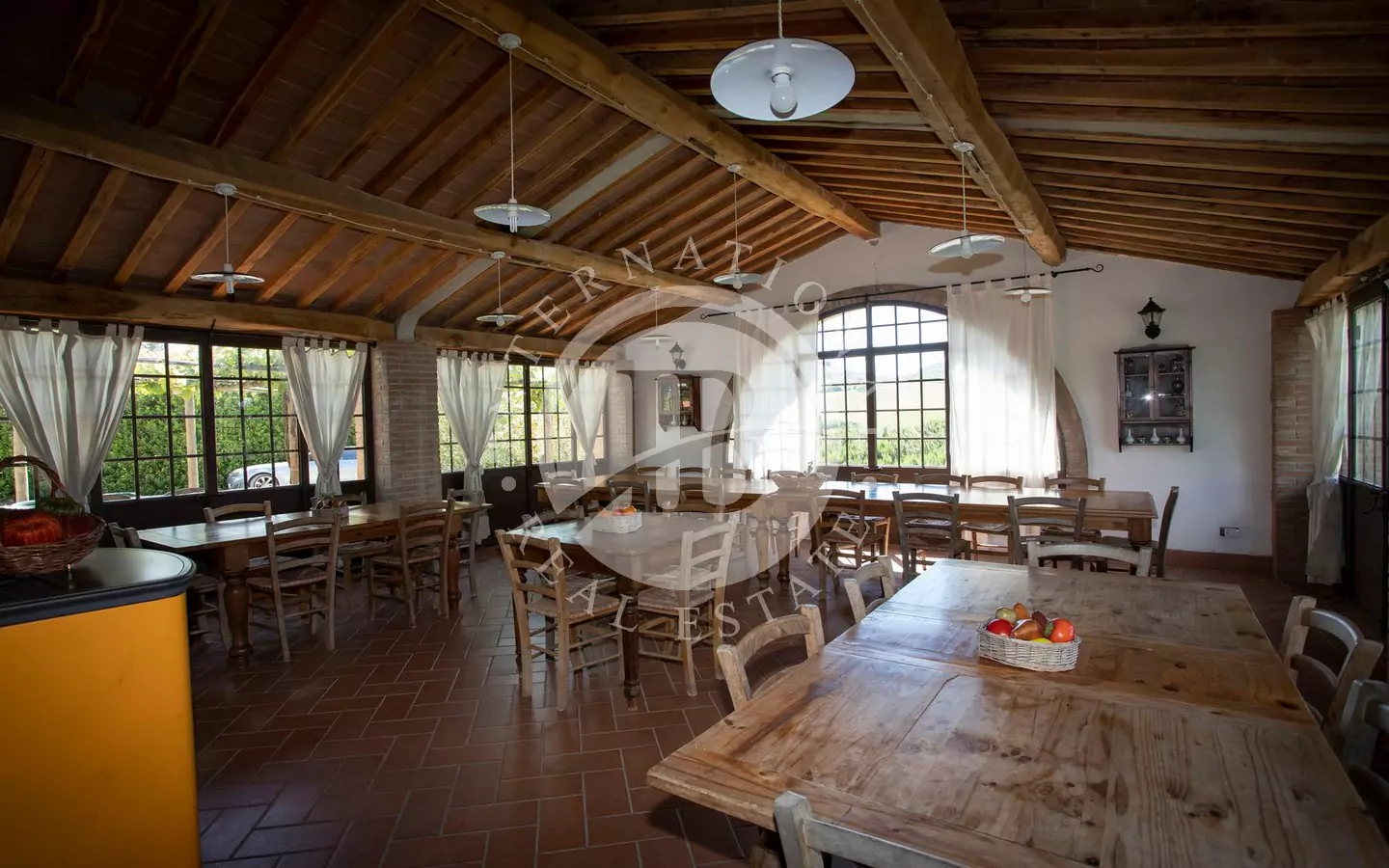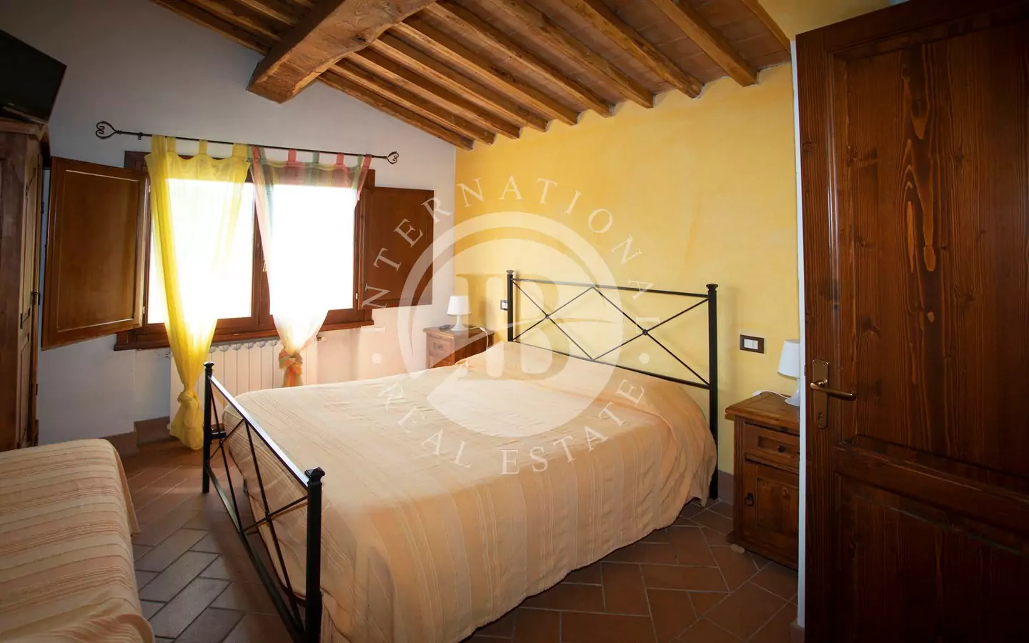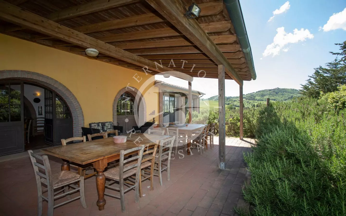 L'immobile è di circa 350 mq,si sviluppa su due piani fuori terra e si compone al piano terra da grande salone, con affaccio su di un portico dal quale si può godere di una vista panoramica sulla vallata e sui paesi di Volterra,Querceto e Casaglia,cucina abitabile attrezzata con elettrodomestici di ultima generazione, e due servizi igienici; al piano superiore troviamo quattro camere matrimoniali e bagno.La proprietà è circondata da 5.000mq di terreno piantumato parte ad oliveta e parte a vigna e comprende un locale tecnico, due carraie, una piscina di ml. 7,2 x 14,40 con solarium e relativo locale tecnico seminterrato di circa 65mq.