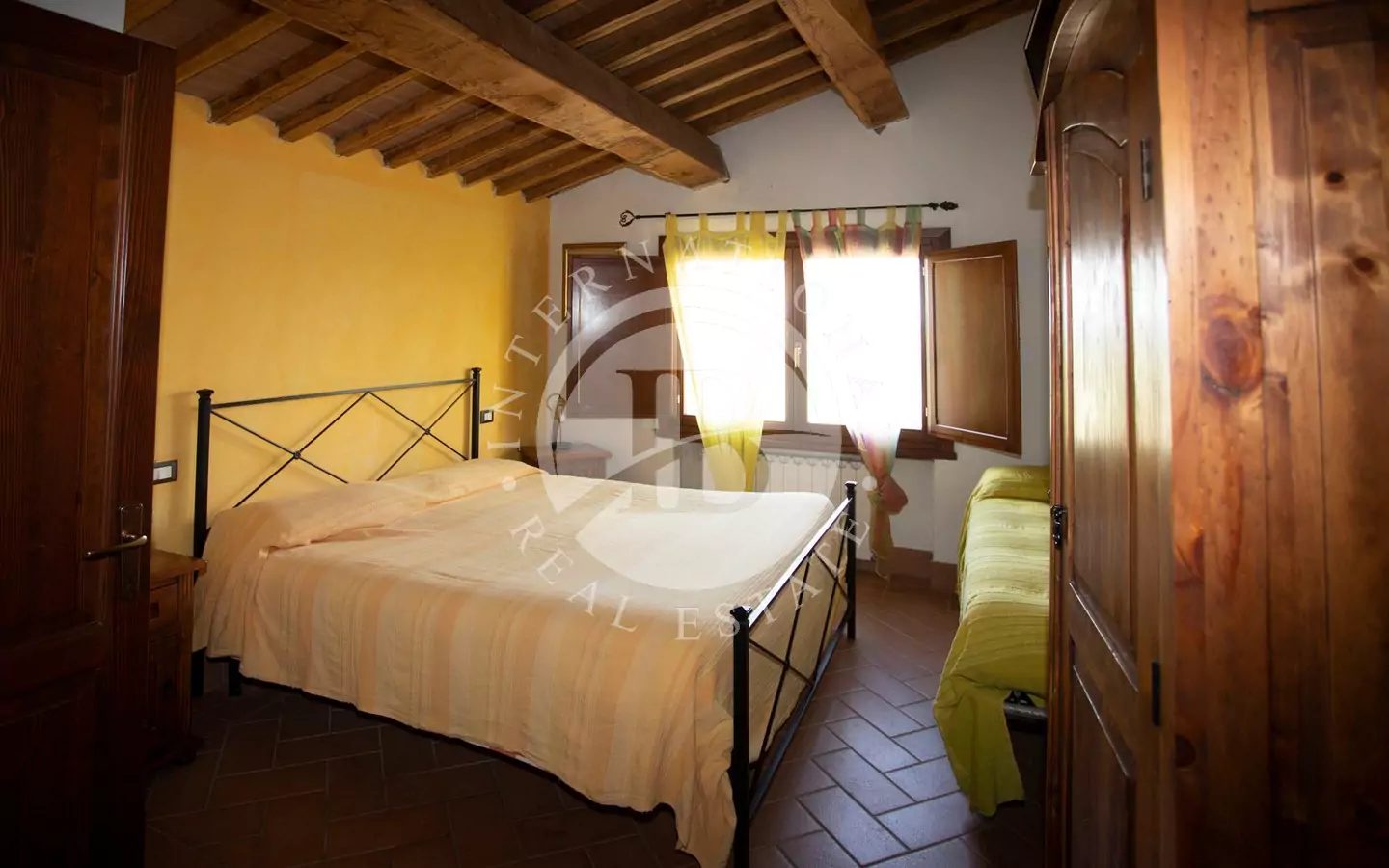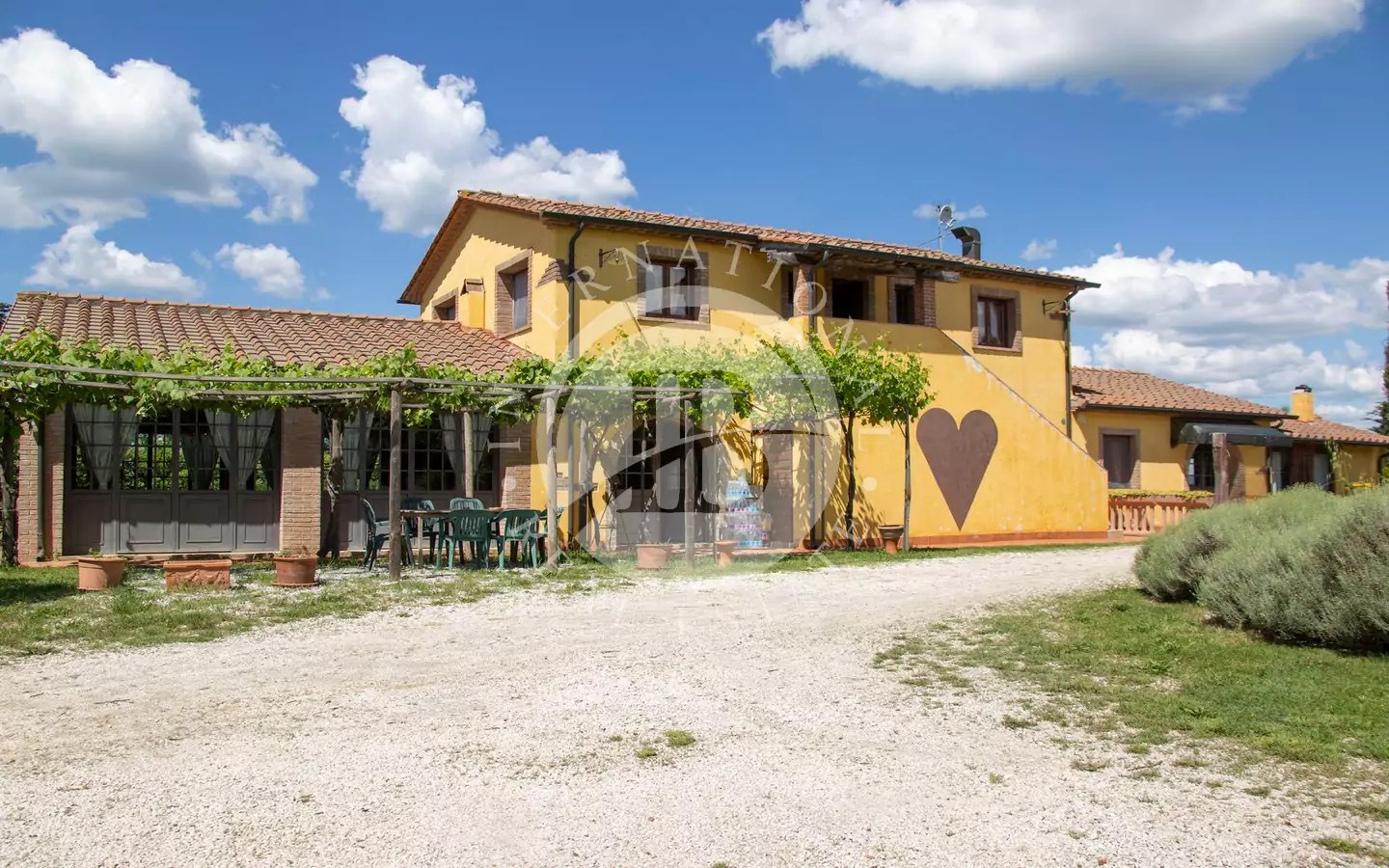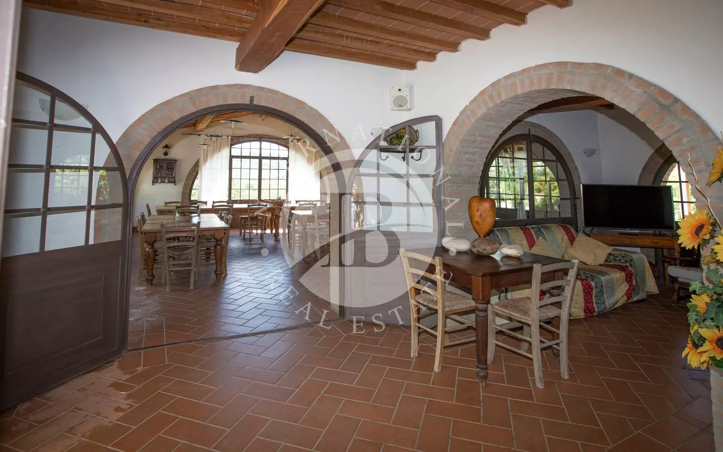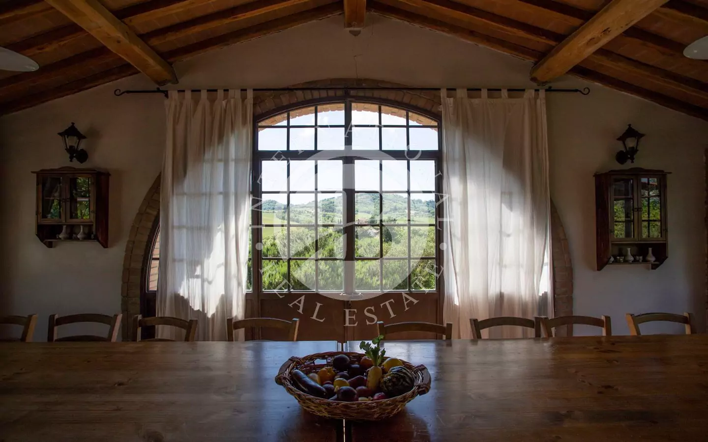 L'immobile è di circa 350 mq,si sviluppa su due piani fuori terra e si compone al piano terra da grande salone, con affaccio su di un portico dal quale si può godere di una vista panoramica sulla vallata e sui paesi di Volterra,Querceto e Casaglia,cucina abitabile attrezzata con elettrodomestici di ultima generazione, e due servizi igienici; al piano superiore troviamo quattro camere matrimoniali e bagno.La proprietà è circondata da 5.000mq di terreno piantumato parte ad oliveta e parte a vigna e comprende un locale tecnico, due carraie, una piscina di ml. 7,2 x 14,40 con solarium e relativo locale tecnico seminterrato di circa 65mq.