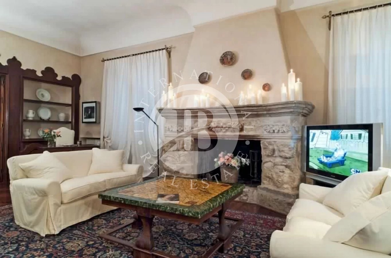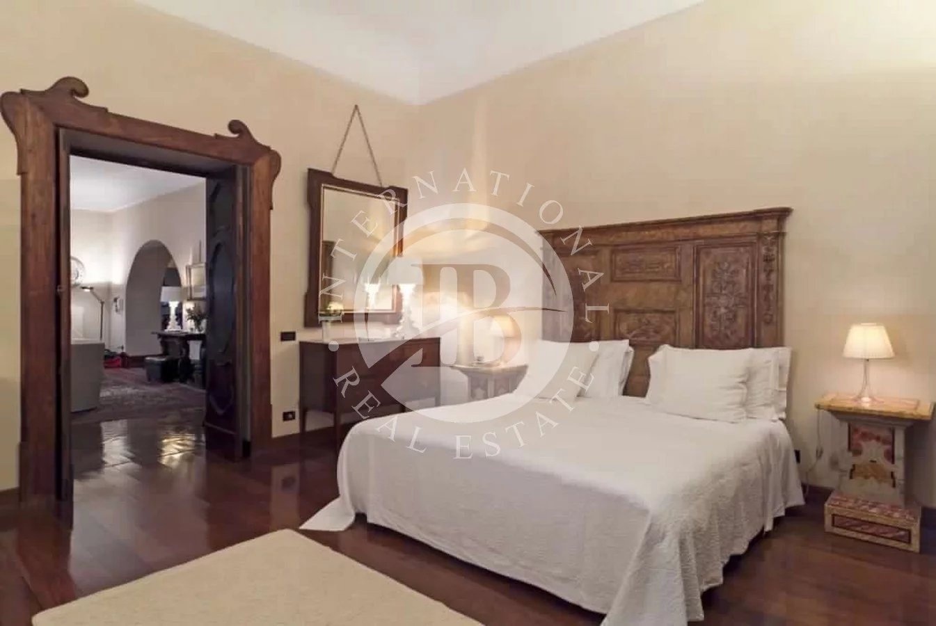 L'ingresso conduce a un salotto molto ampio con tre aree salotto separate. A destra, la sala da pranzo conduce ad una splendida terrazza coperta con vista sul giardino e sulla piscina. Sul lato opposto della zona giorno sono due camere matrimoniali con bagno privato (uno con vasca idromassaggio e attacco doccia, uno con vasca e doccia). Vicino alla porta d'ingresso è una camera matrimoniale / doppia con bagno con doccia e la scala che porta ad un primo piano con un'altra camera doppia / matrimoniale, anche con bagno con doccia. Oltre il soggiorno è la grande cucina, la lavanderia e la quinta camera da letto, una doppia con bagno privato con doccia. L'ultima camera da letto, numero sei, è una doppia (che può essere utilizzata come un gemello grazie alla presenza di un divano letto), situata dall'altra parte del cortile rispetto alla cucina e accessibile solo esternamente. Ha un bagno con doccia. Gli interni sono tutti riccamente decorati con un gusto impeccabile.