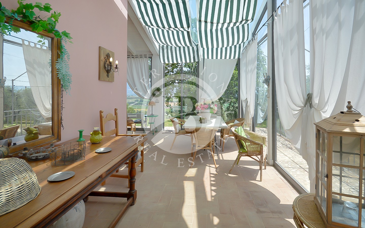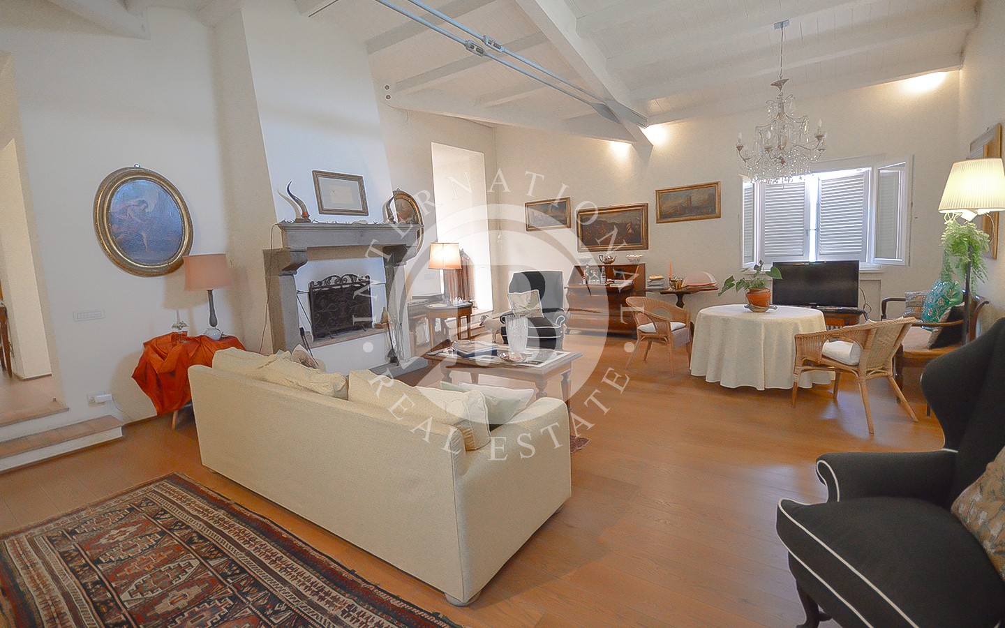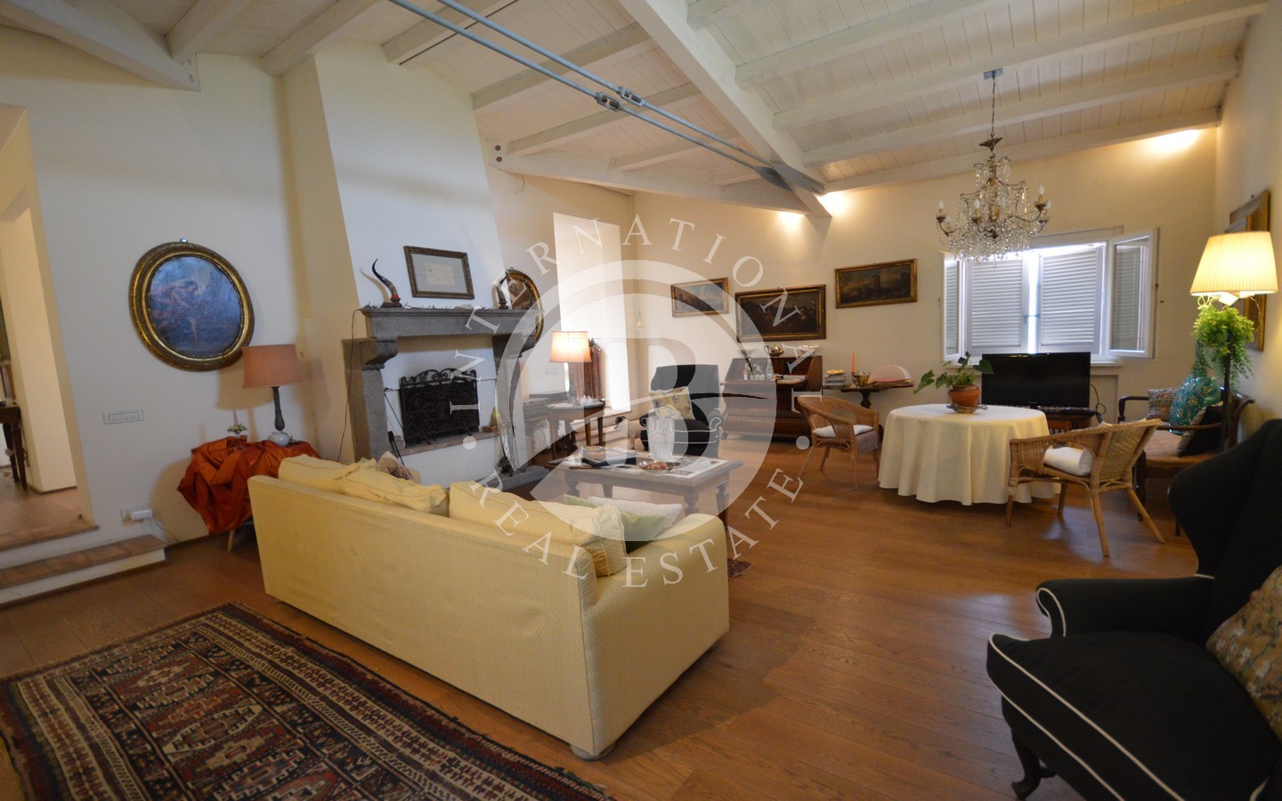 Il piano terra comprende un ingresso, un bagno di servizio, cucina, un ampio soggiorno con un magnifico camino antico del 1500 e travi a vista nel soffitto, con accesso alla grande veranda, un salotto, 2 camere matrimoniali con bagno privato (una con doccia e l’altra con vasca) e terrazza panoramica.