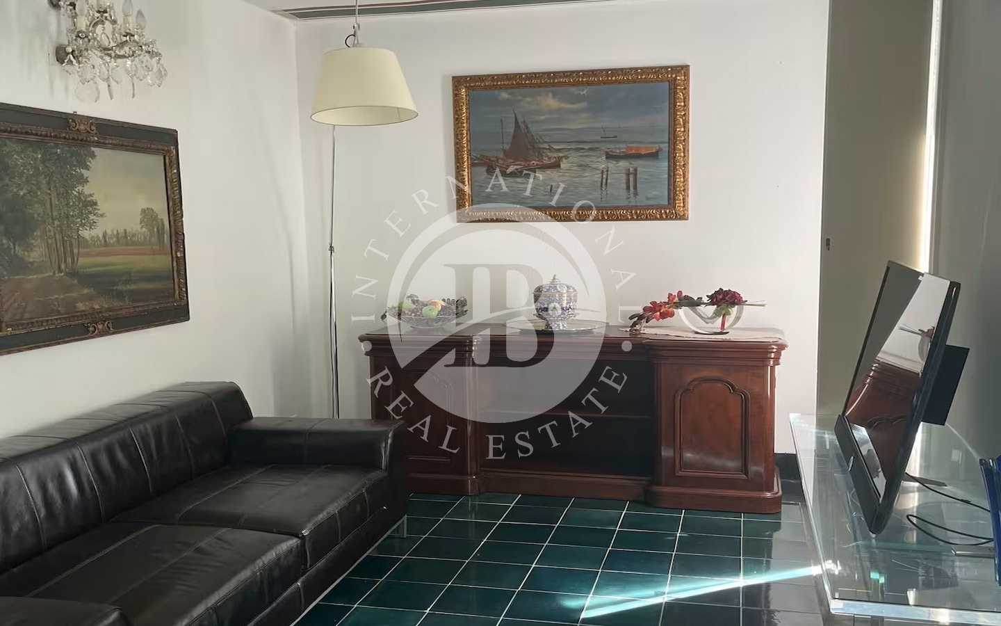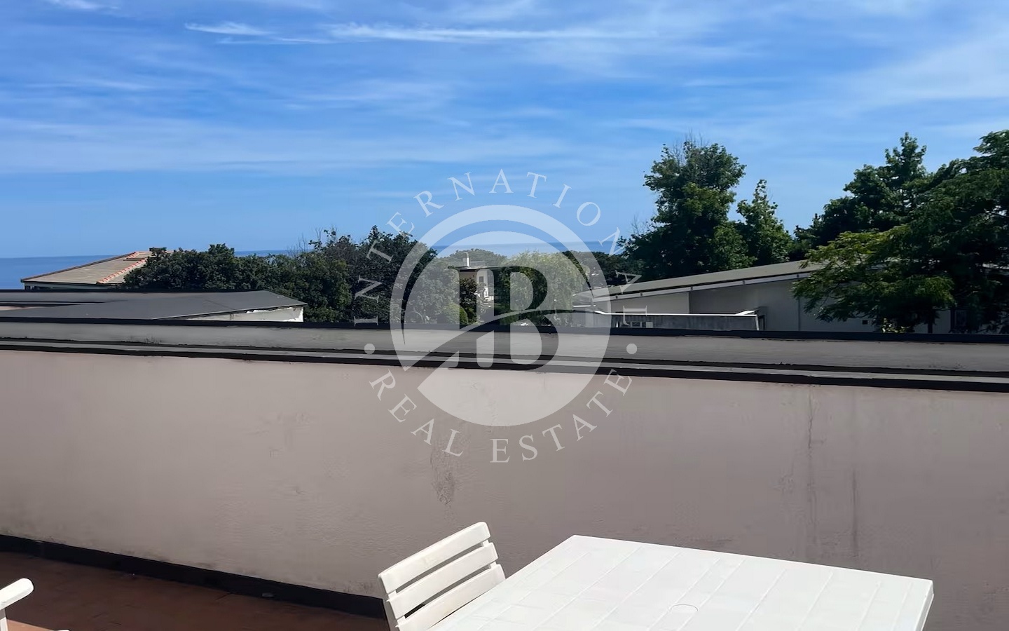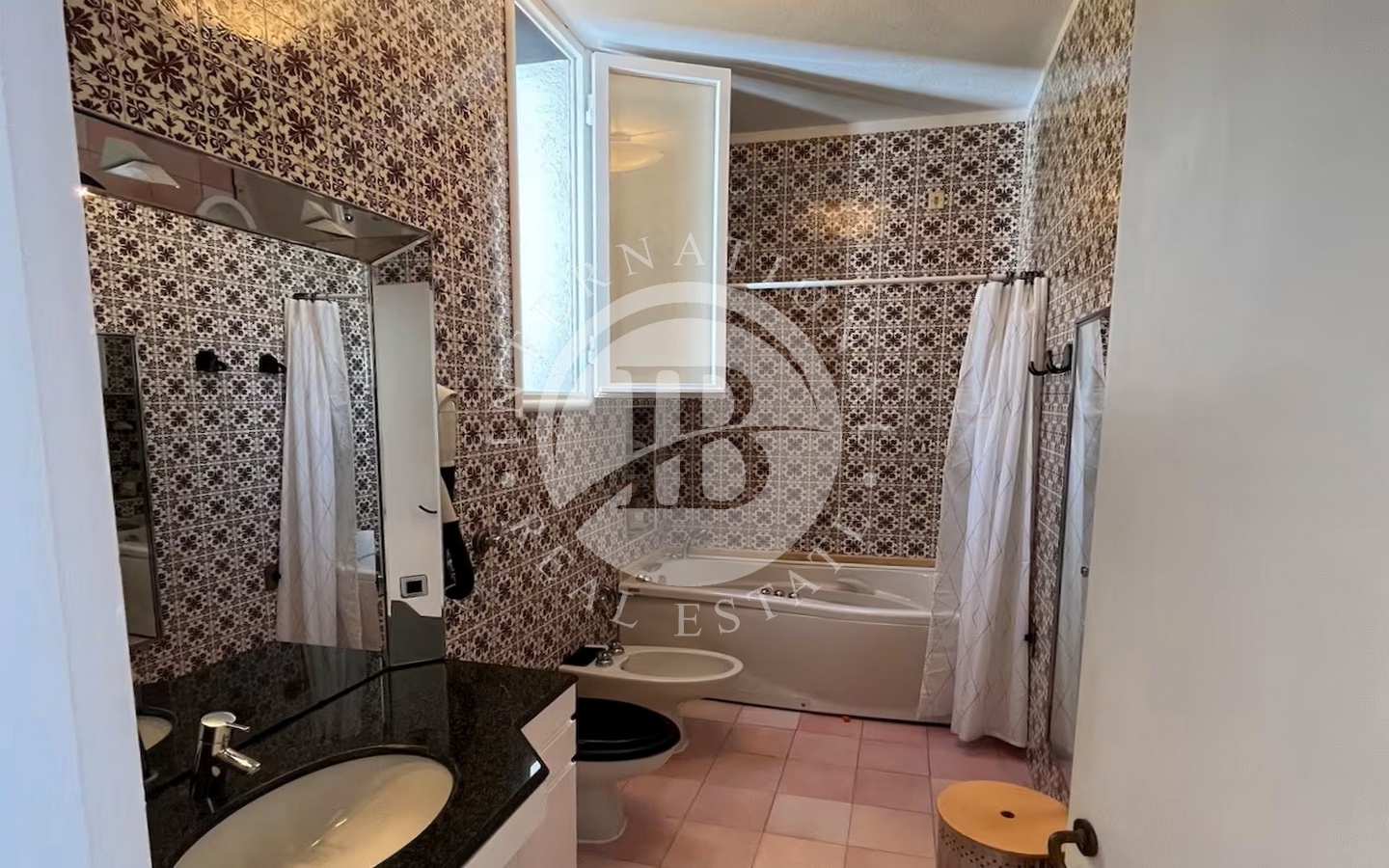 La seconda unità si sviluppa tra il piano terra e i due livelli superiori: al piano d’ingresso si trova il soggiorno con angolo cottura, al primo piano la zona notte con tre camere da letto, tre bagni e una terrazza panoramica vista mare. Il terzo livello ospita un ampio lastrico solare.