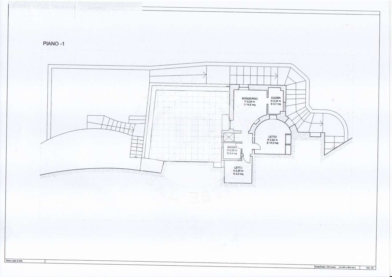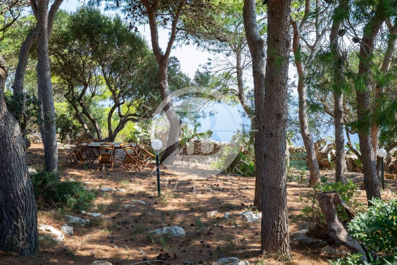 Il giardino terrazzato presenta ulivi, pini, e piante mediterranee, creando un ambiente unico. Le scale esterne conducono ai vari terrazzi e giardini privati, ideali per installare pergolati o aree relax. La villa è adatta anche a un lussuoso B&B, con possibilità di realizzare 5 camere con altrettanti bagni. Ogni terrazzo offre una vista panoramica unica sulla costa del Salento.