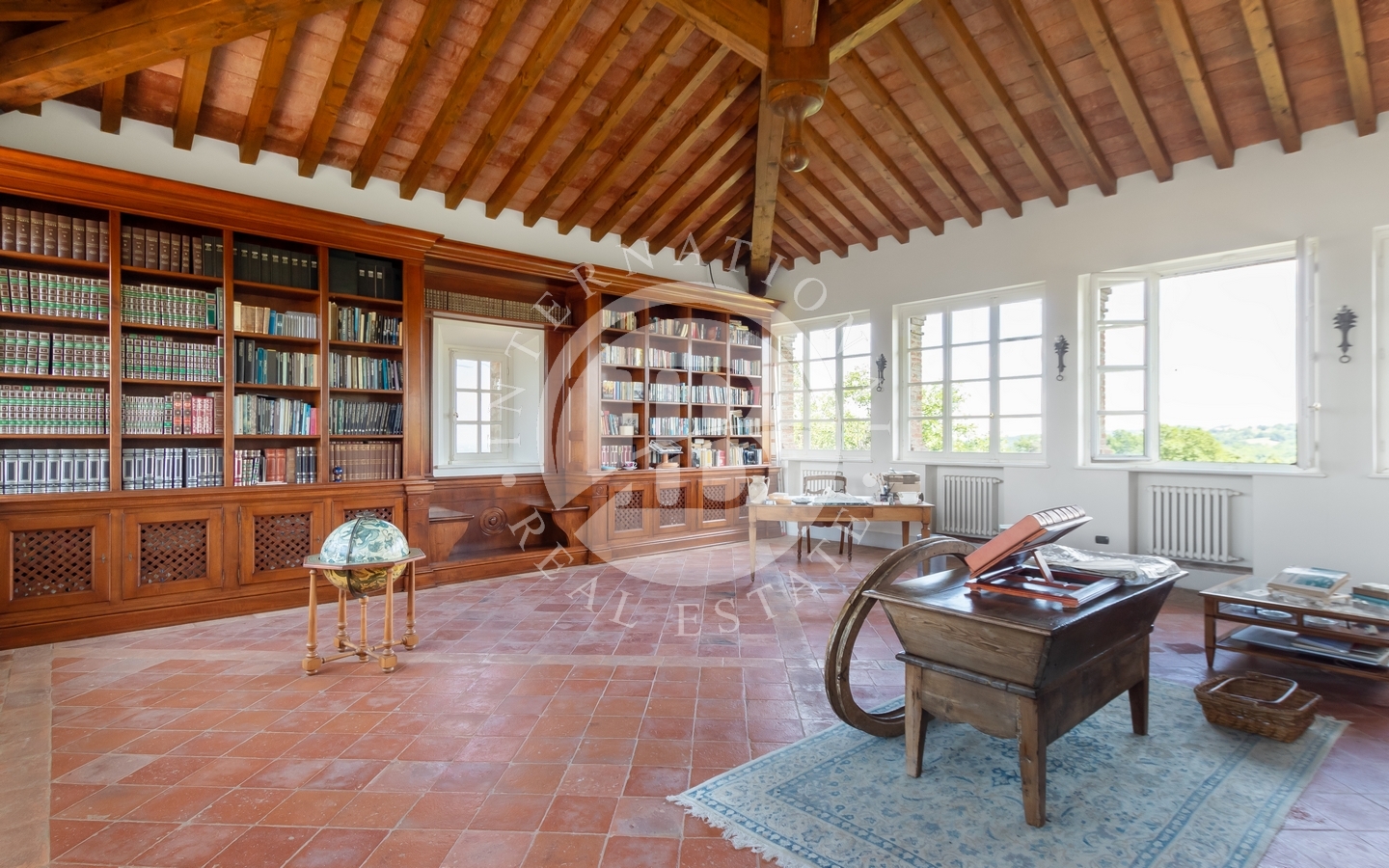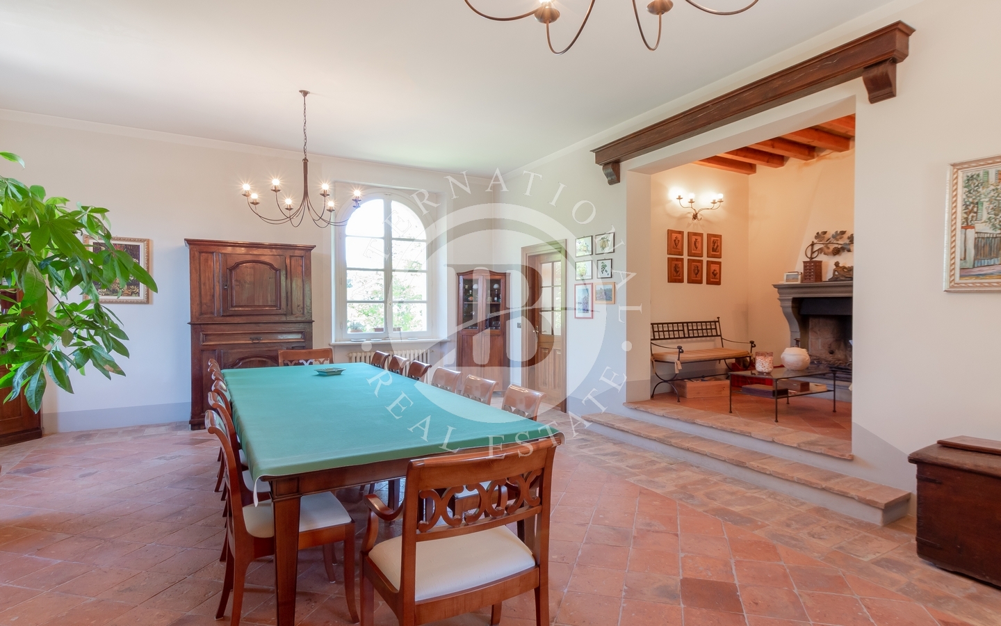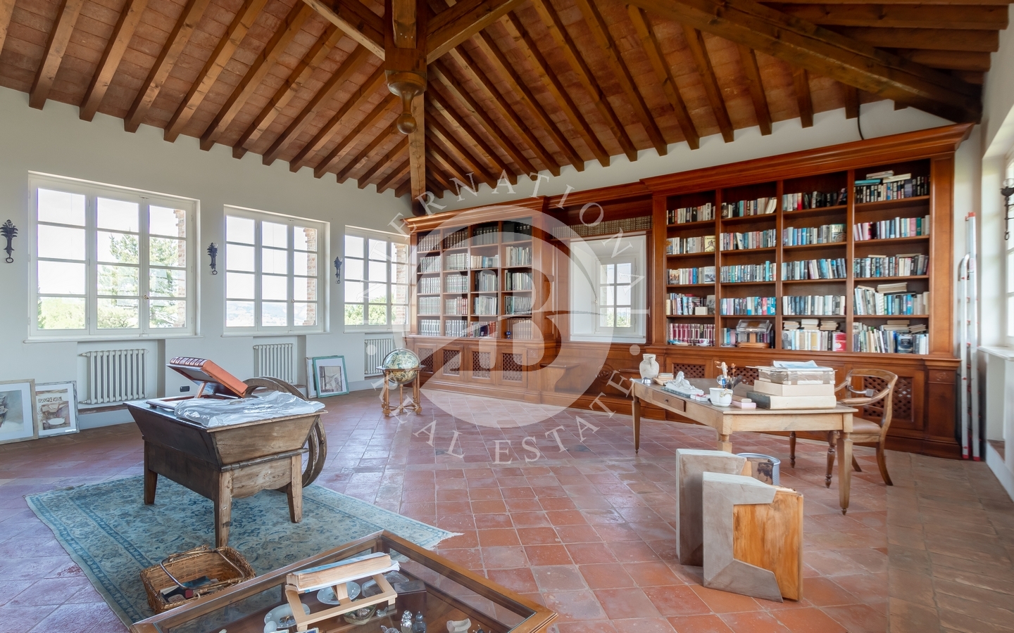 La villa principale si sviluppa su due livelli collegati da ascensore interno. Il piano terra accoglie un sontuoso ingresso, una spaziosa cucina, un salone nobile e una raffinata sala da pranzo impreziosita da camino. Al piano superiore, la zona notte ospita la camera padronale e sette camere da letto luminose, grazie alla perfetta esposizione. L’ultimo piano è dedicato a una suggestiva biblioteca e a un affascinante open space di 250 mq. Finiture di altissimo pregio, progettate da Bontempi, includono pavimenti in marmo decorato a mano, parquet, cotto antico e travi in legno monumentali. Completano la residenza una cantina e un ampio garage di circa 200 mq.