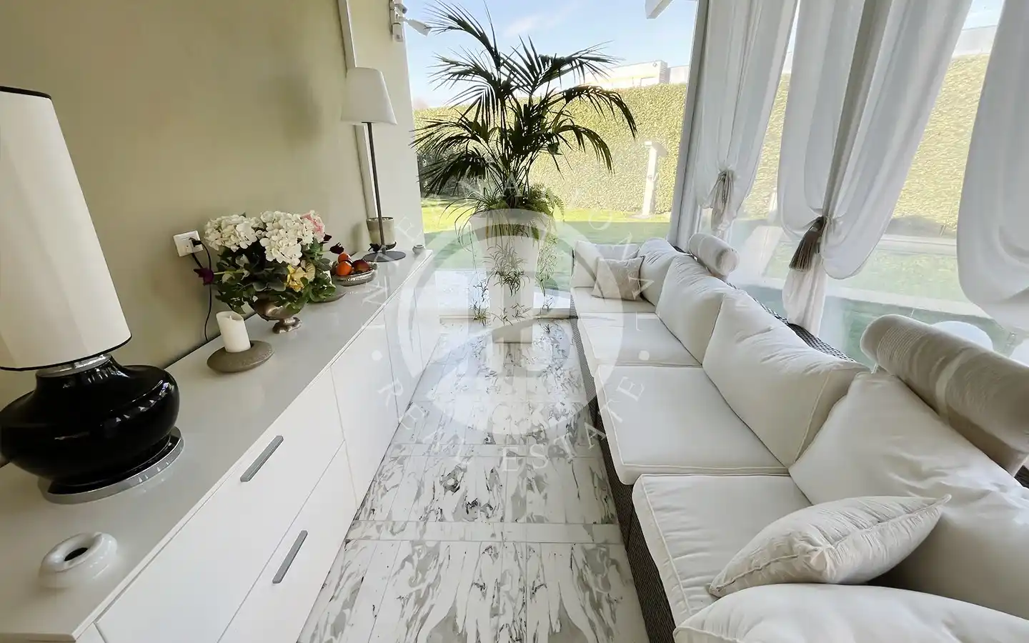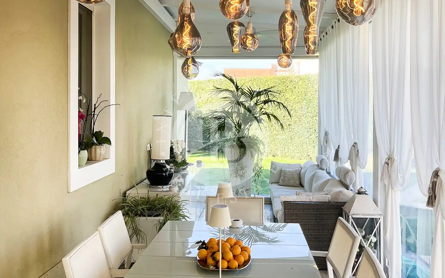 Sul lato giardino, la villa offre un raffinato pergolato arredato come vera e propria zona living all’aperto, completo di tavolo da pranzo e area relax. Le chiusure laterali con ampie aperture elettrificate permettono di vivere questo spazio in ogni stagione.