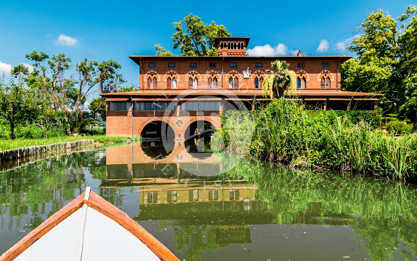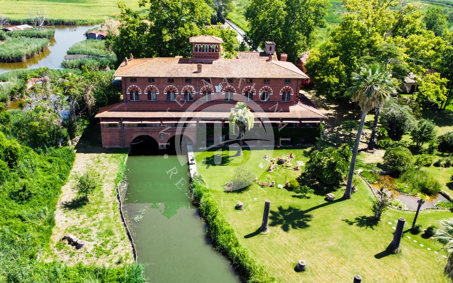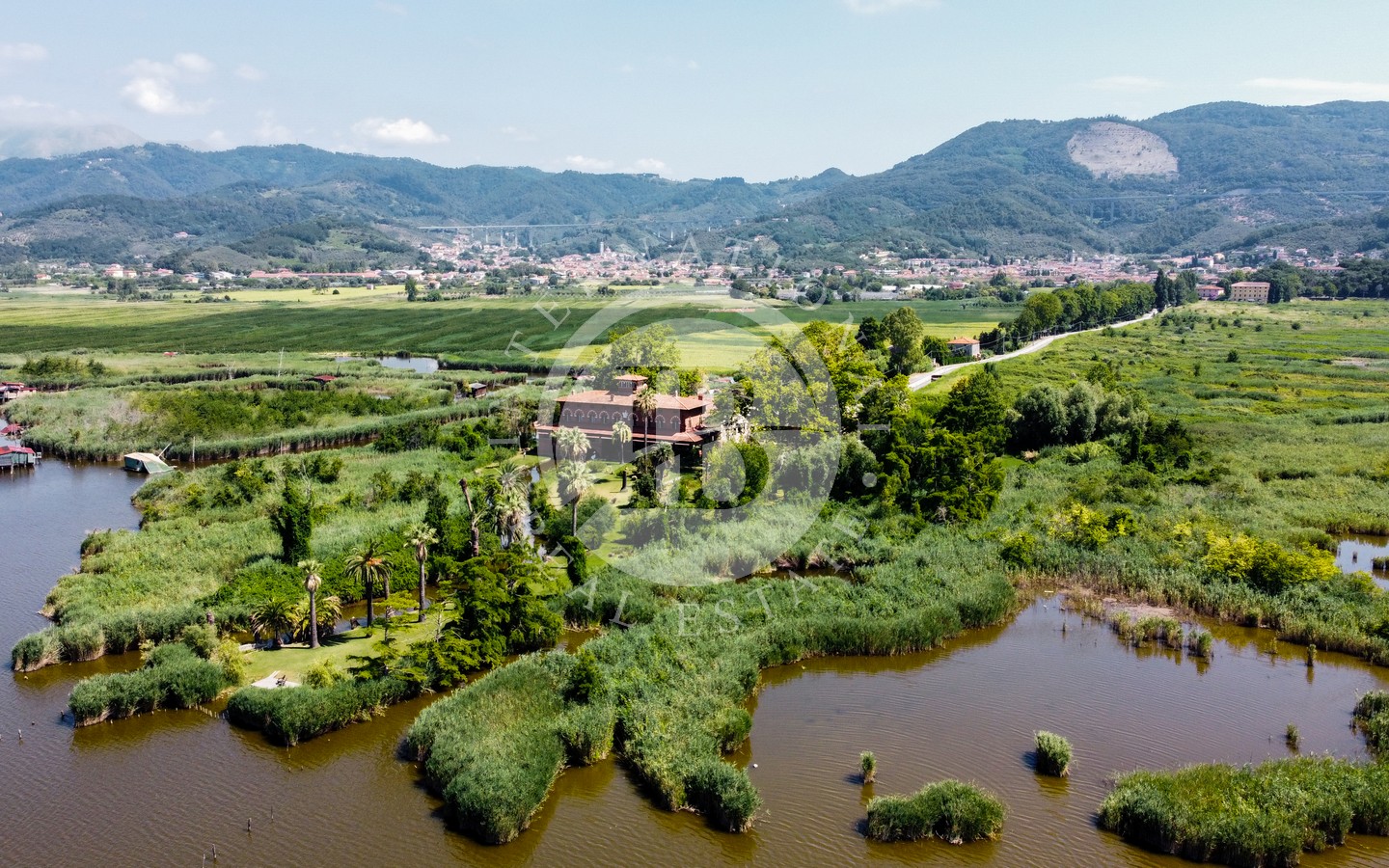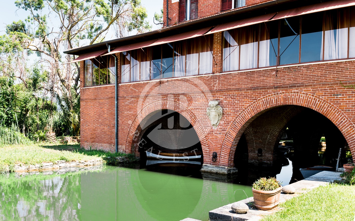 La villa principale in pregevolissimo stile neo-gotico, misura circa 1.200 mq lordi ed è costruita parte sulla terraferma e parte sull’acqua, con un incantevole imbarcadero coperto con soffitti a volte. E’ possibile infatti accedere alle barche direttamente da casa e raggiungere Torre del Lago Puccini o il porto di Viareggio via acqua.