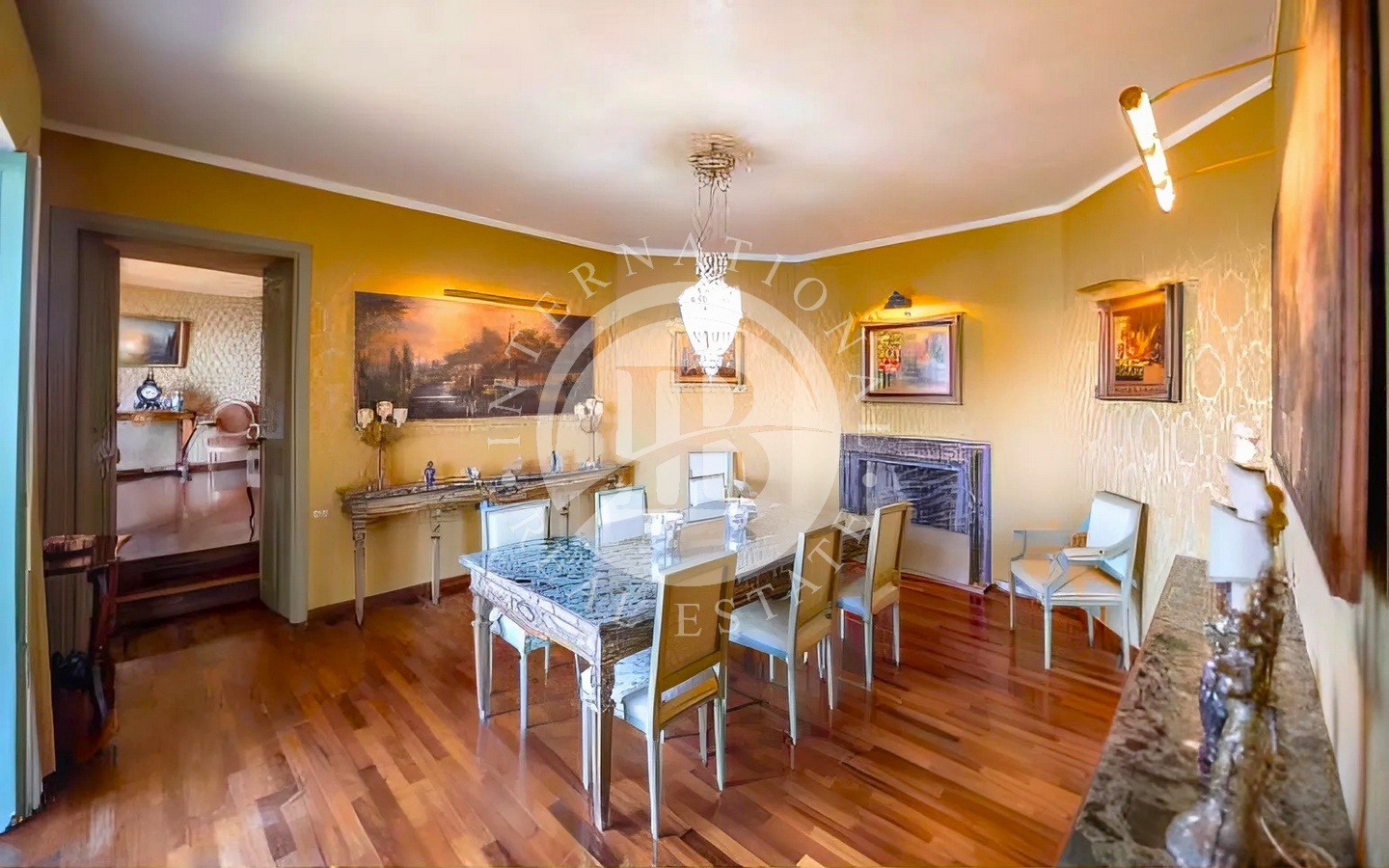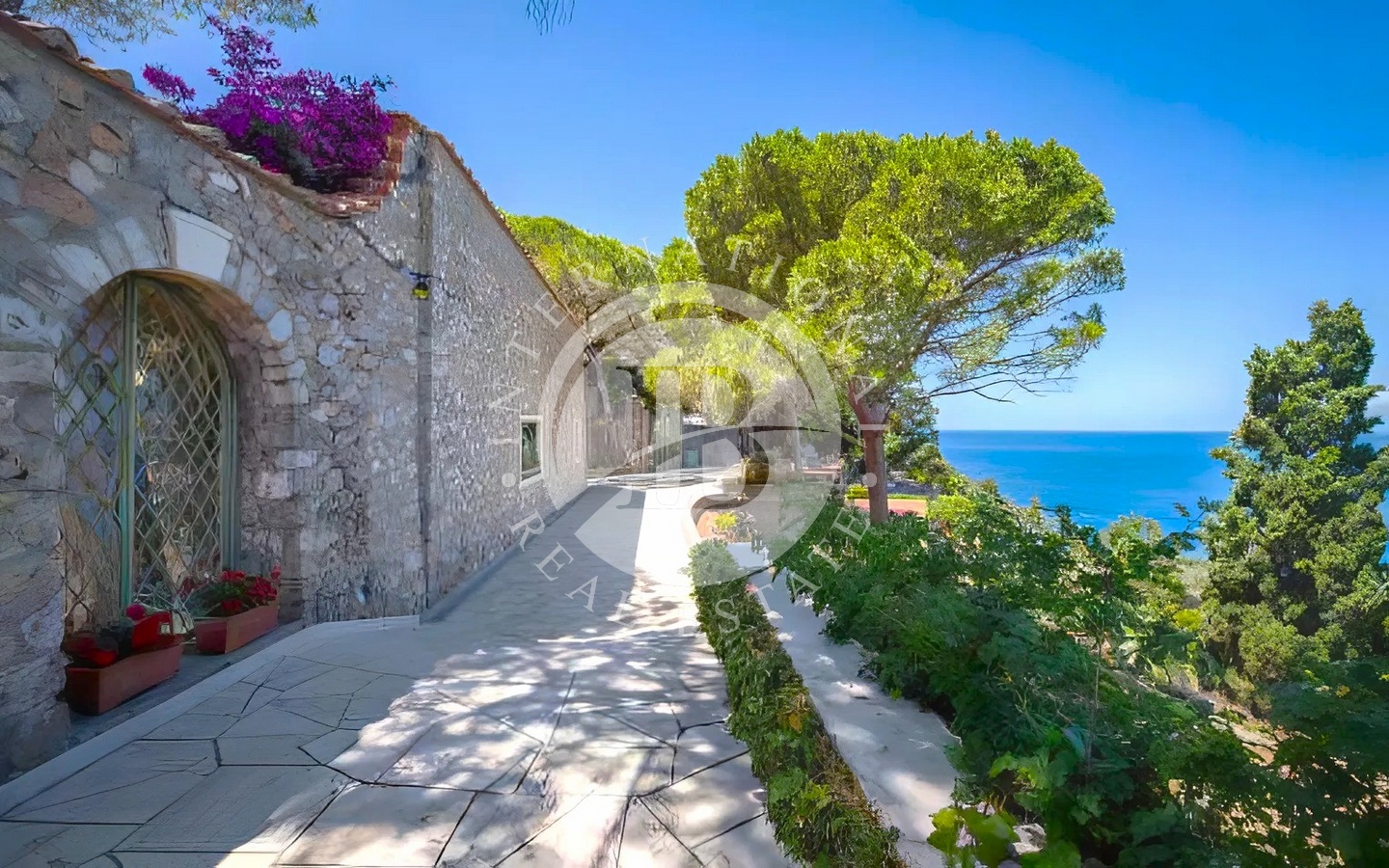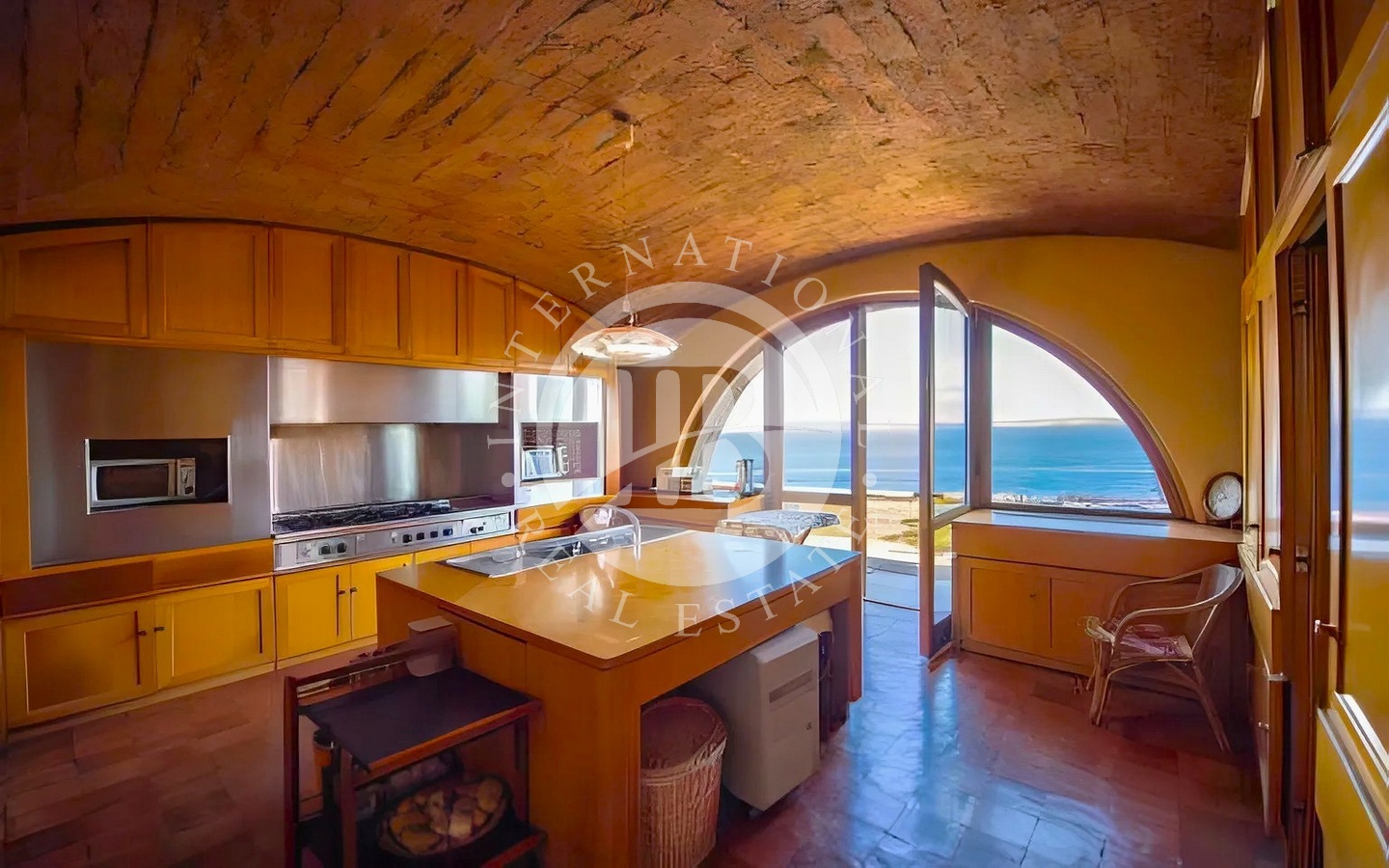 Accedendo dall’ingresso principale, troviamo un elegante salotto con camino in marmo e grandi vetrate affacciate sul mare, una sala da pranzo anch’essa con camino, un tinello e una cucina con soffitti a volta e pavimenti in cotto antico.