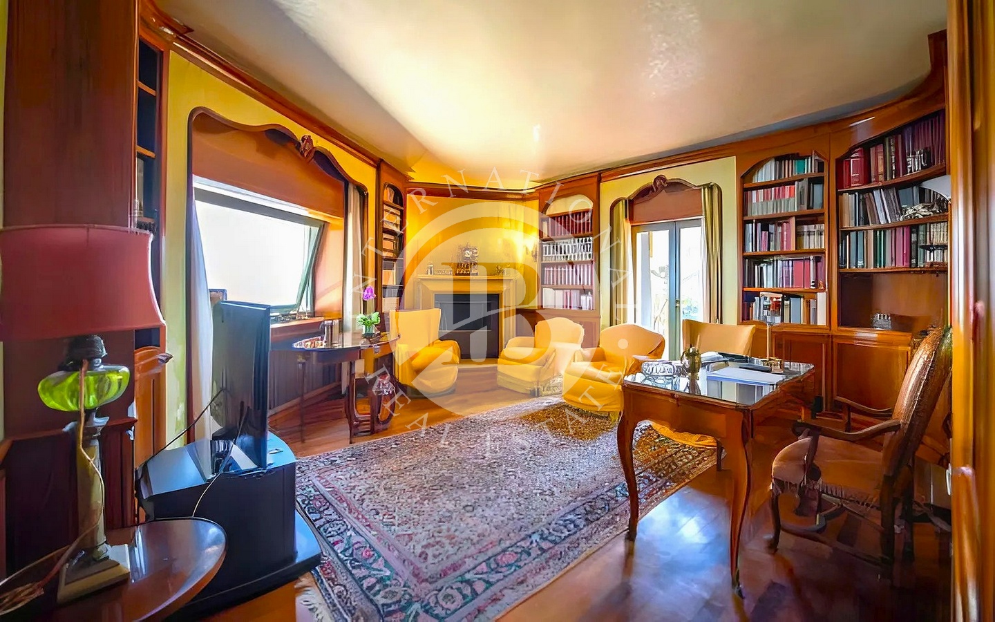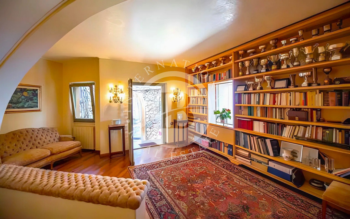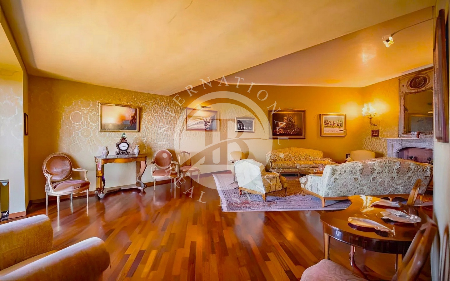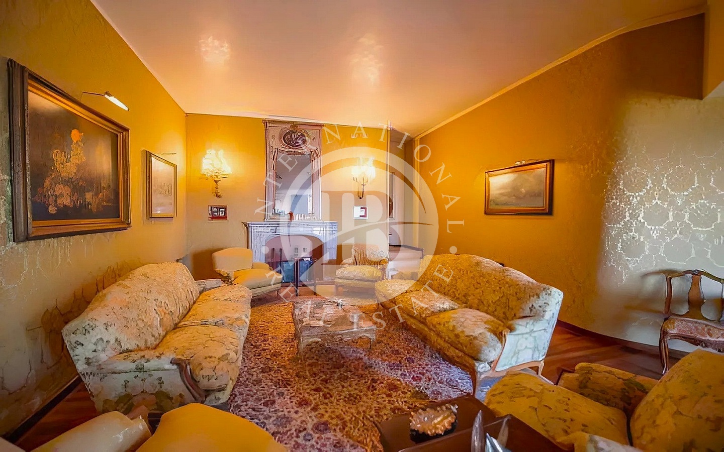 Accedendo dall’ingresso principale, troviamo un elegante salotto con camino in marmo e grandi vetrate affacciate sul mare, una sala da pranzo anch’essa con camino, un tinello e una cucina con soffitti a volta e pavimenti in cotto antico.